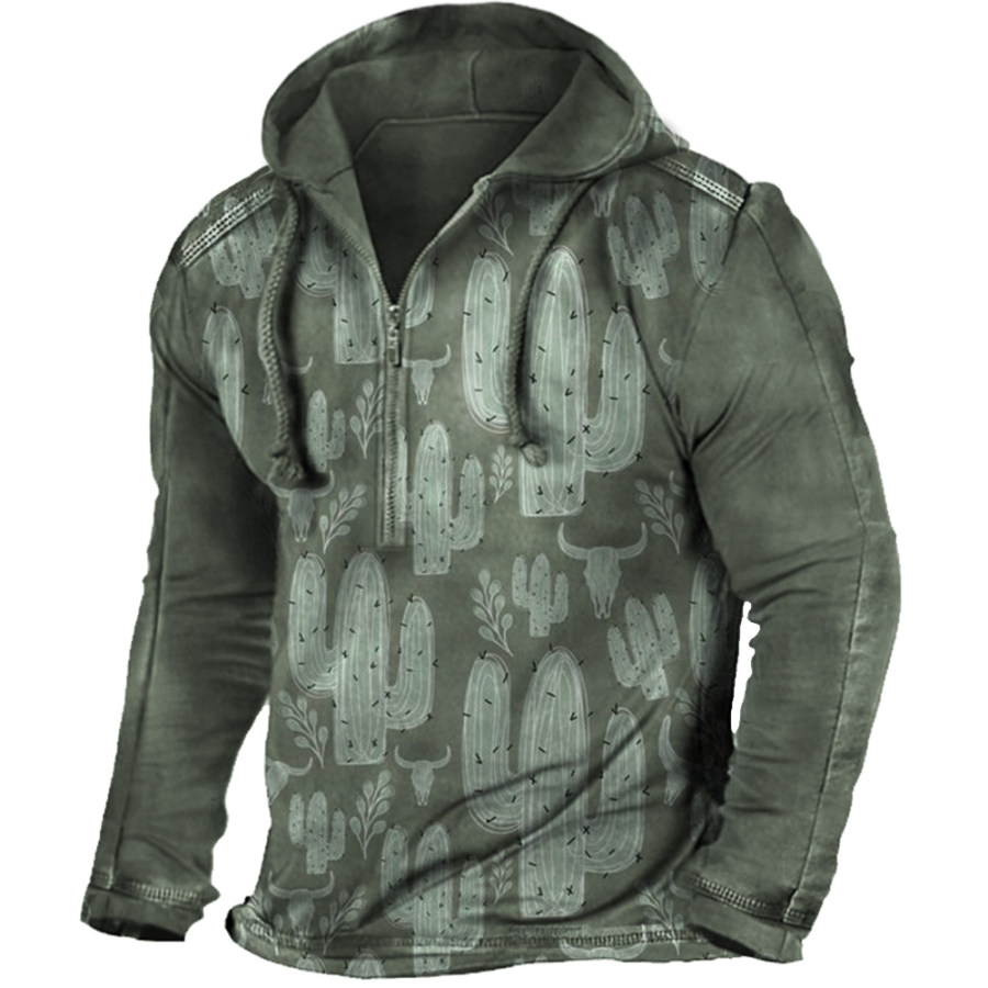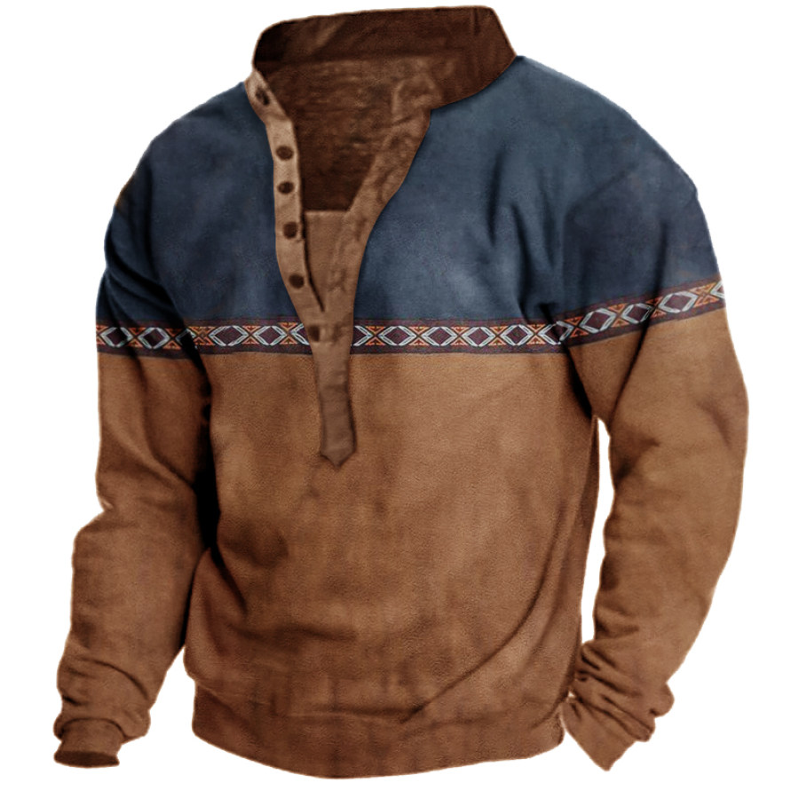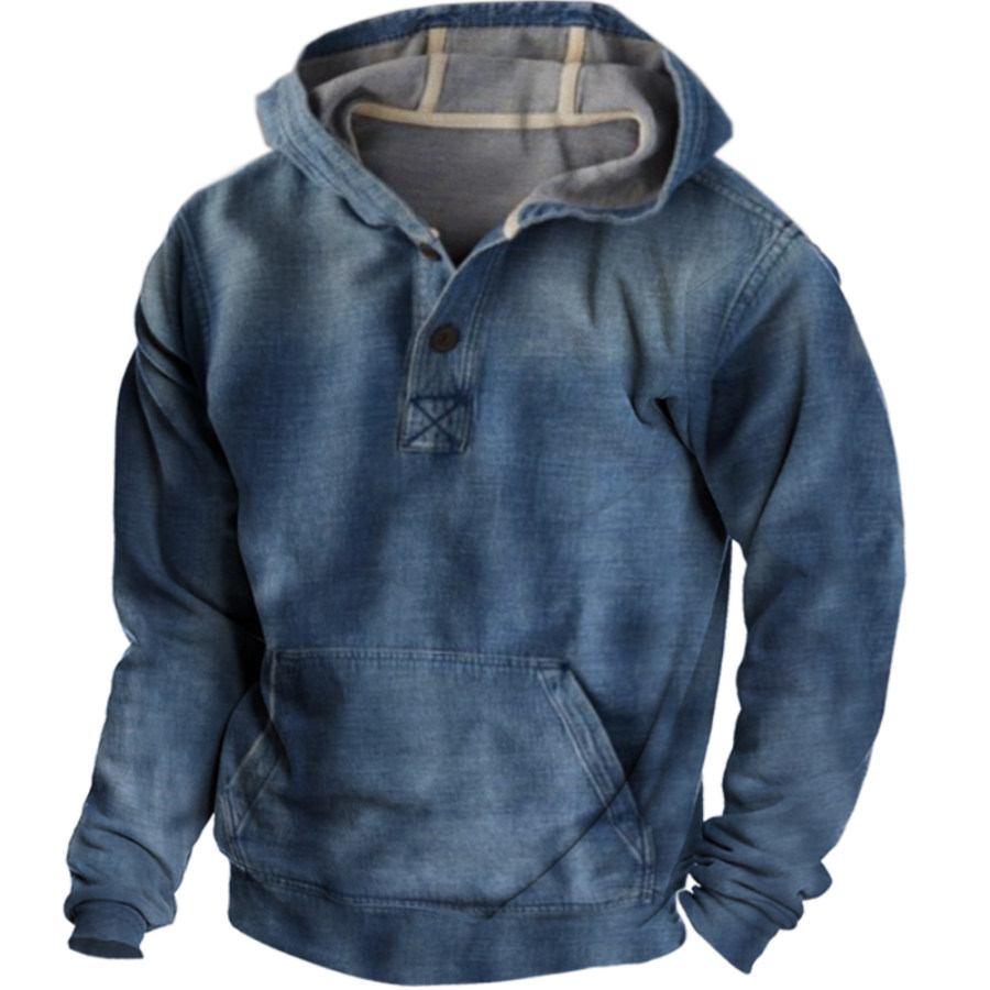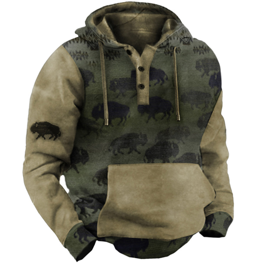 Men's Western Retro Print Outdoor Thickened Henley Collar Hoodie |