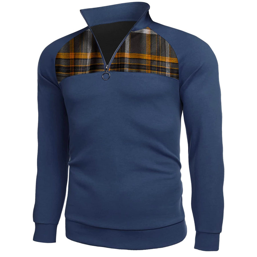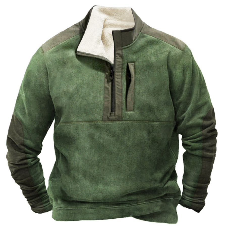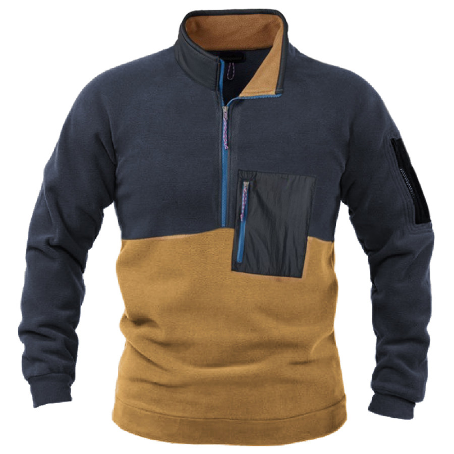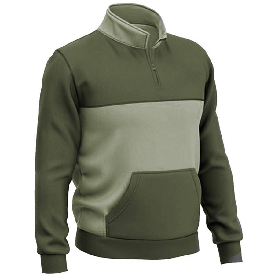 Men's Retro Large Pocket Zipper Half Turtleneck Patchwork Color Sweatshirt |