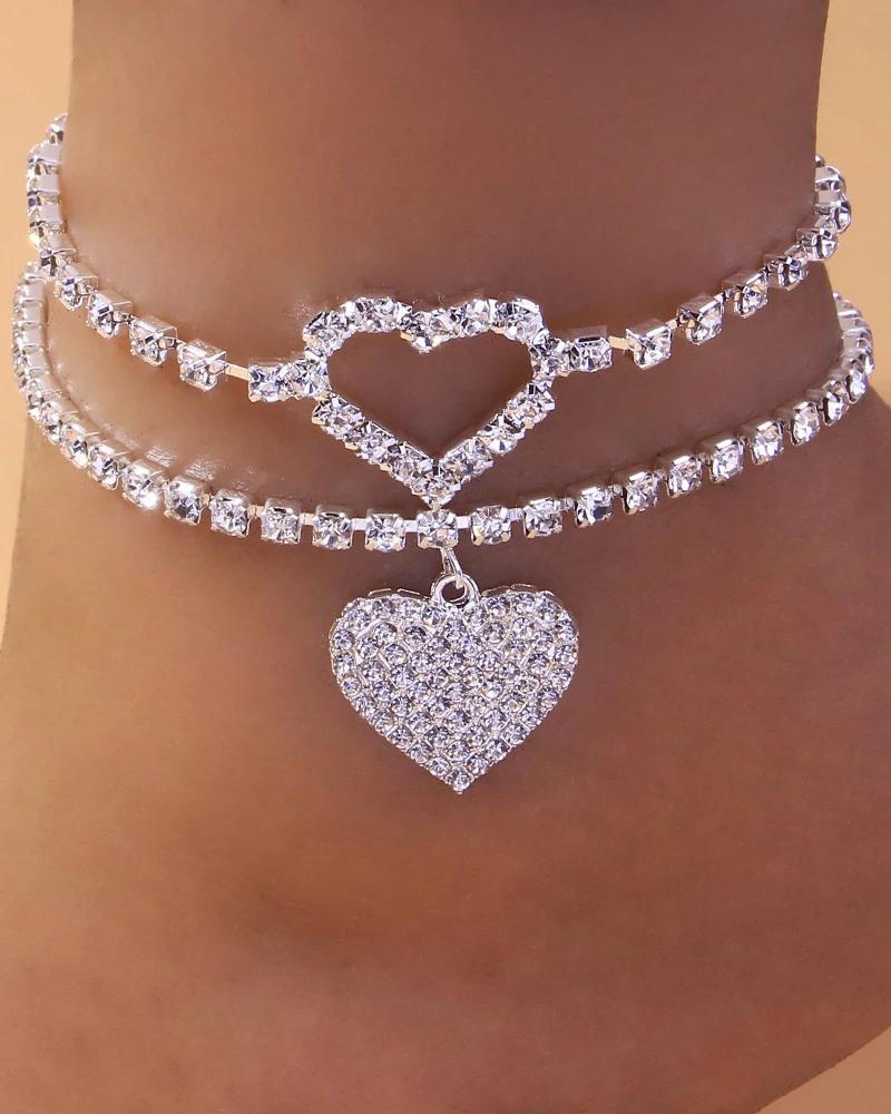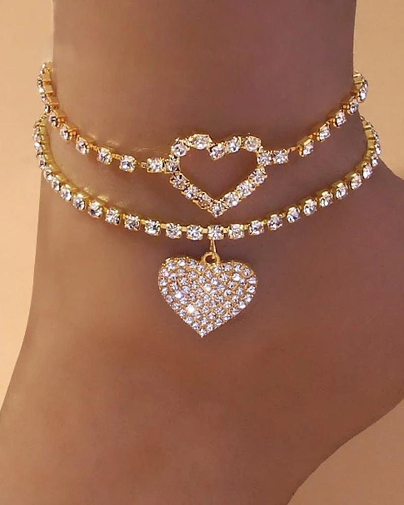 2pcs Rhinestone Heart Pattern Stackable Anklet Set |