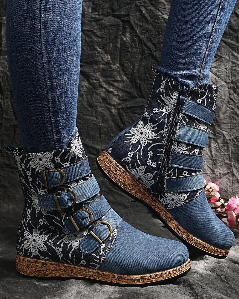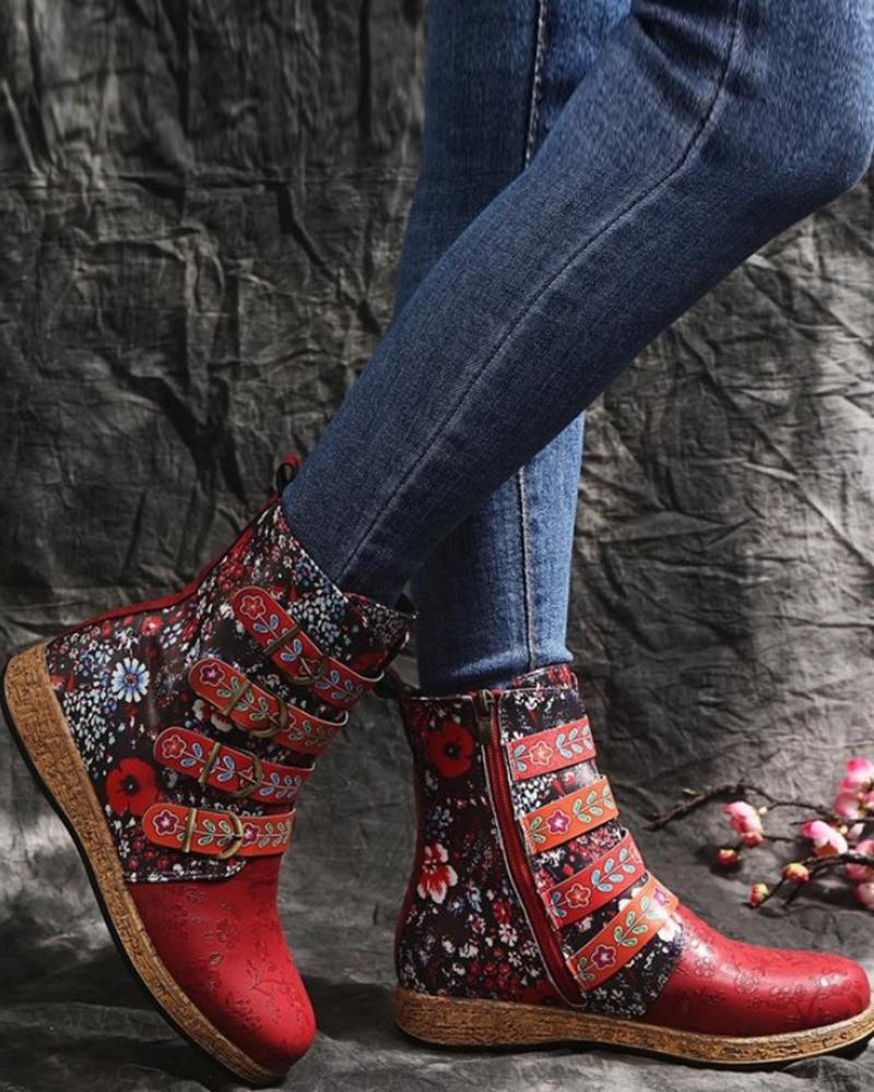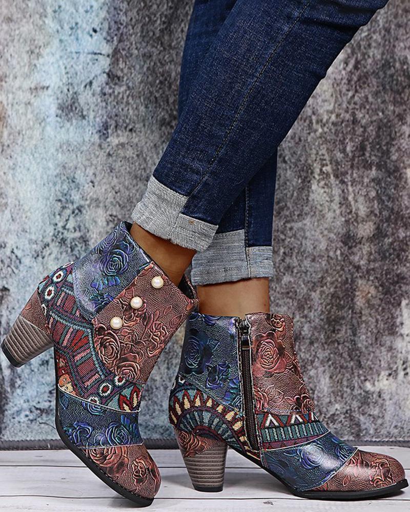 Floral Pattern Colorblock Ankle Boots |
