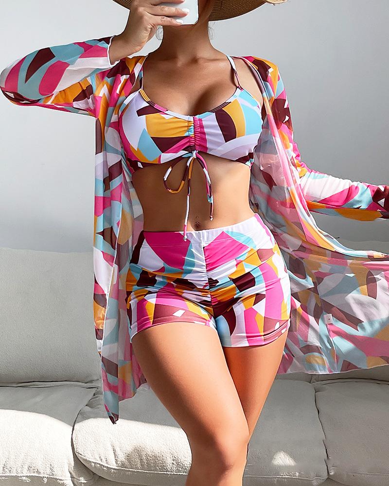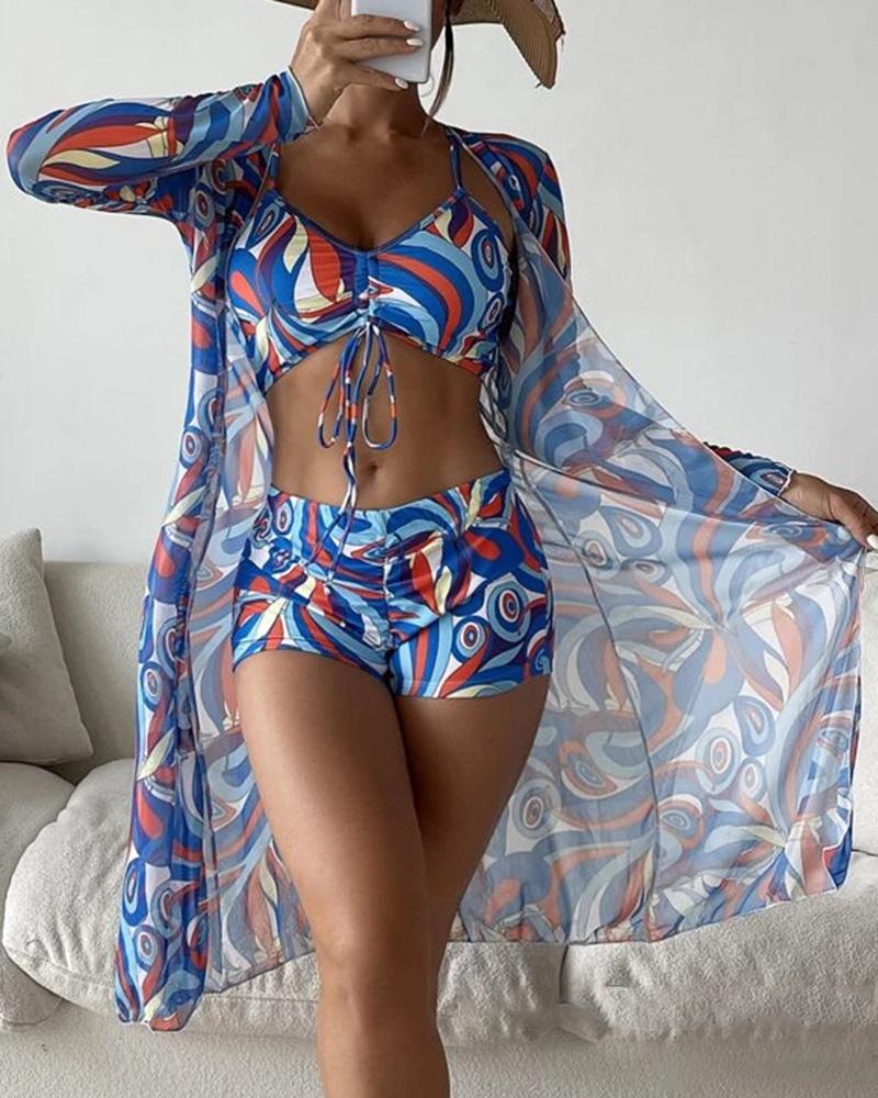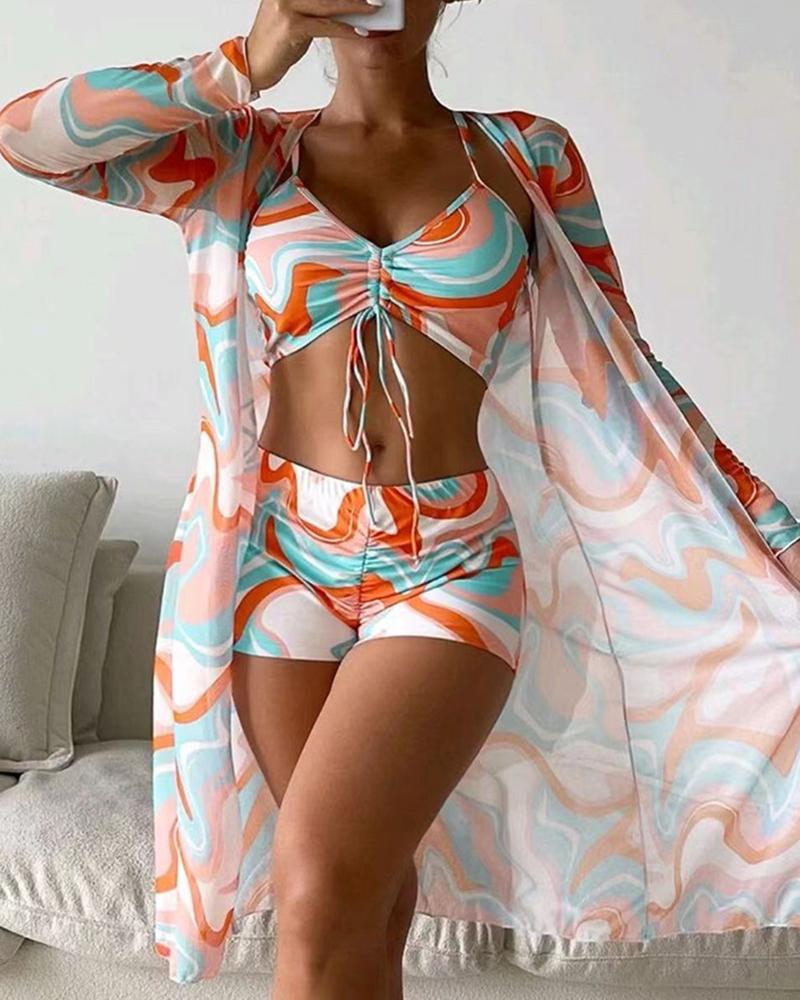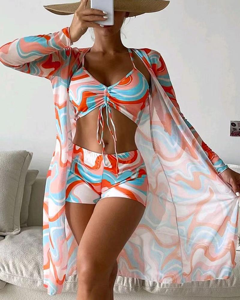 3PCS Abstract Print Drawstring Bikini Set With Cover Up |