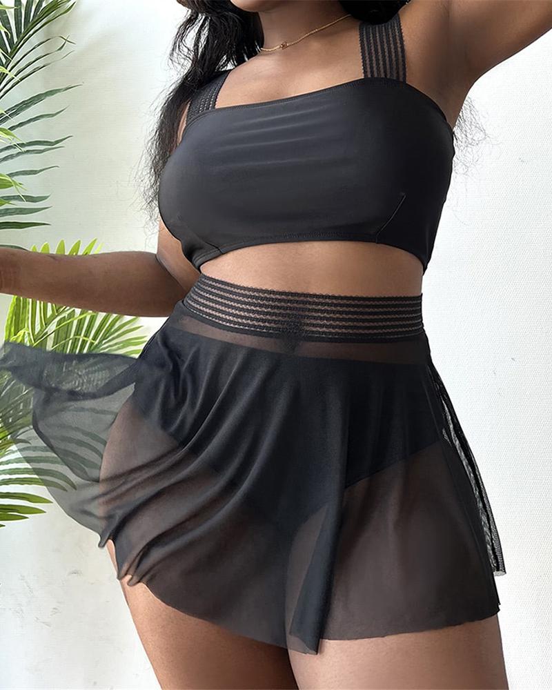 3PCS Plus Size Square Neck Bikini Set With Cover Up Skirt |