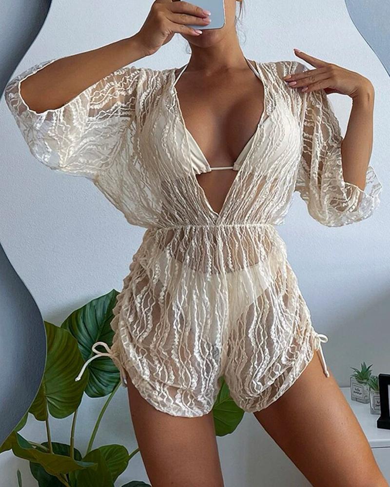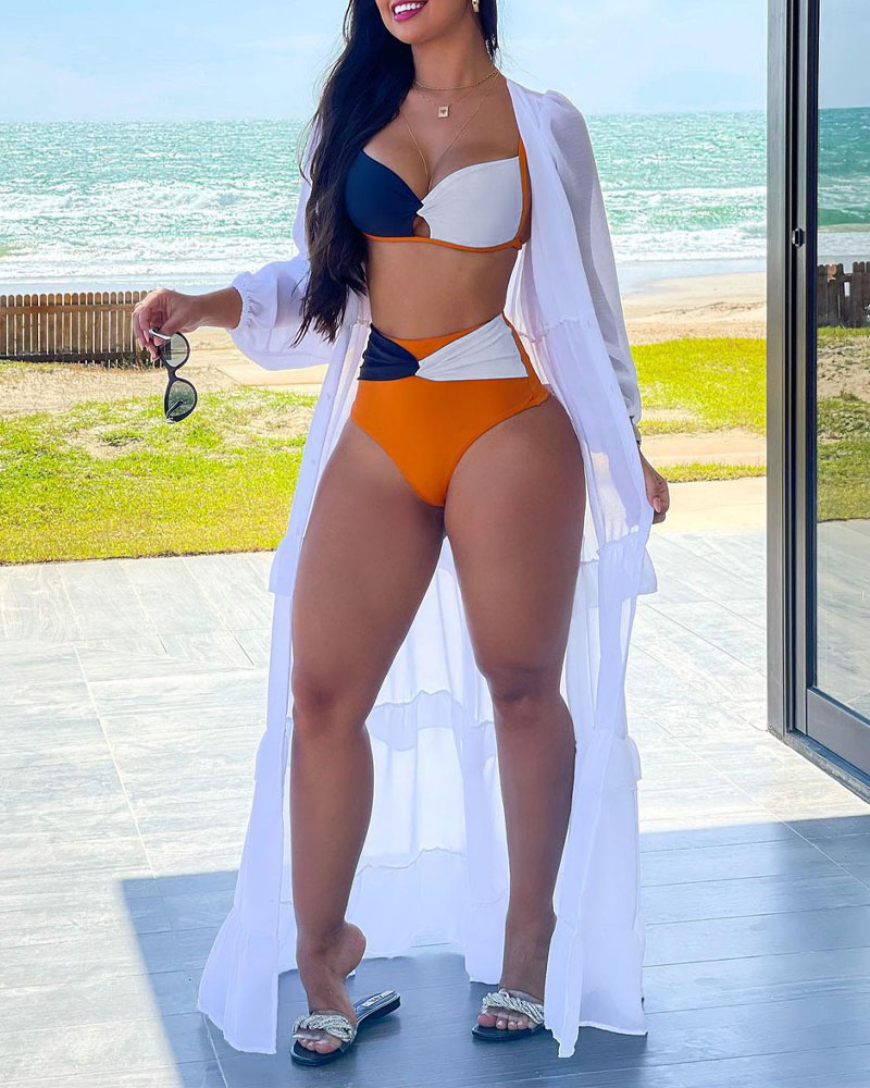 3PCS Halter Bikini Set With Sheer Mesh Cover Up |