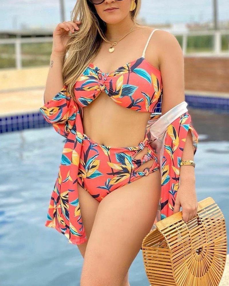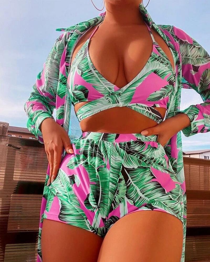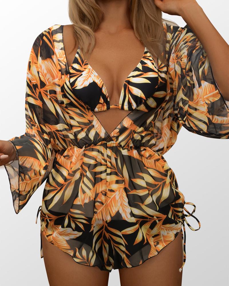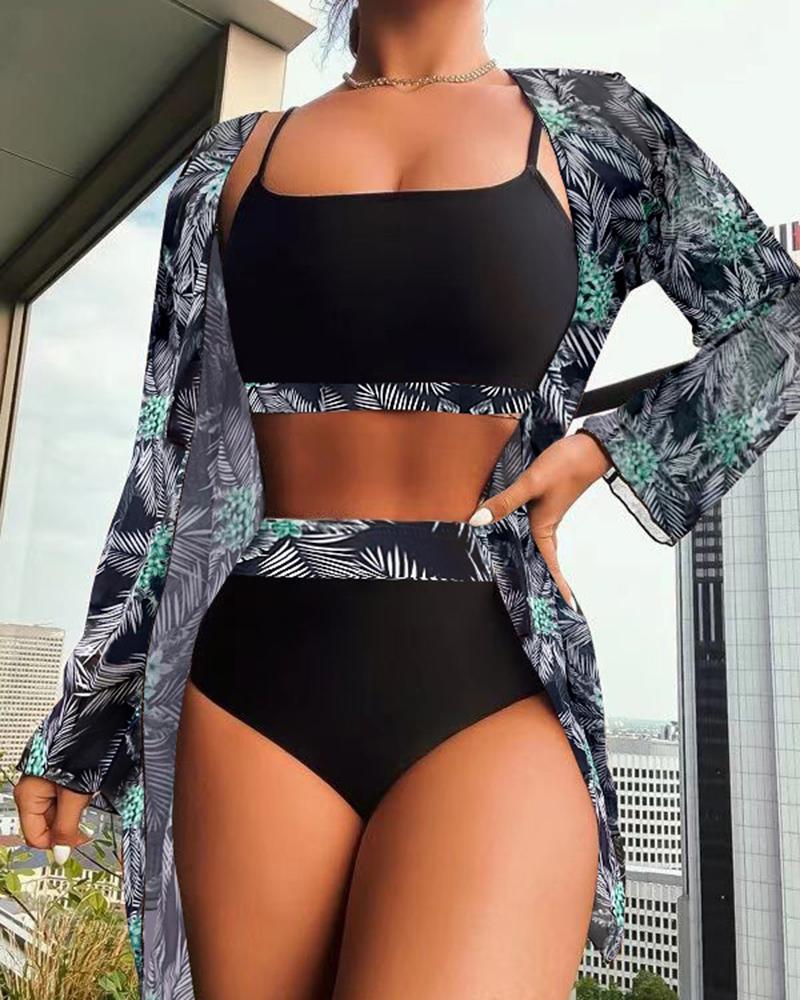 3PCS Palm Tree Print Bikini Set With Cover Up |