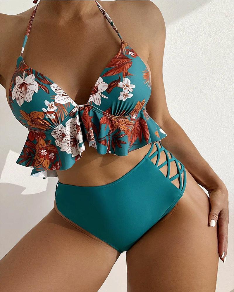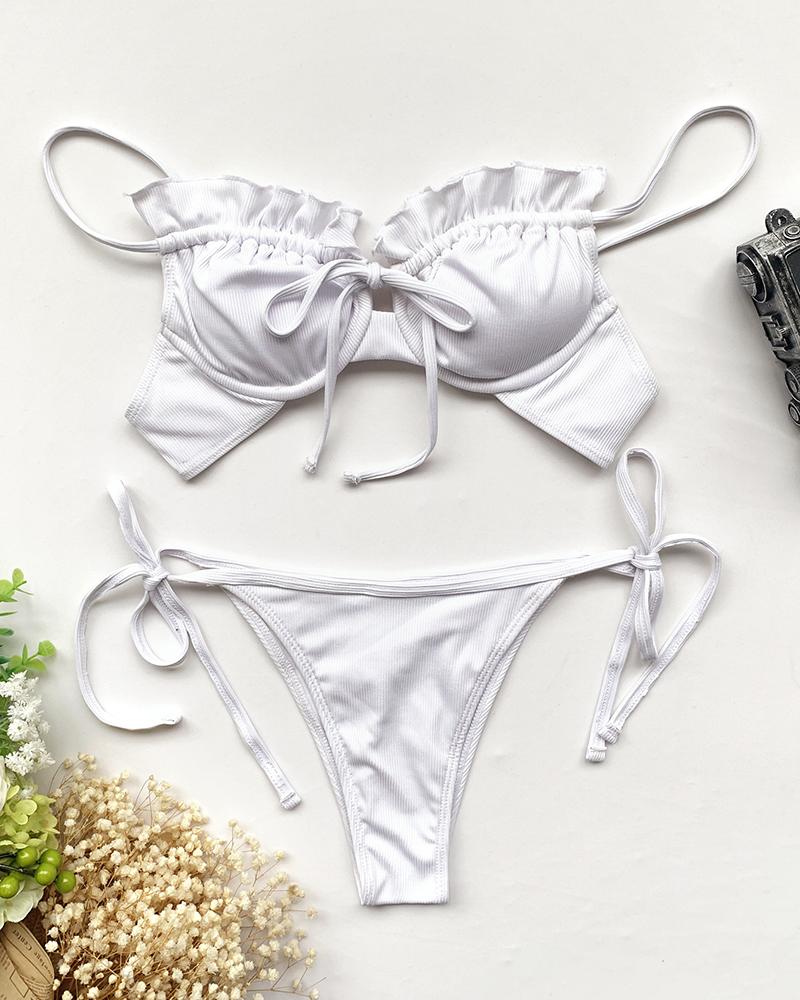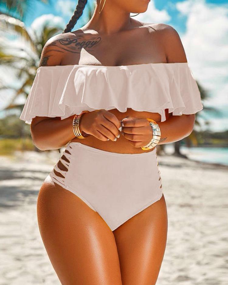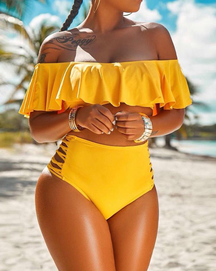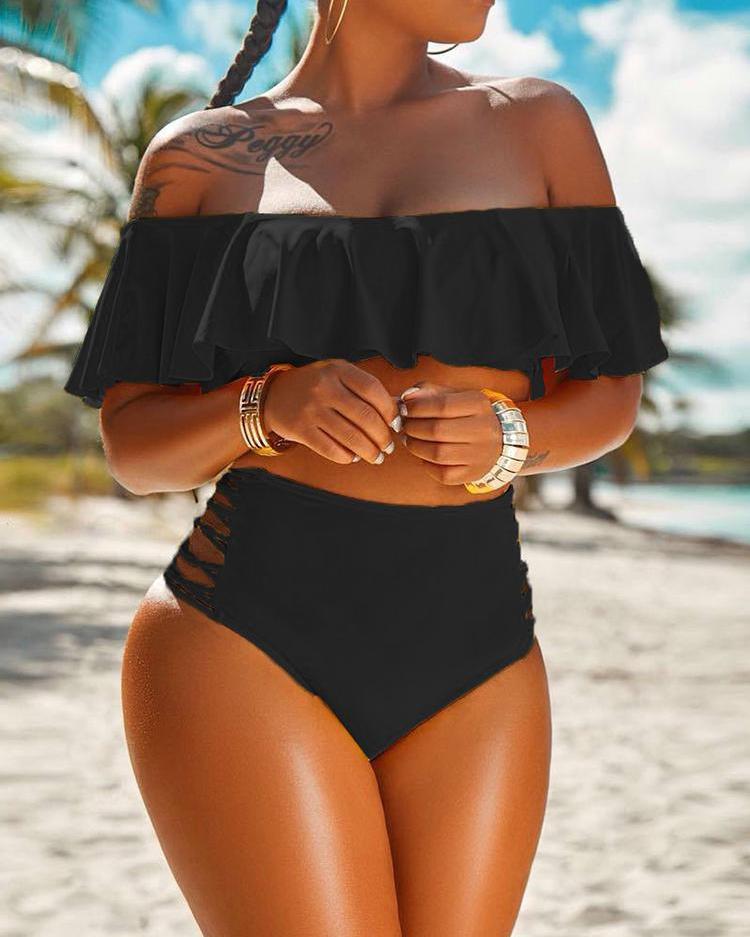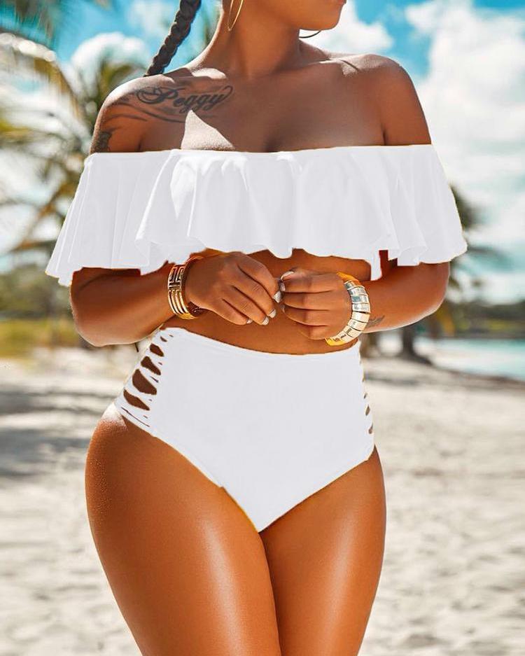 Off Shoulder Ruffles Lace-up Cutout Bikini Set |