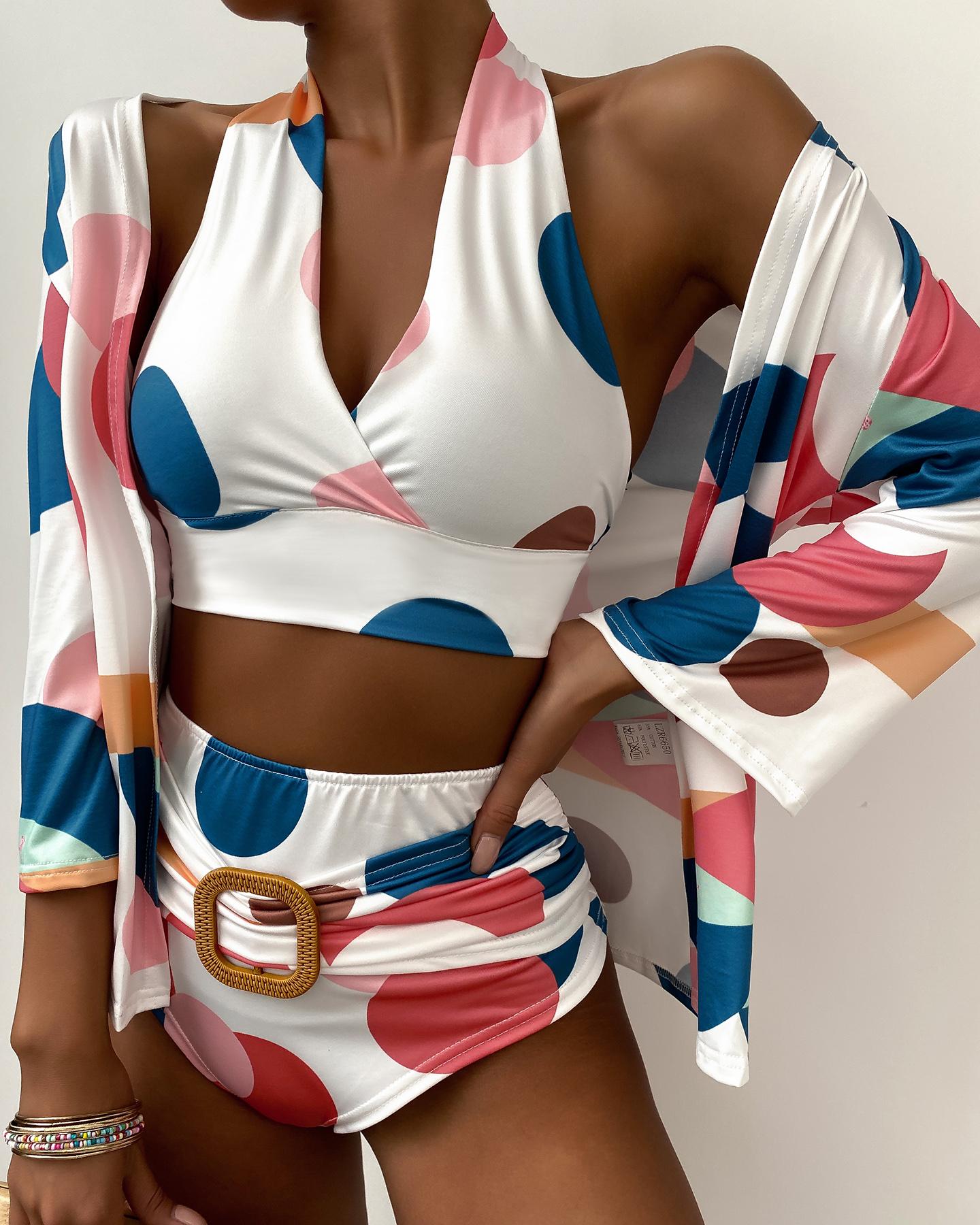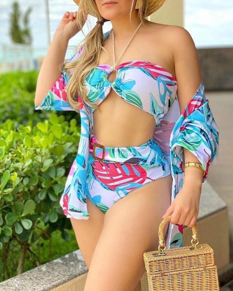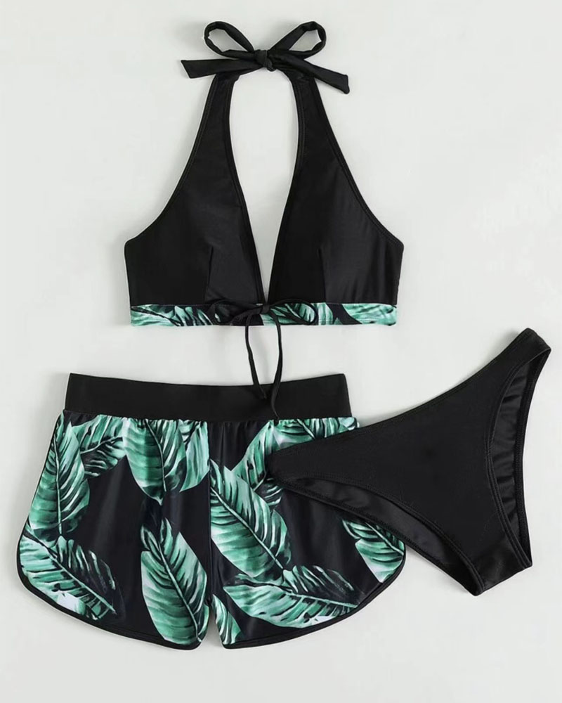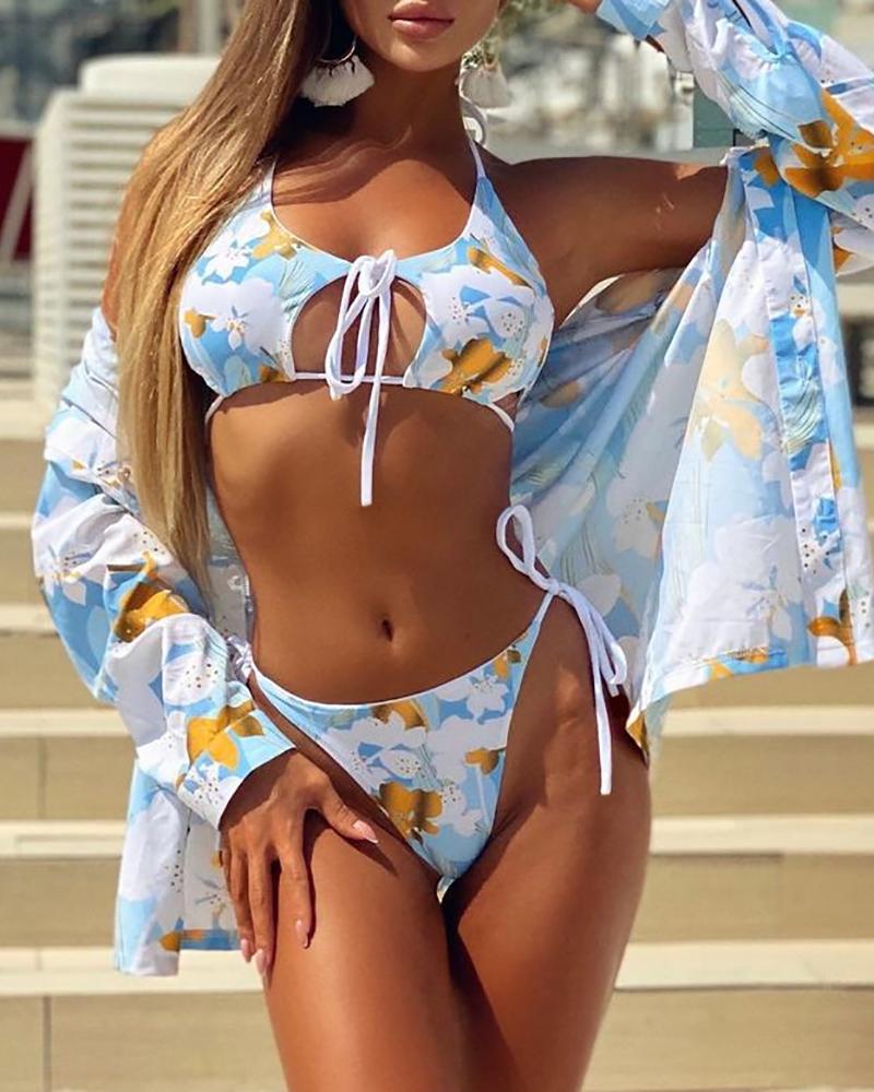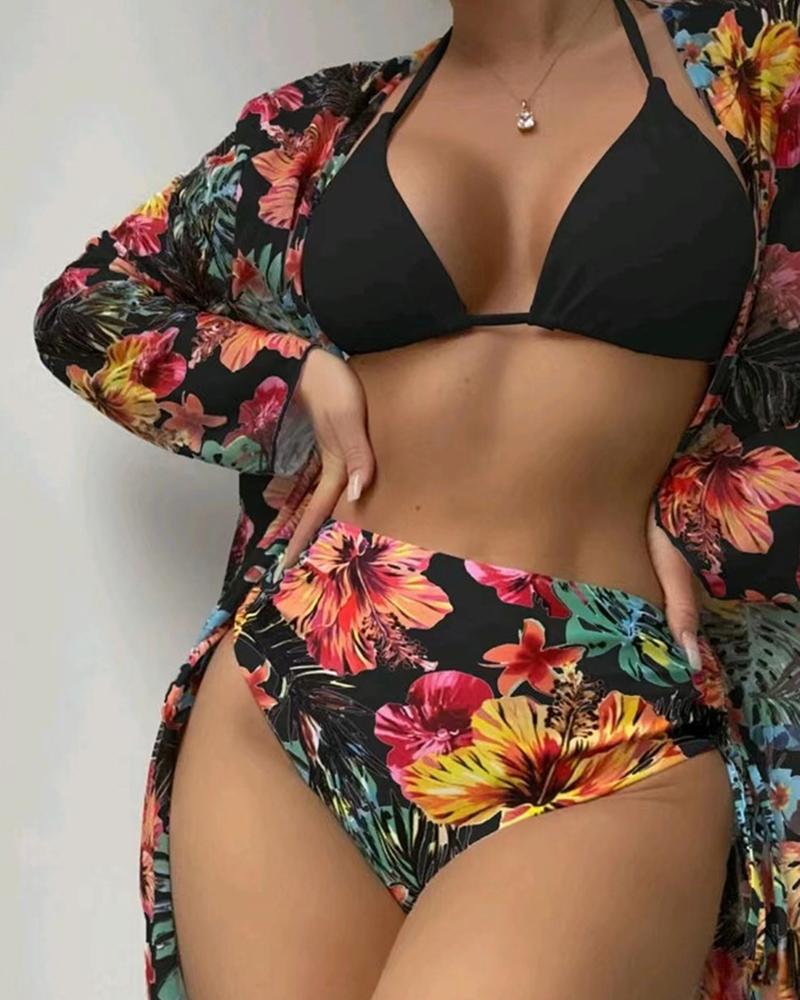 3PCS Halter Bikini Set With Floral Decor Cover Up |