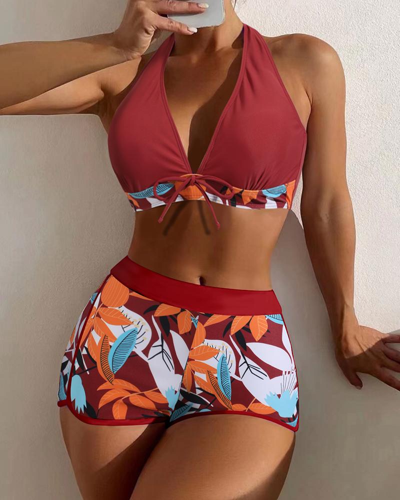 Tropical Print Halter Tied Detail Bikini Set |