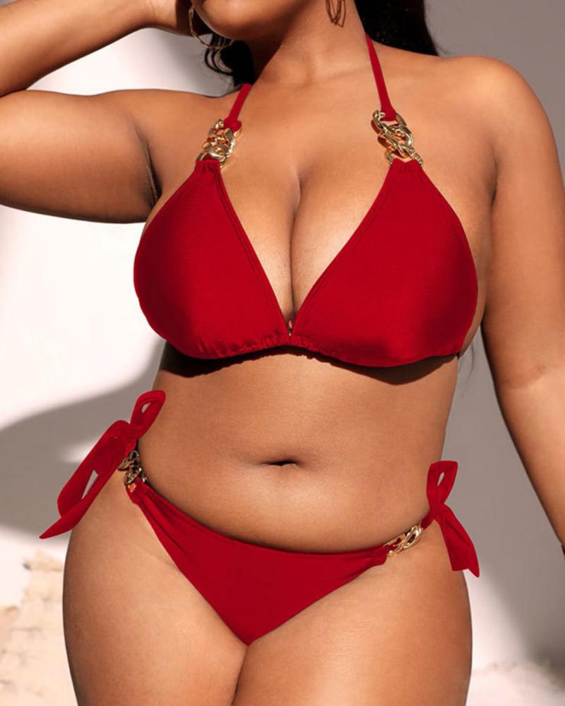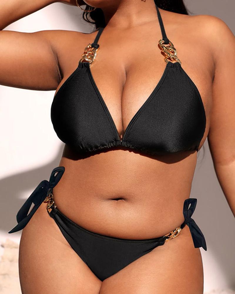 Plus Size Halter Chain Strap Tied Detail Bikini Set |