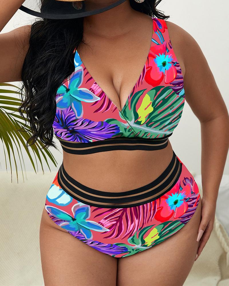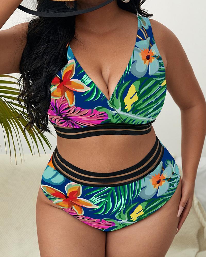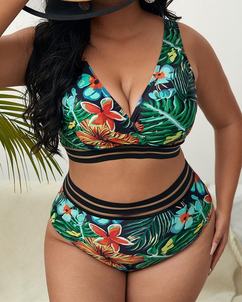 Plus Size Tropical Print Contrast Mesh Bikini Set |