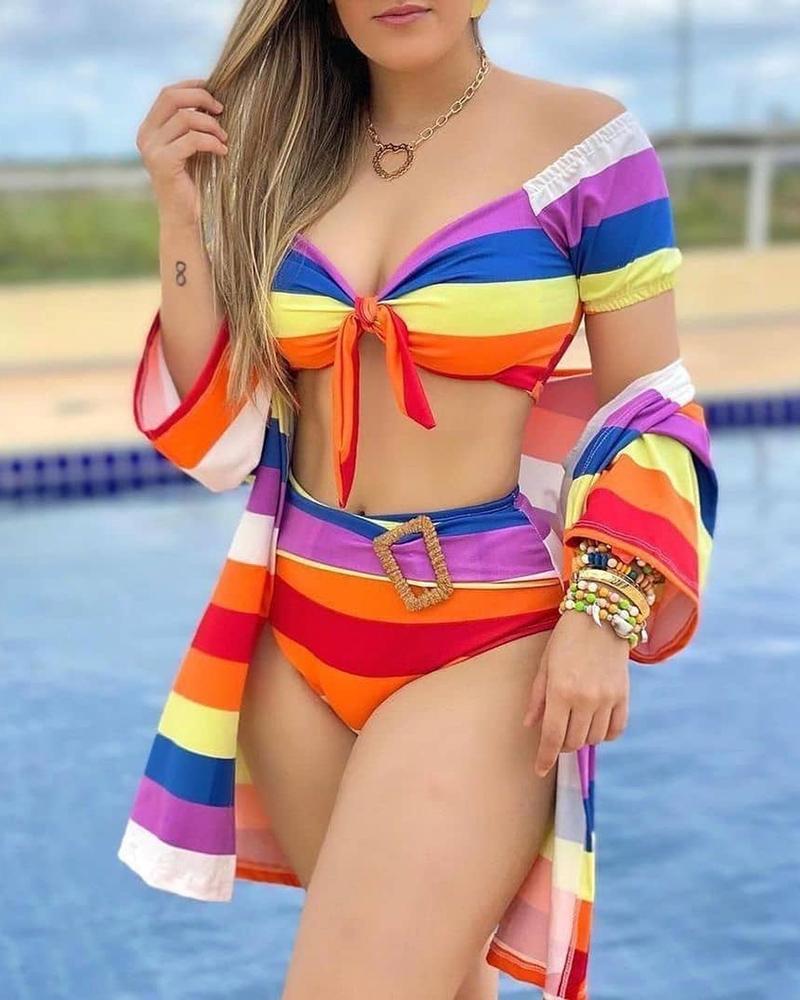 4PCS Halter Bikini Set With Bell Sleeve Crop Top & Skirt Set |