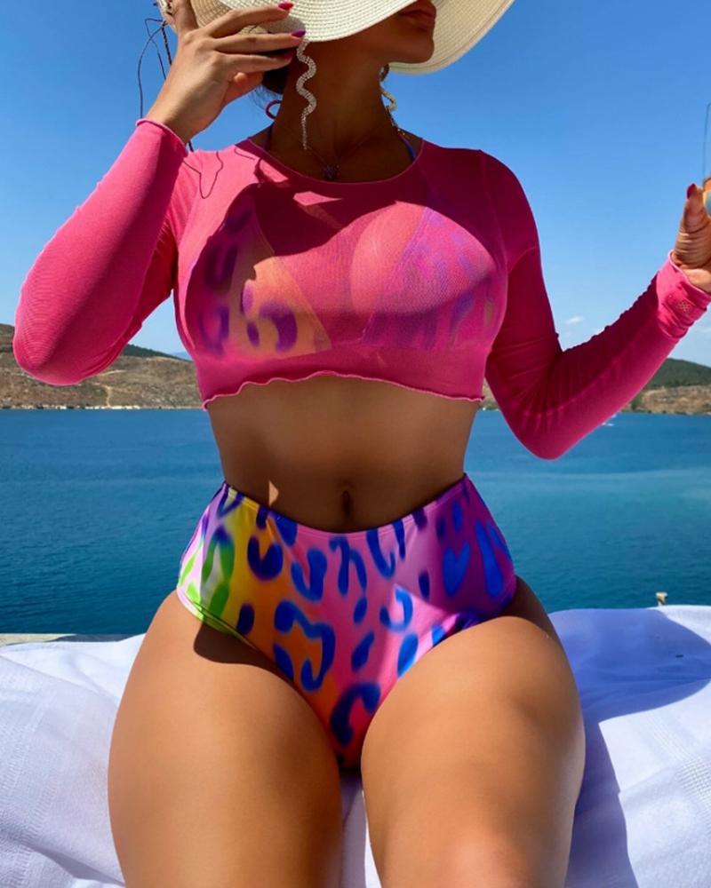 3PCS Leopard Print Halter Bikini Set With Sheer Mesh Crop Top |