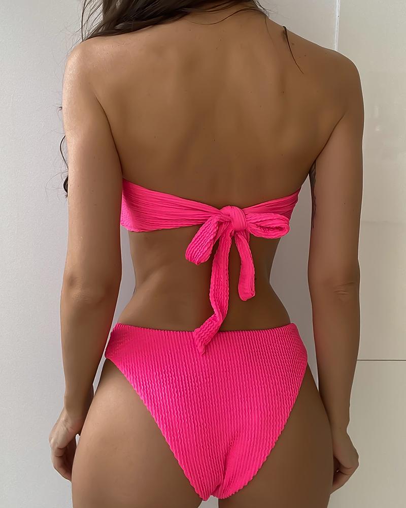 Textured Ruched Shirred Tied Detail Bandeau Bikini Set |