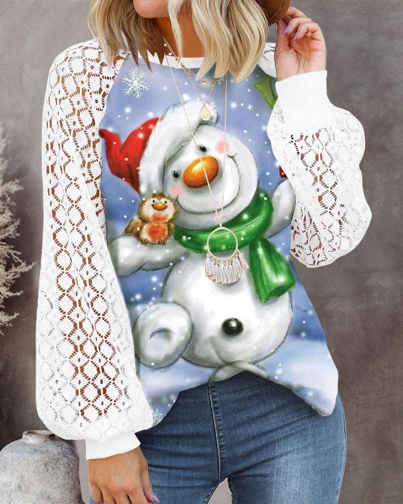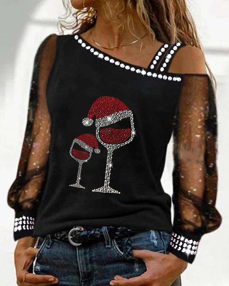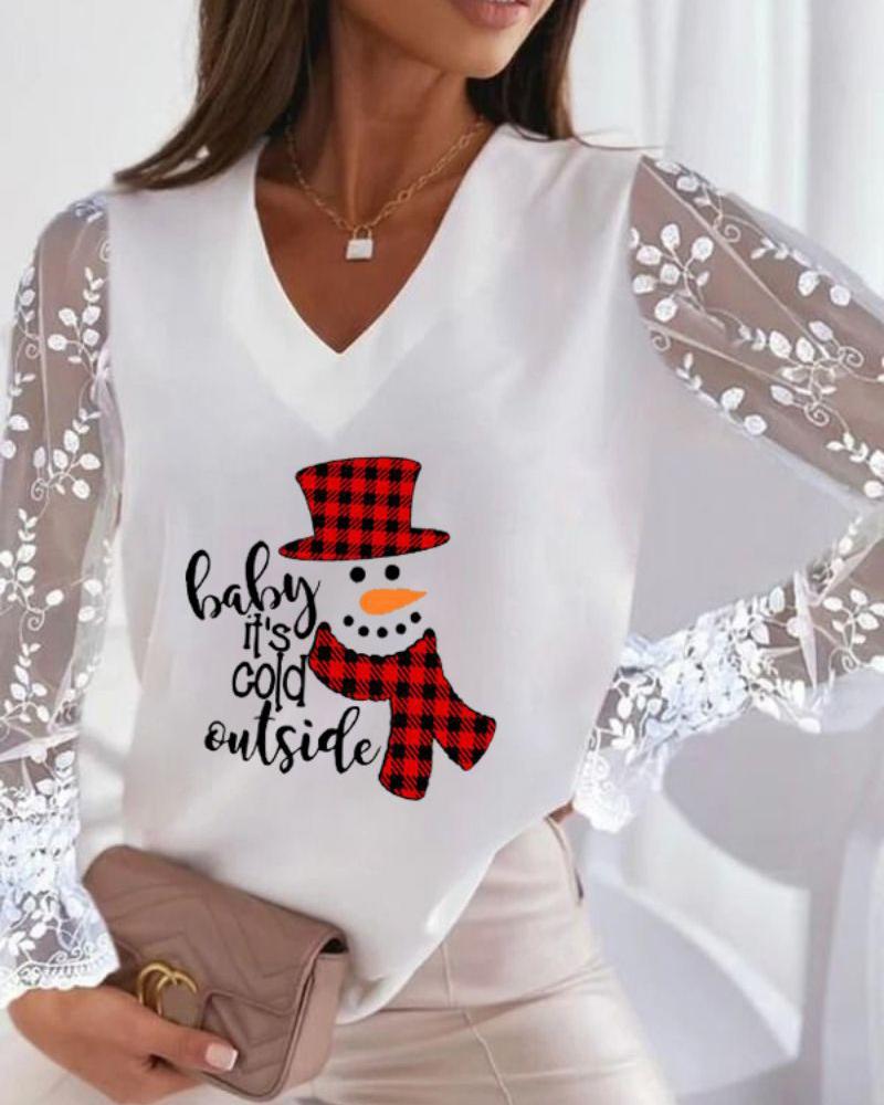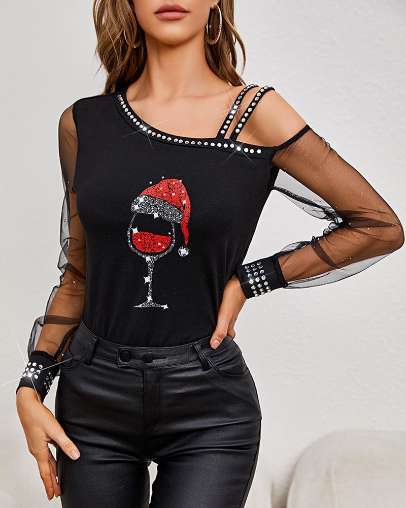 Christmas Wine Glasses Snowman Print Sheer Mesh Lace Top |