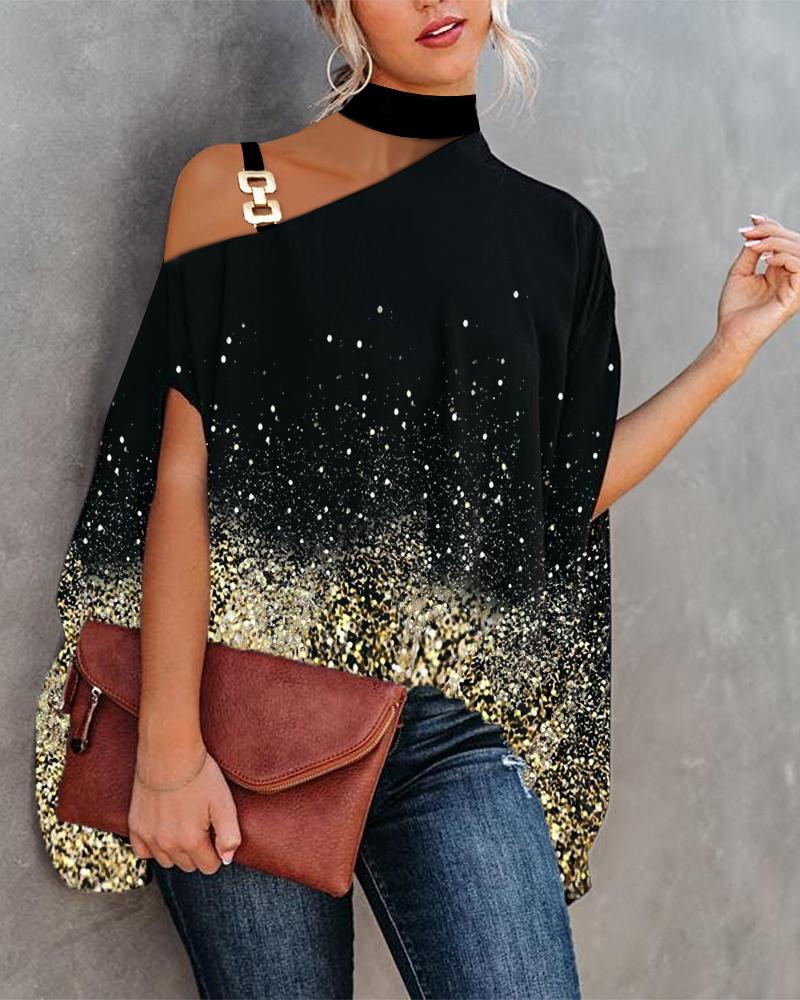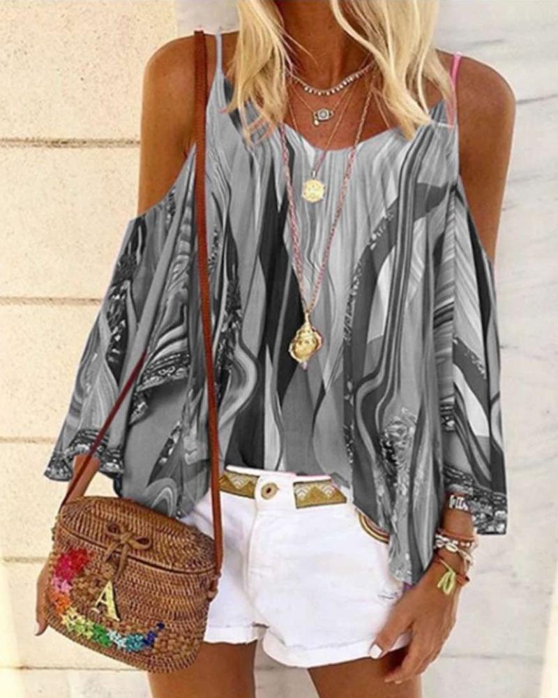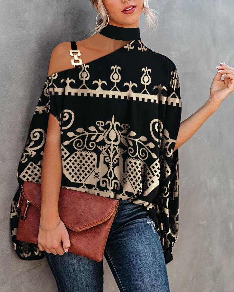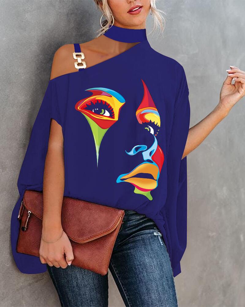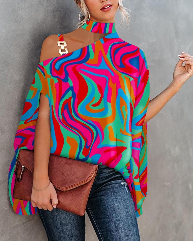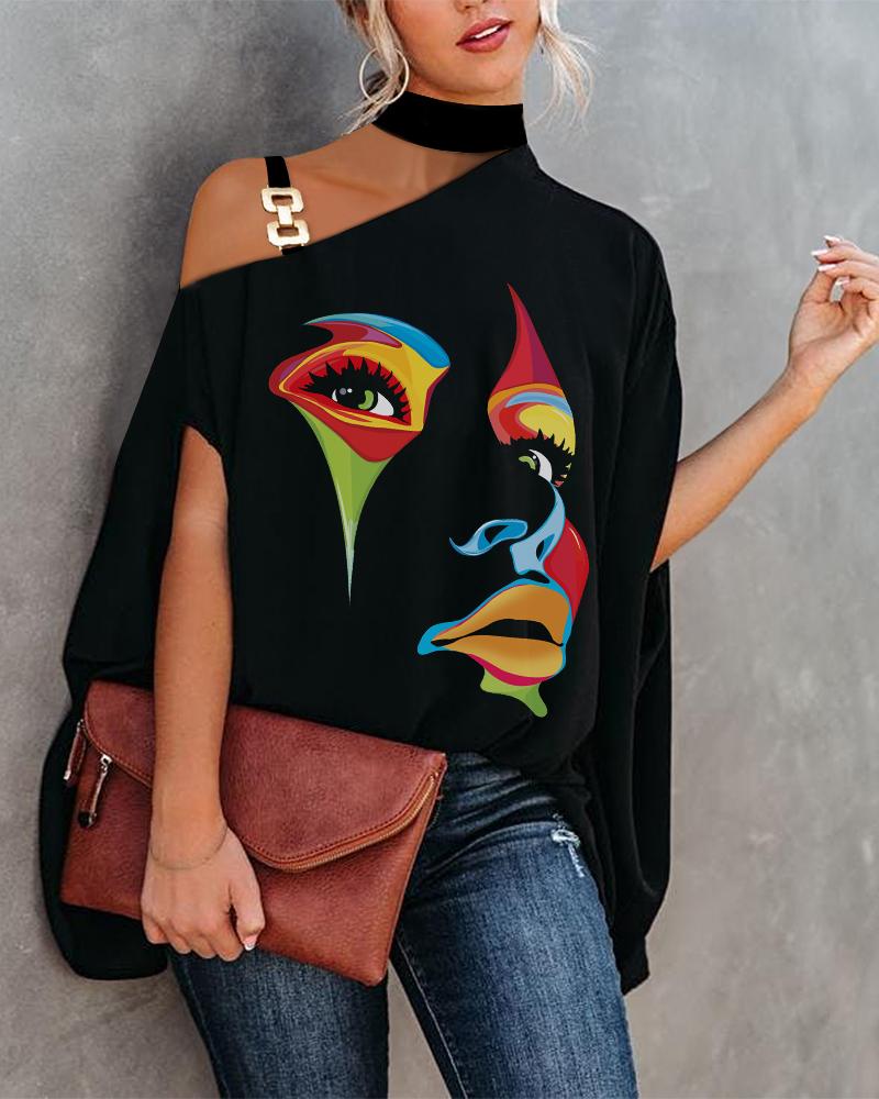 Abstract Figure Print Chain Strap Cold Shoulder Top |