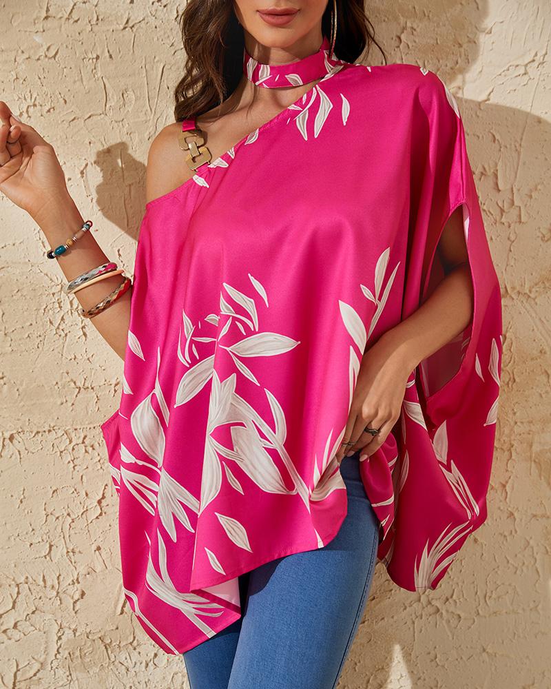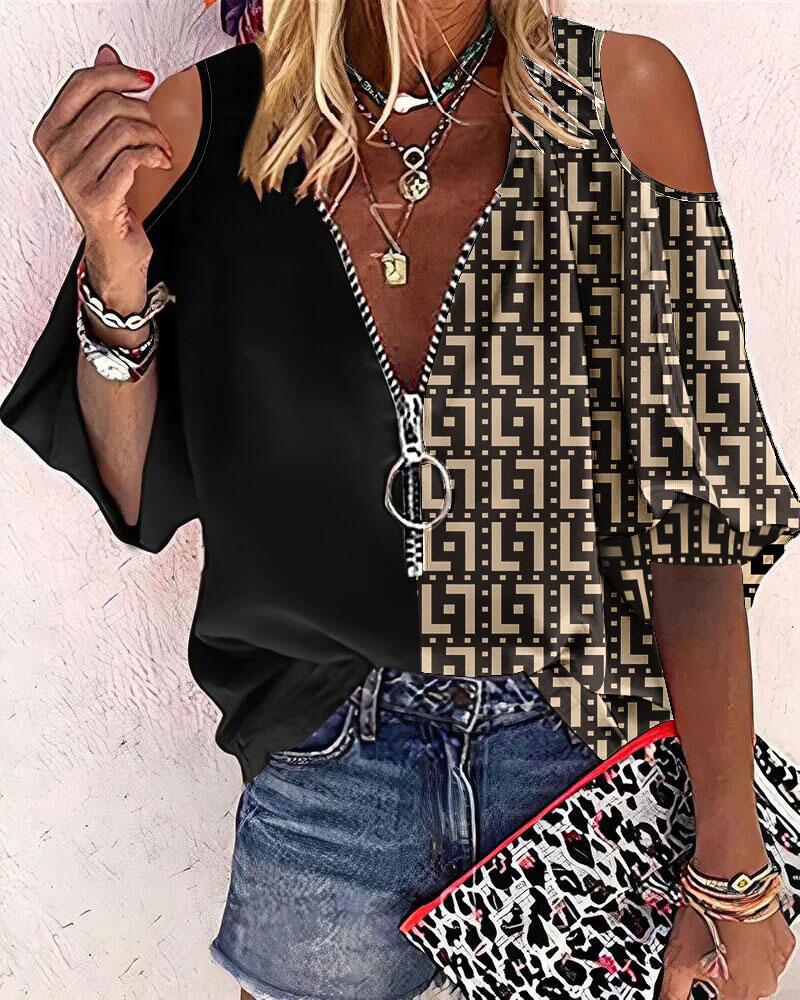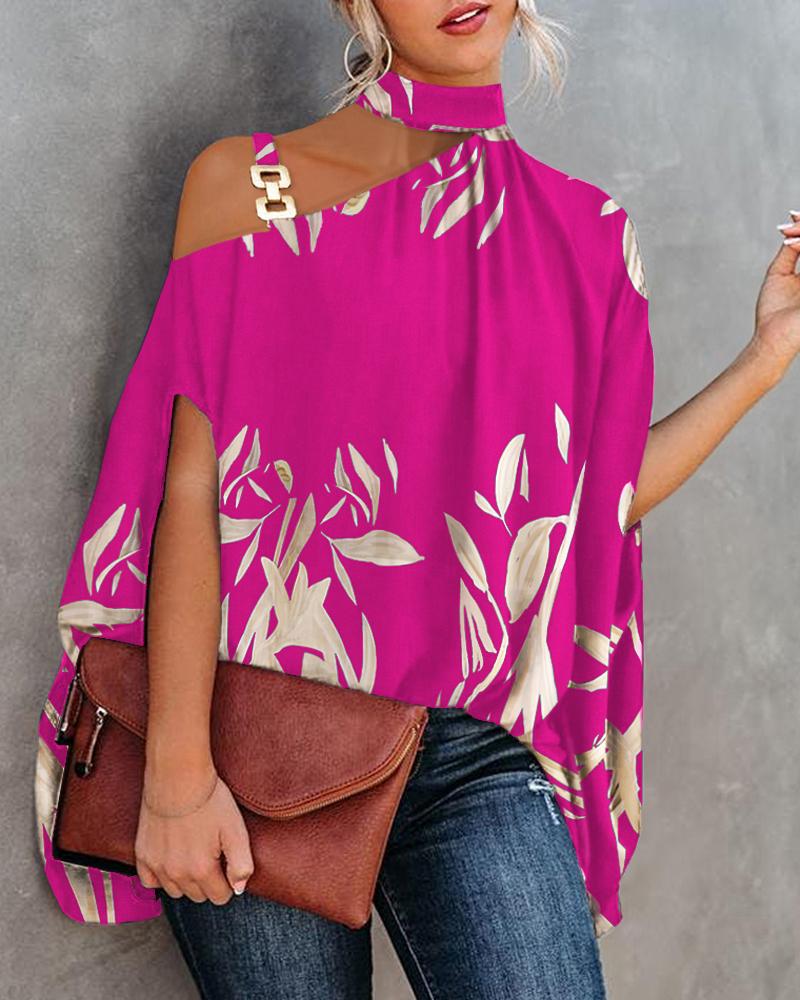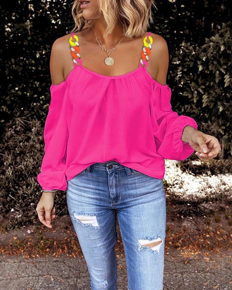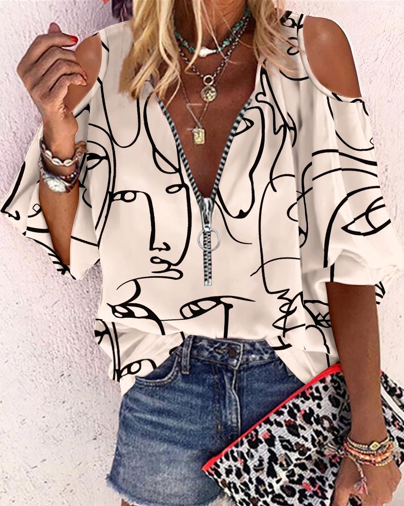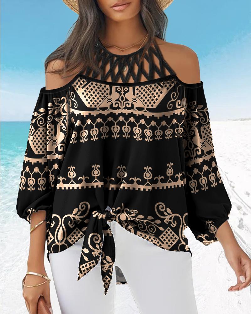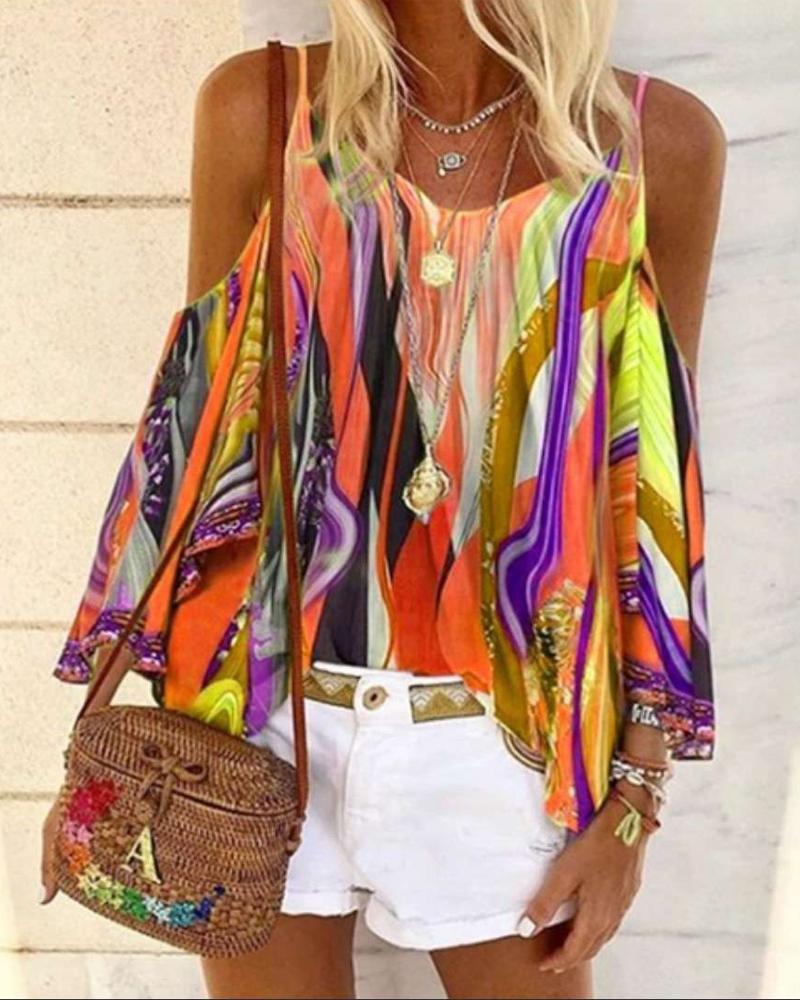 Abstract Figure Print Chain Strap Cold Shoulder Top |