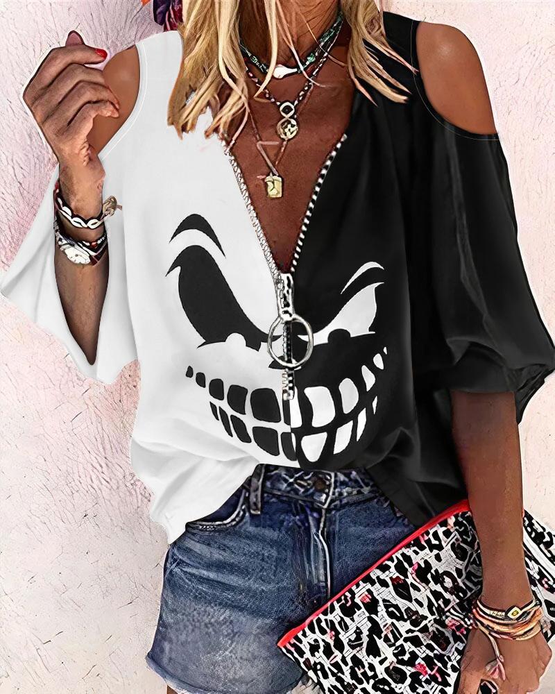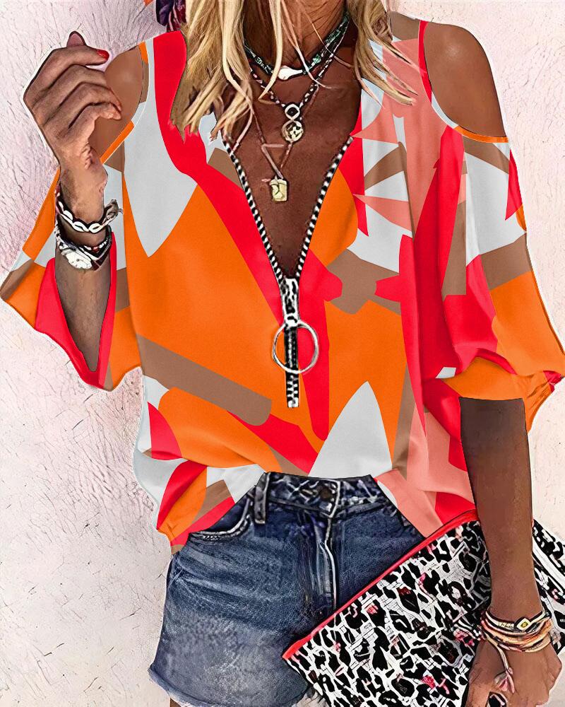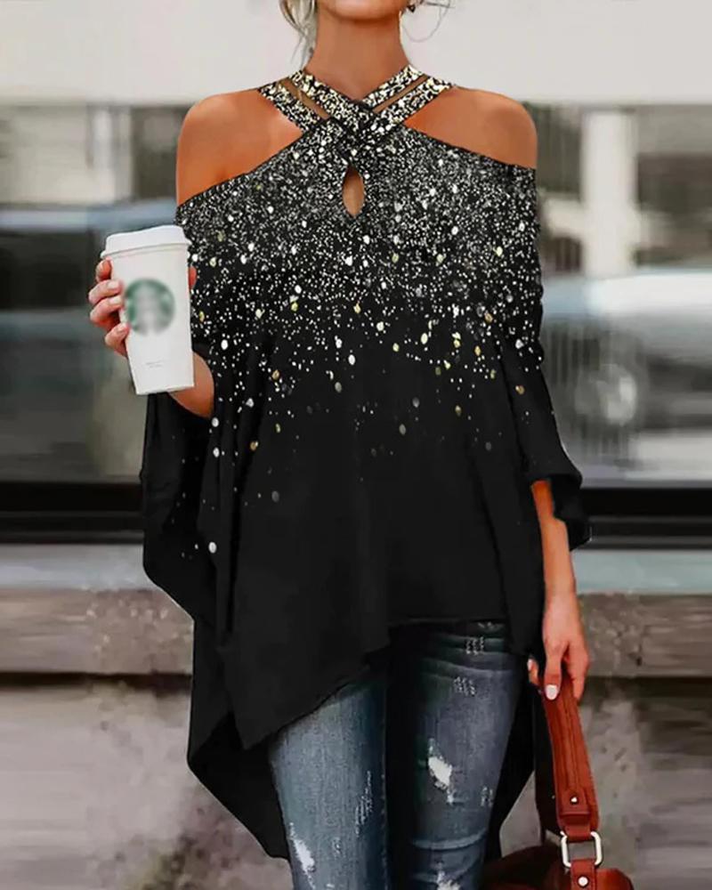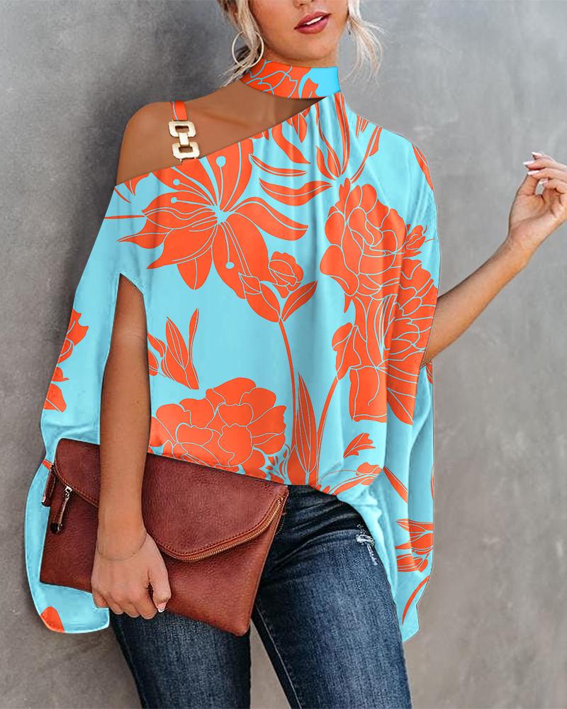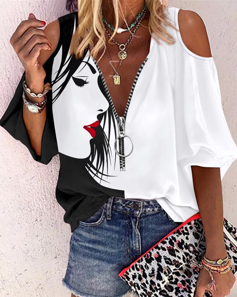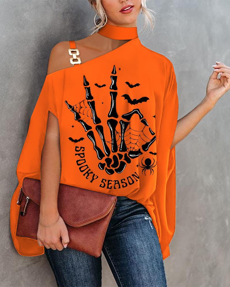 Abstract Figure Print Chain Strap Cold Shoulder Top |