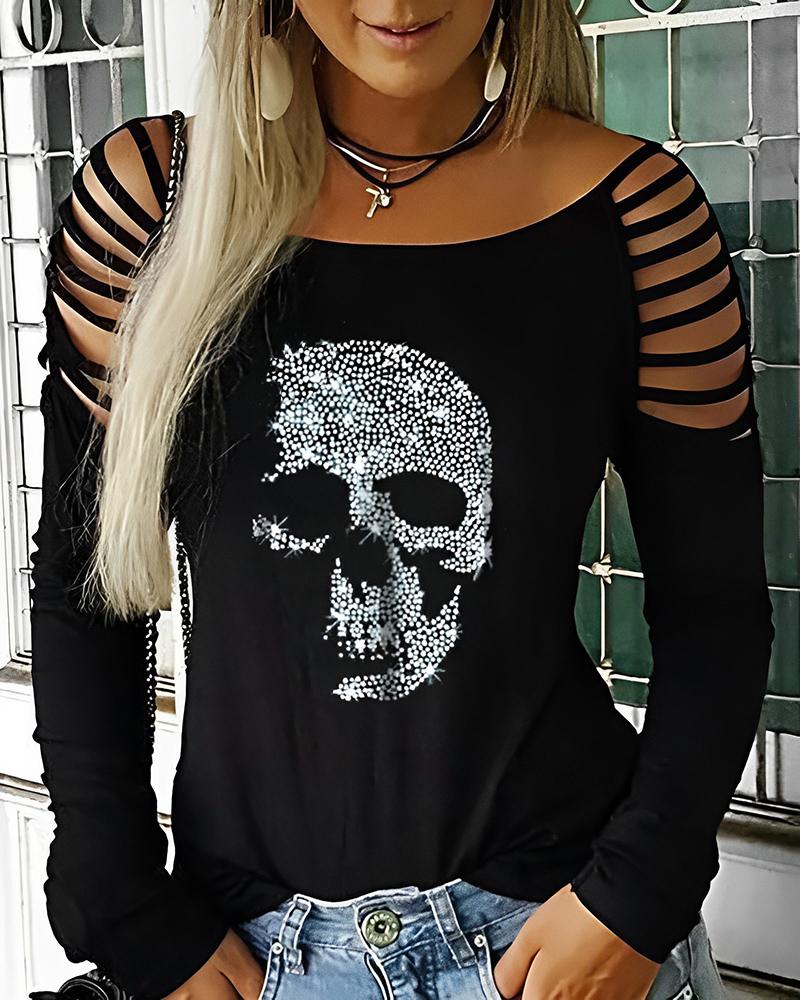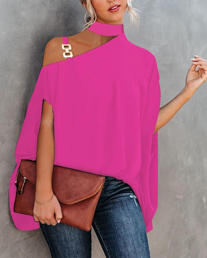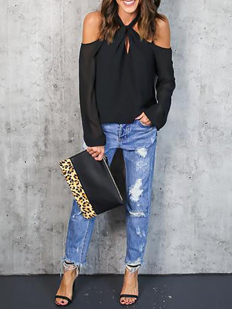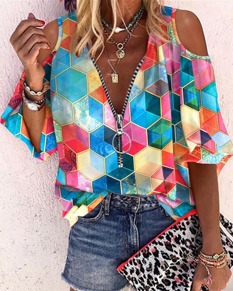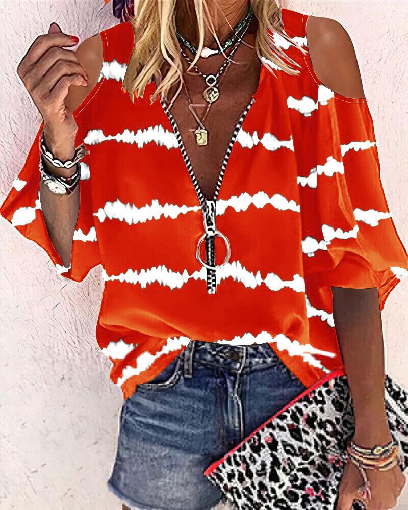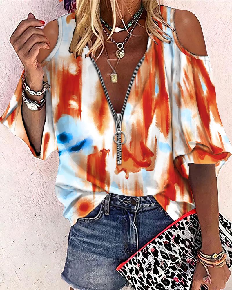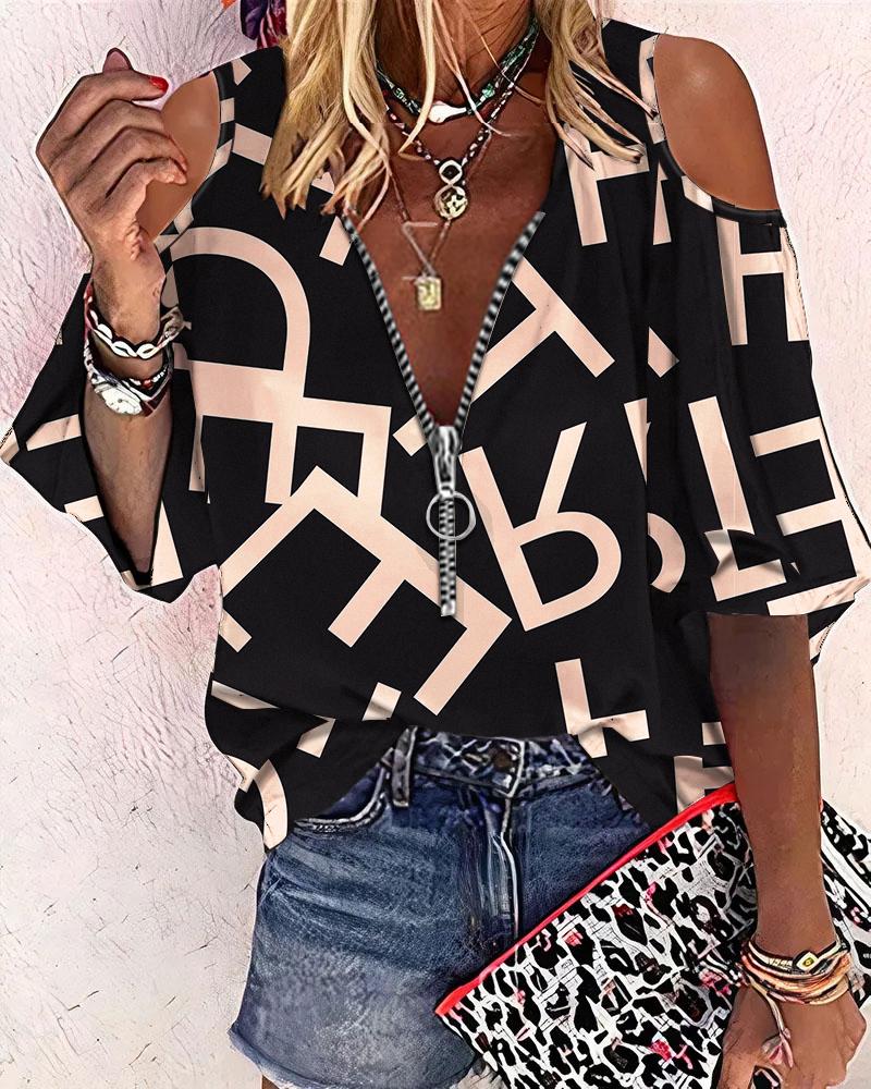Abstract Figure Print Chain Strap Cold Shoulder Top |