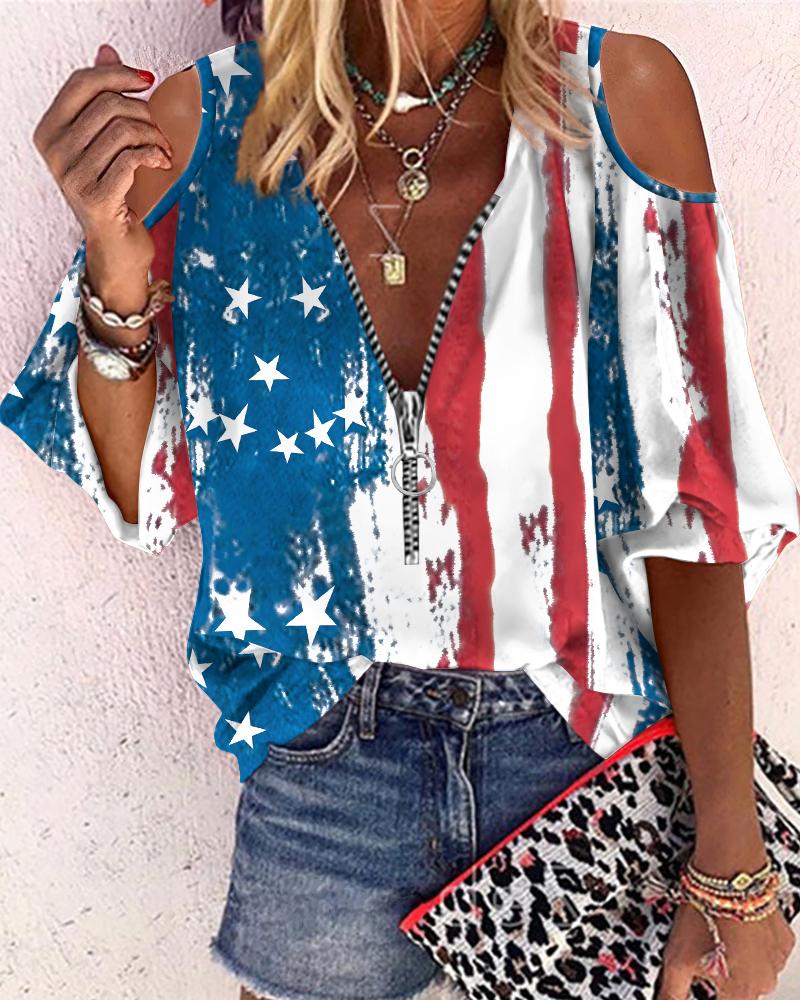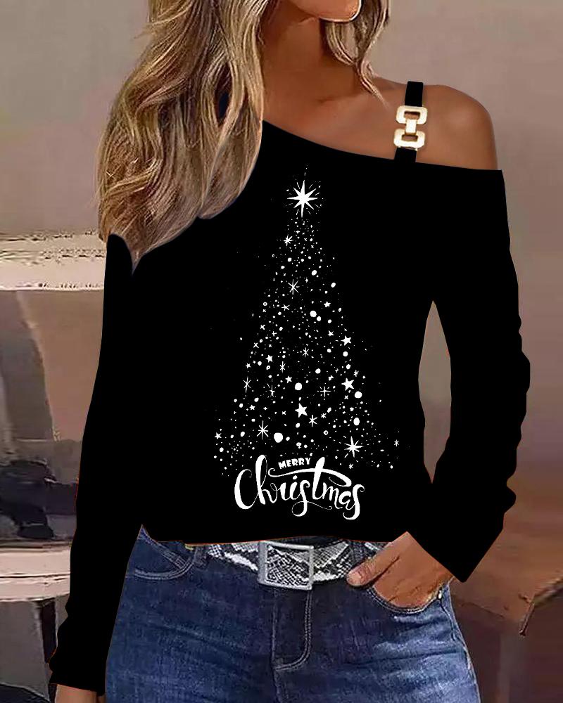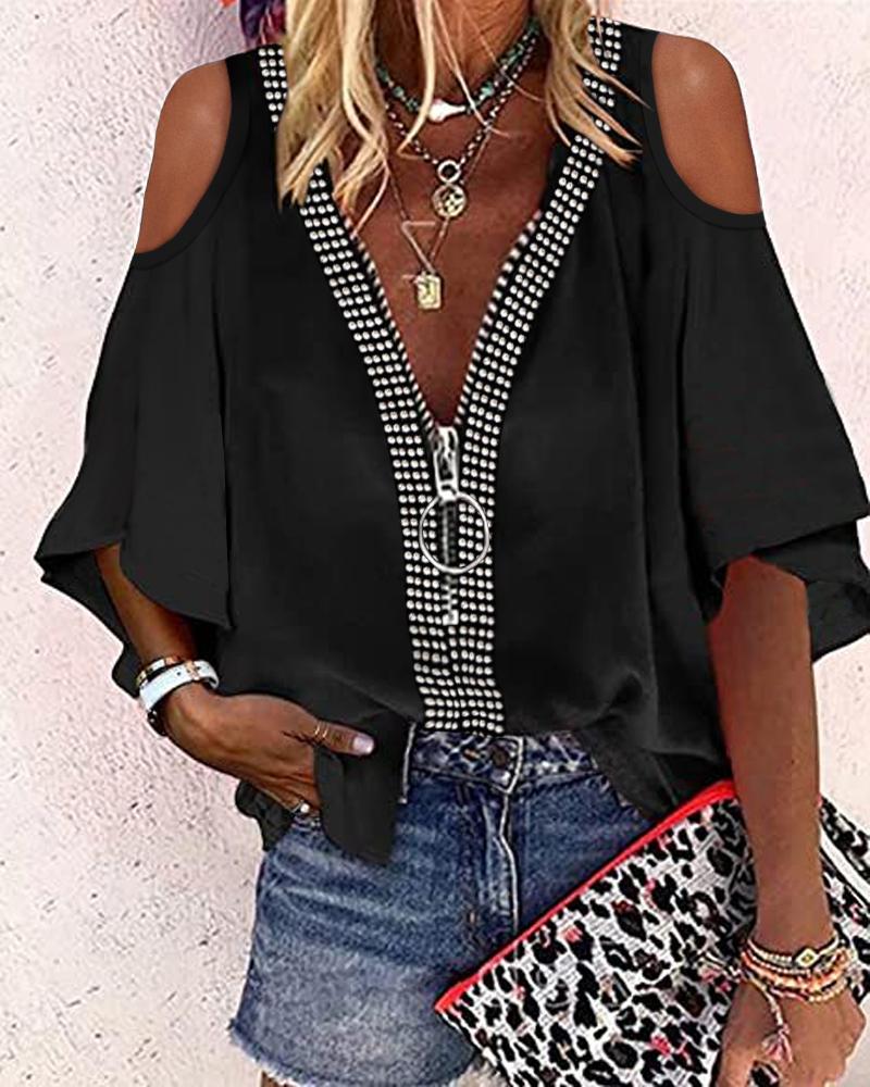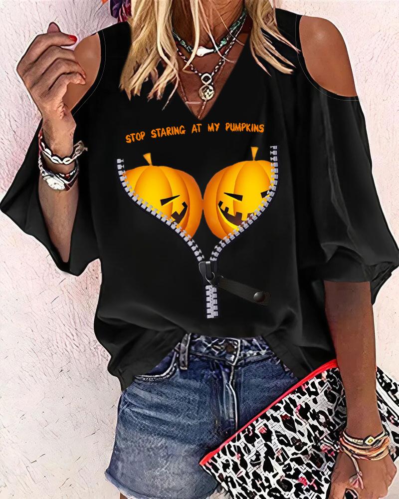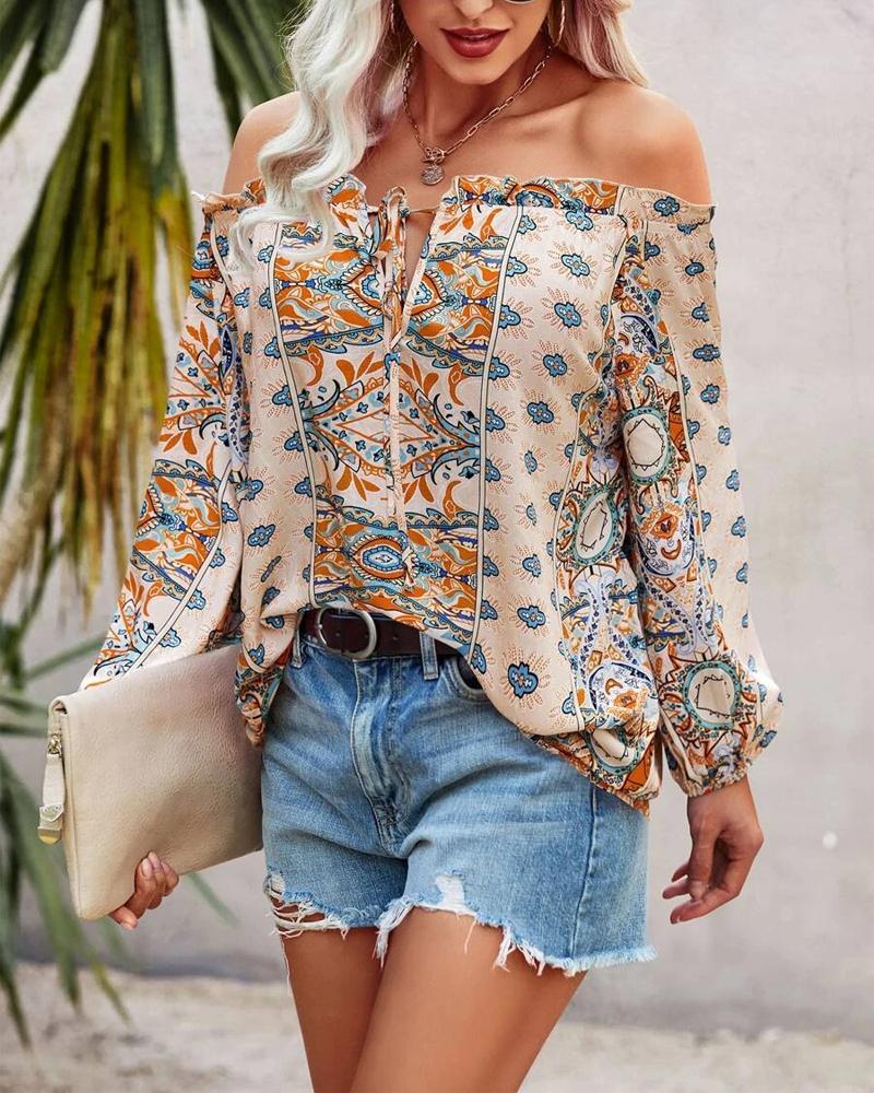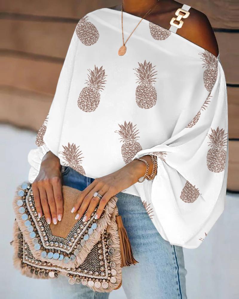 Abstract Figure Print Chain Strap Cold Shoulder Top |