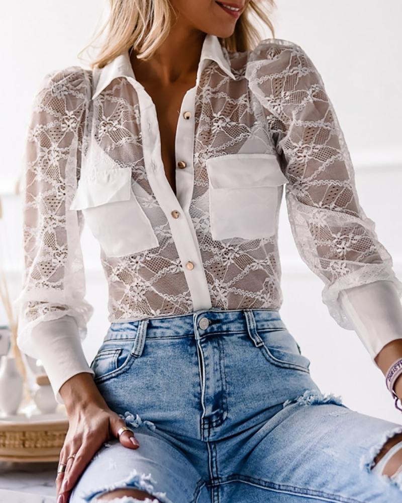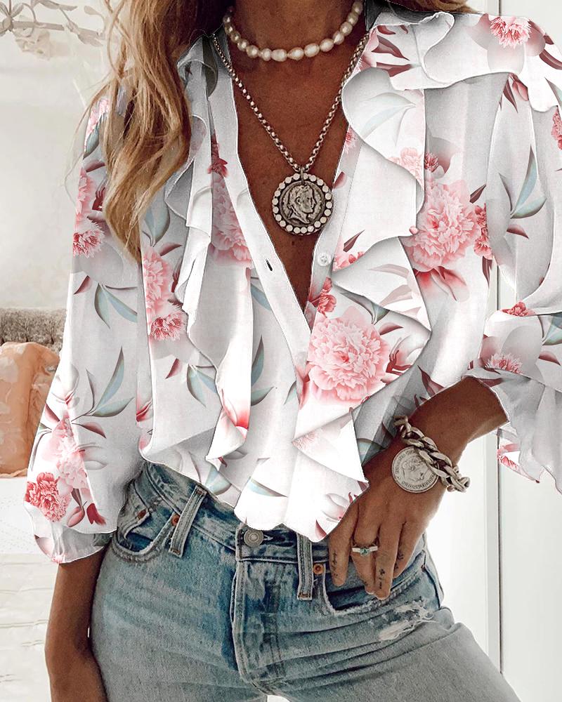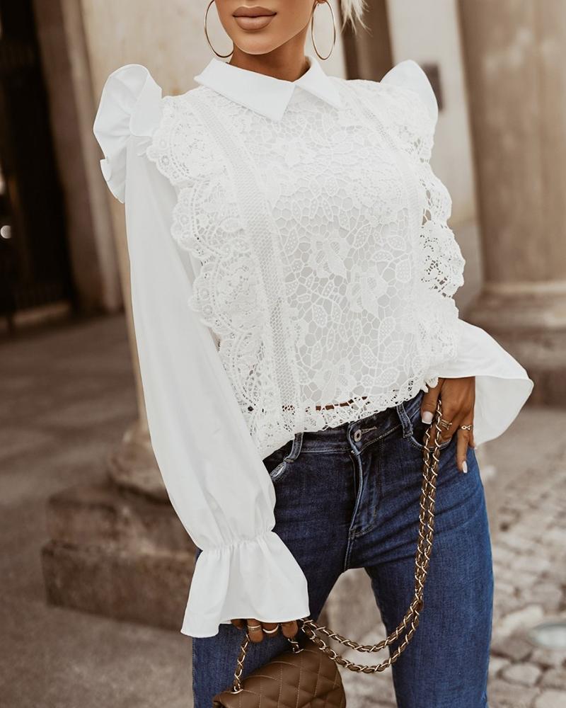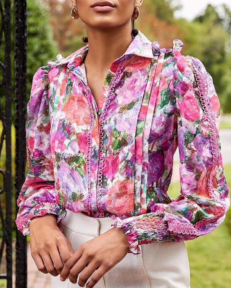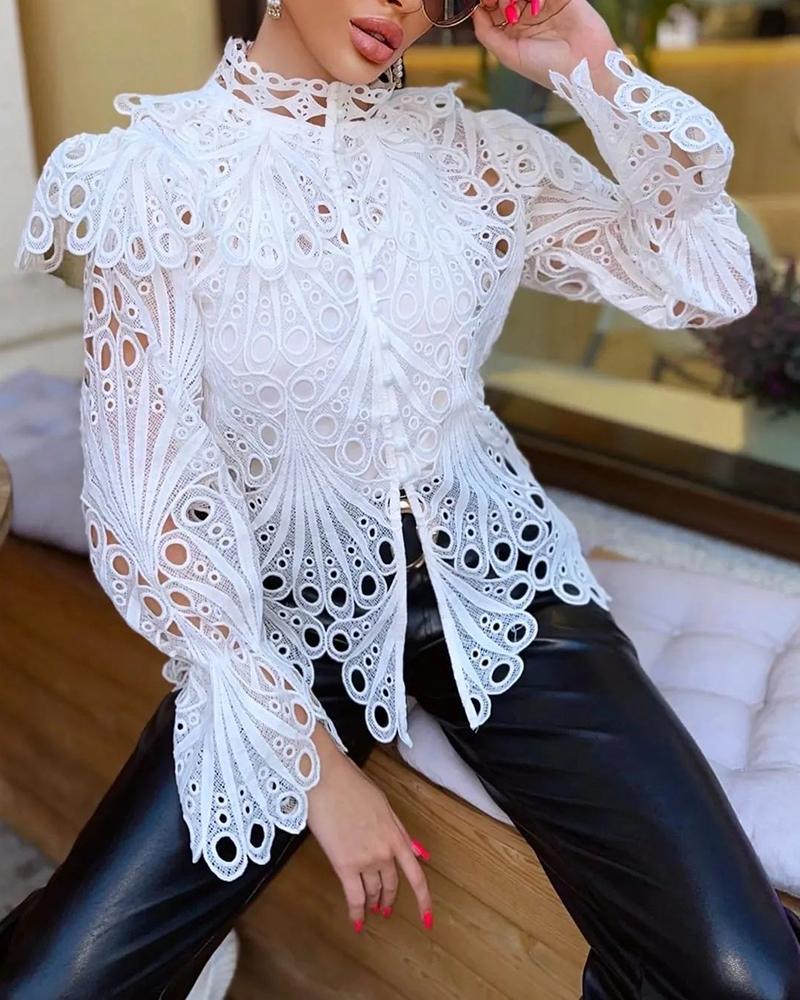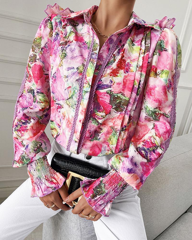 Floral Lace Long Sleeve Ruffles Buttoned Top |