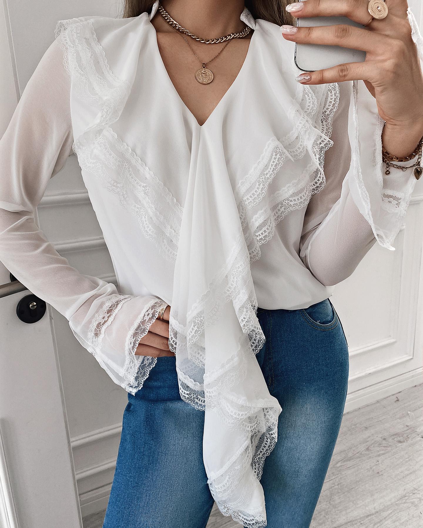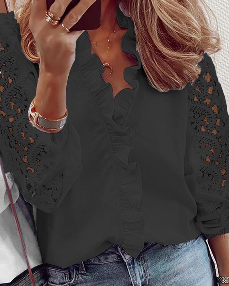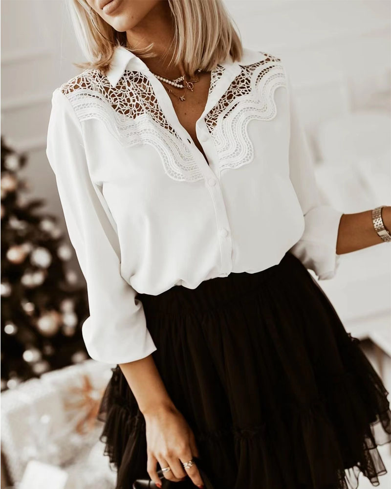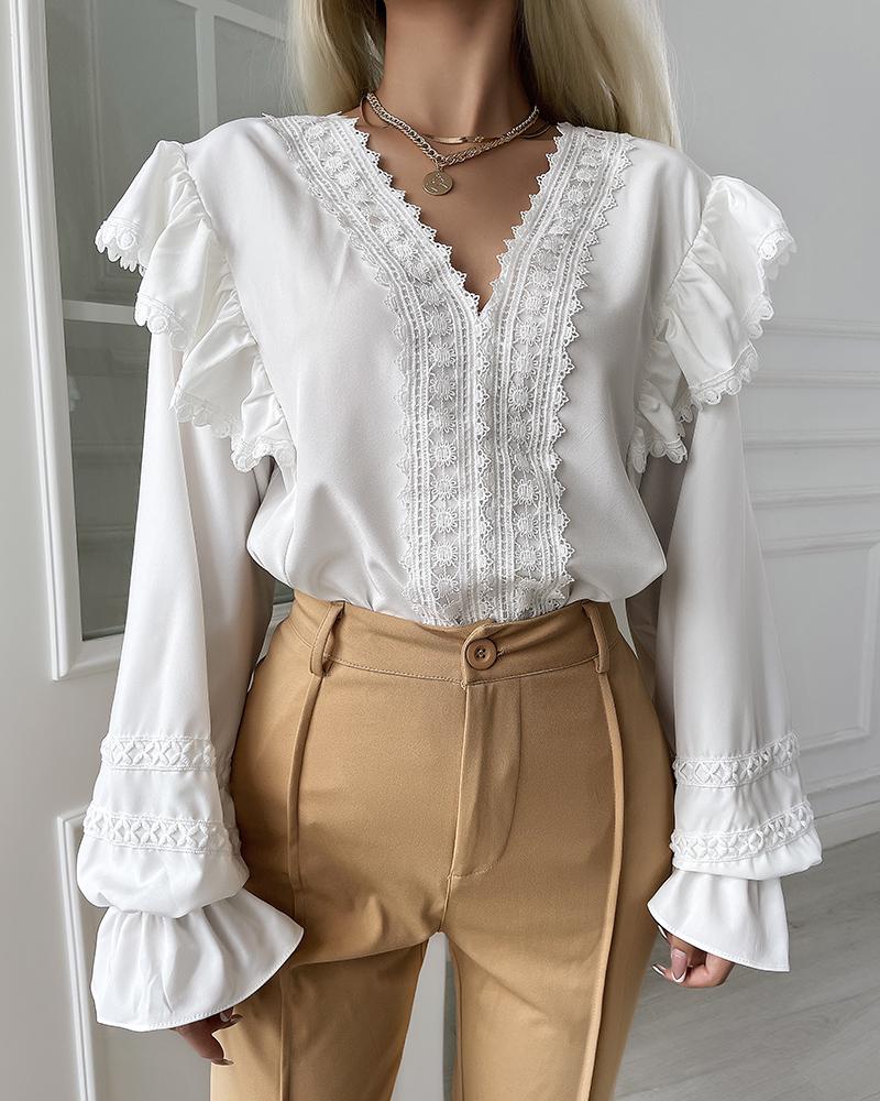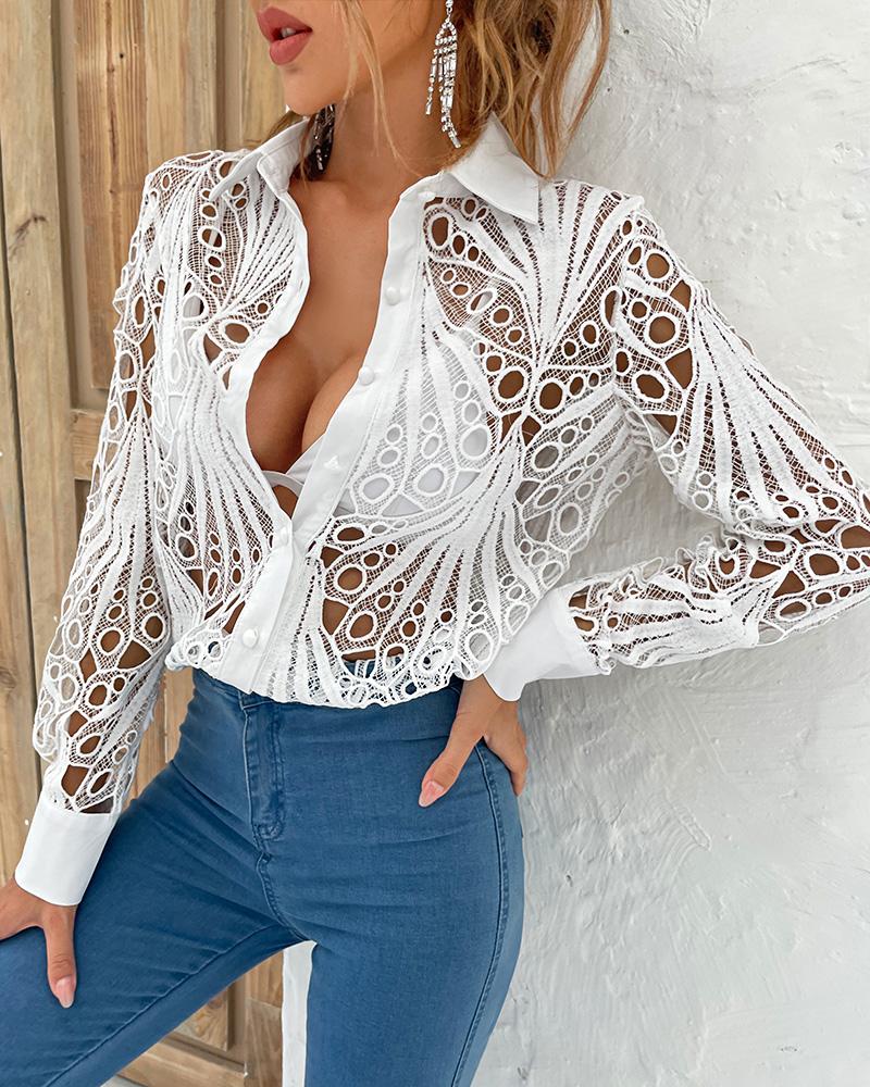 Floral Lace Long Sleeve Ruffles Buttoned Top |
