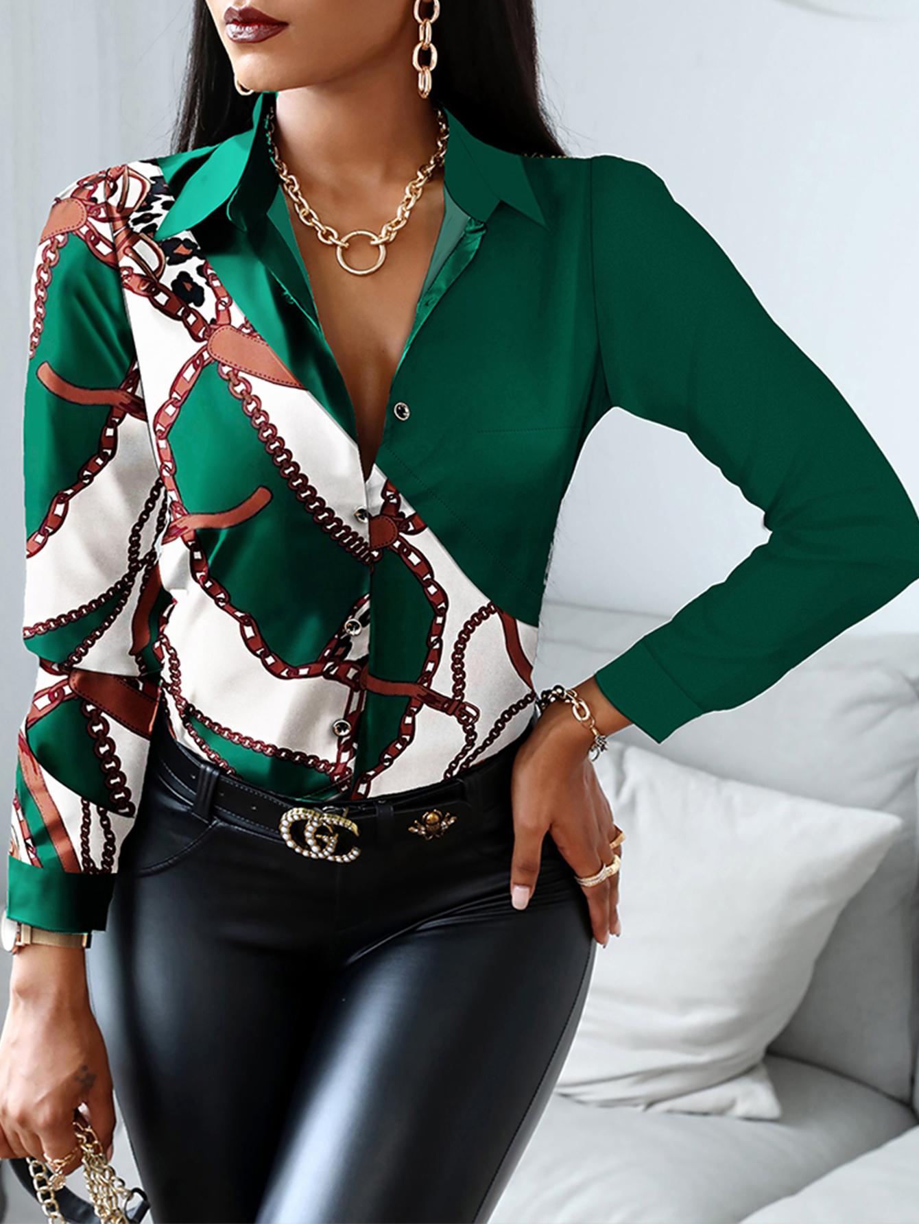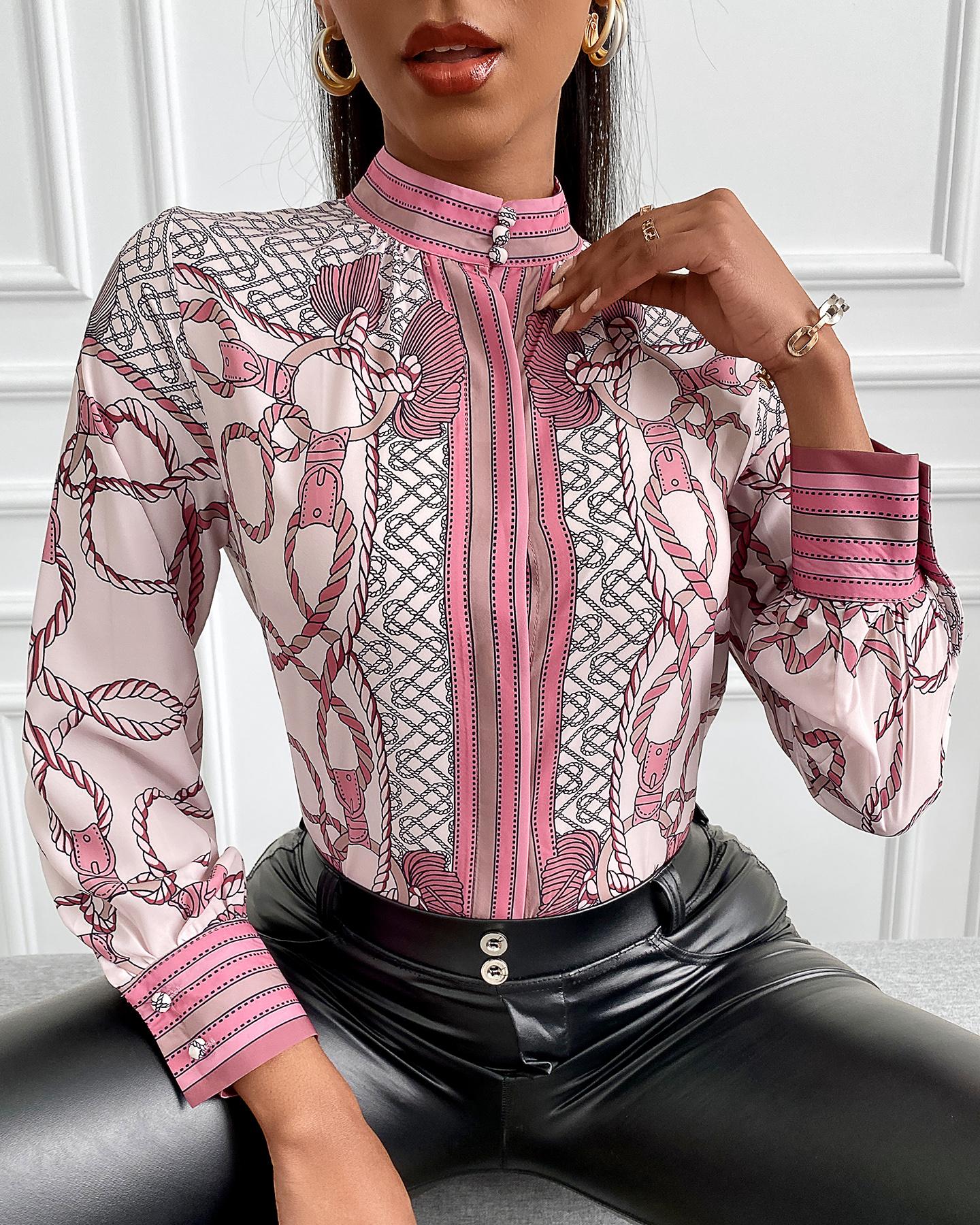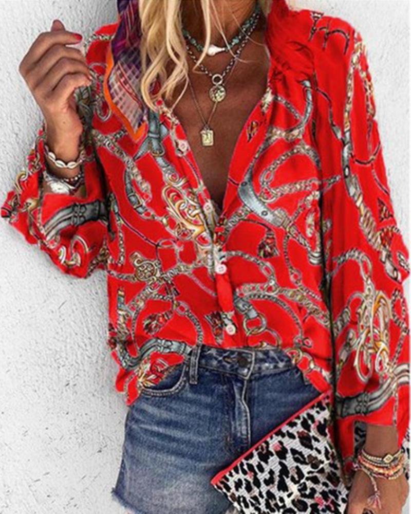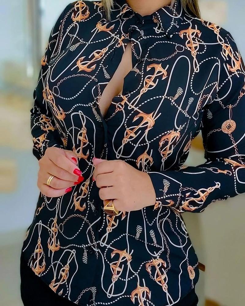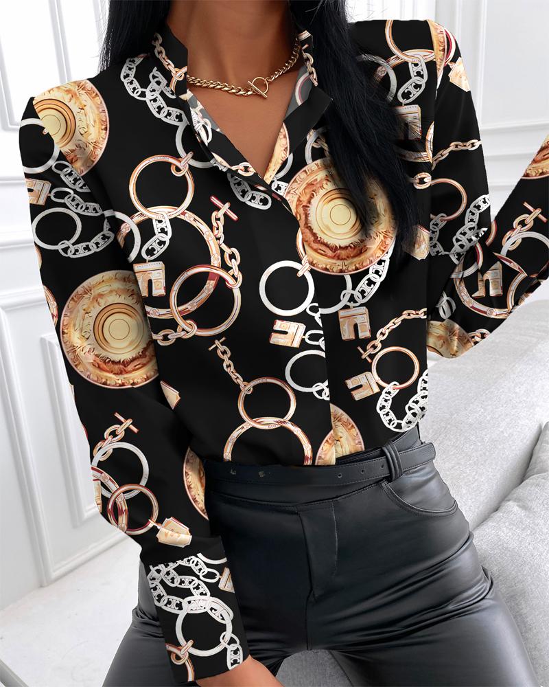 Plus Size Scarf Chain Print Long Sleeve Shirt |