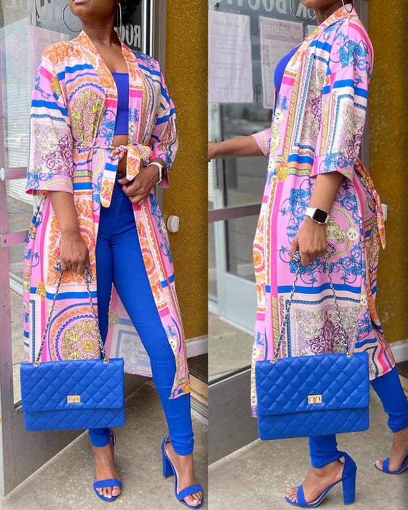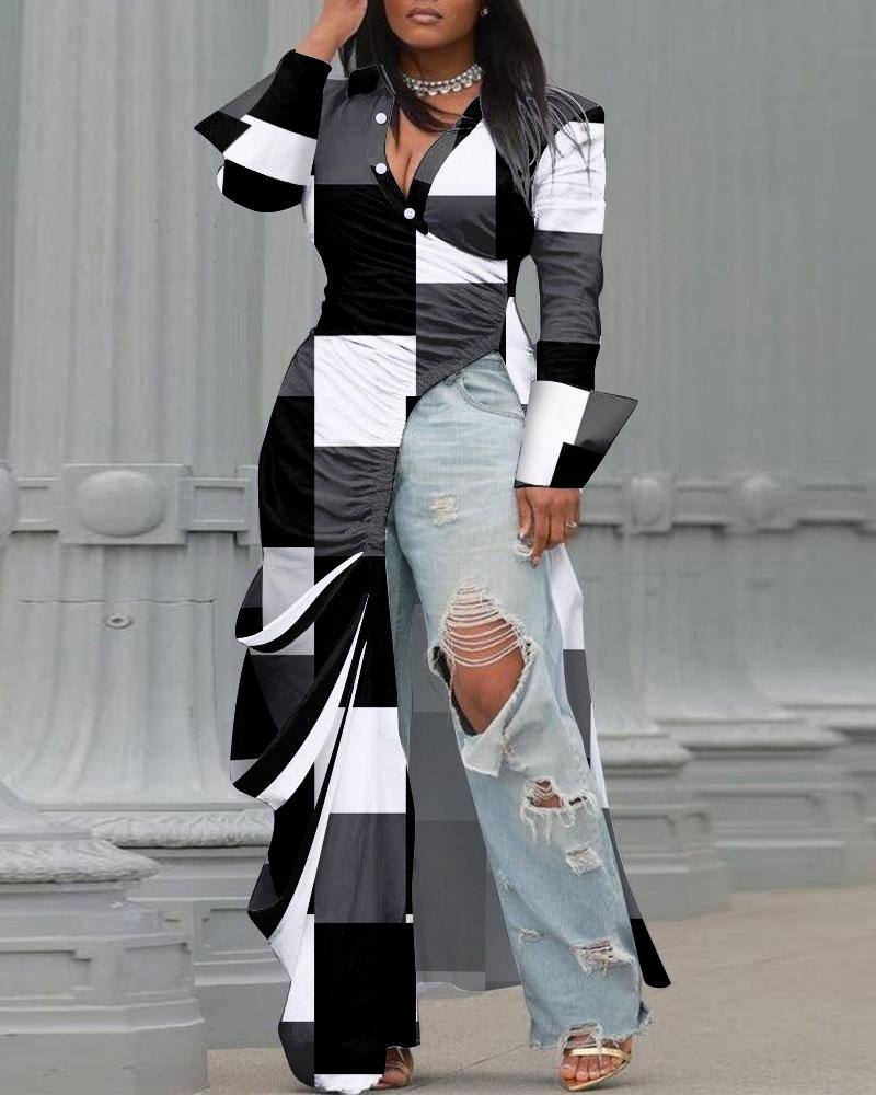 Plus Size Geometric Print Ruched High Slit Longline Top |