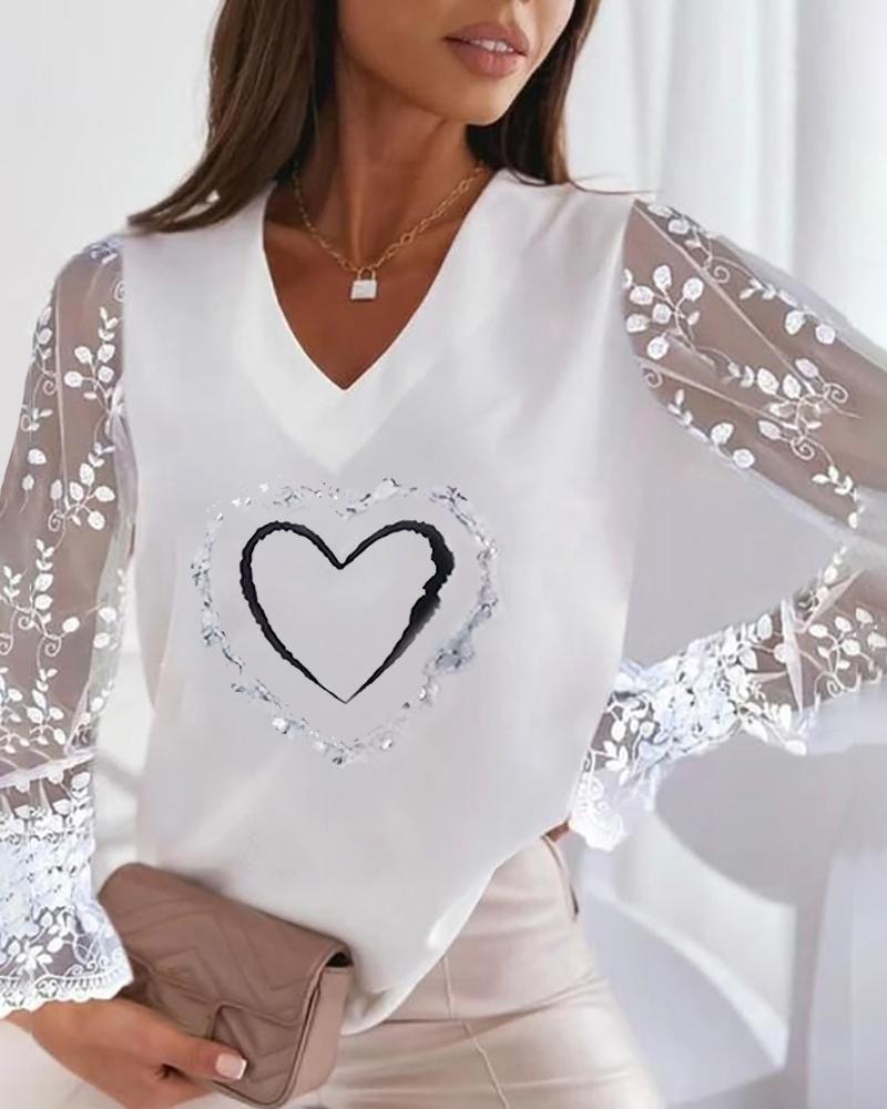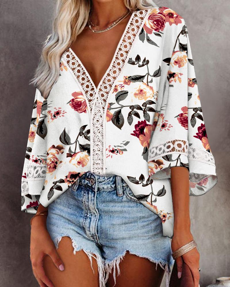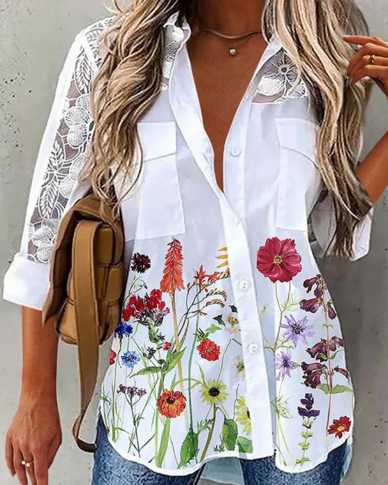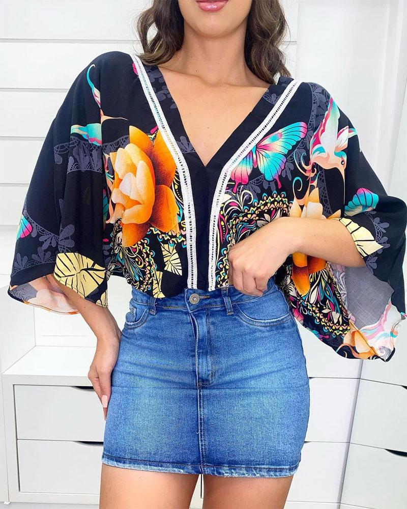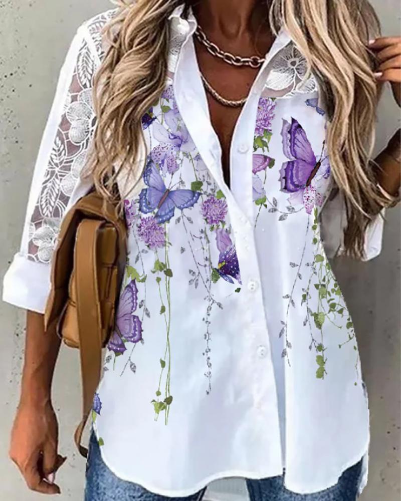 Butterfly Floral Print Contrast Lace Shirt |