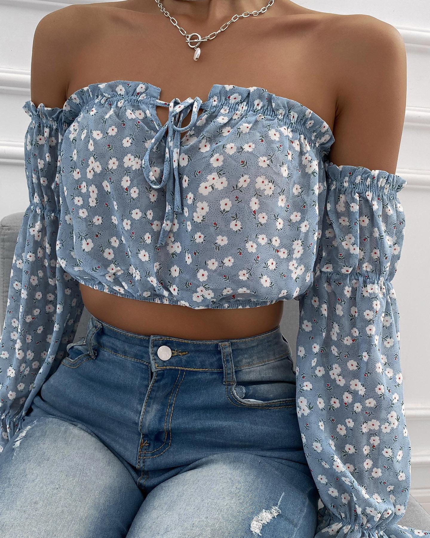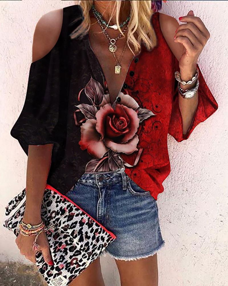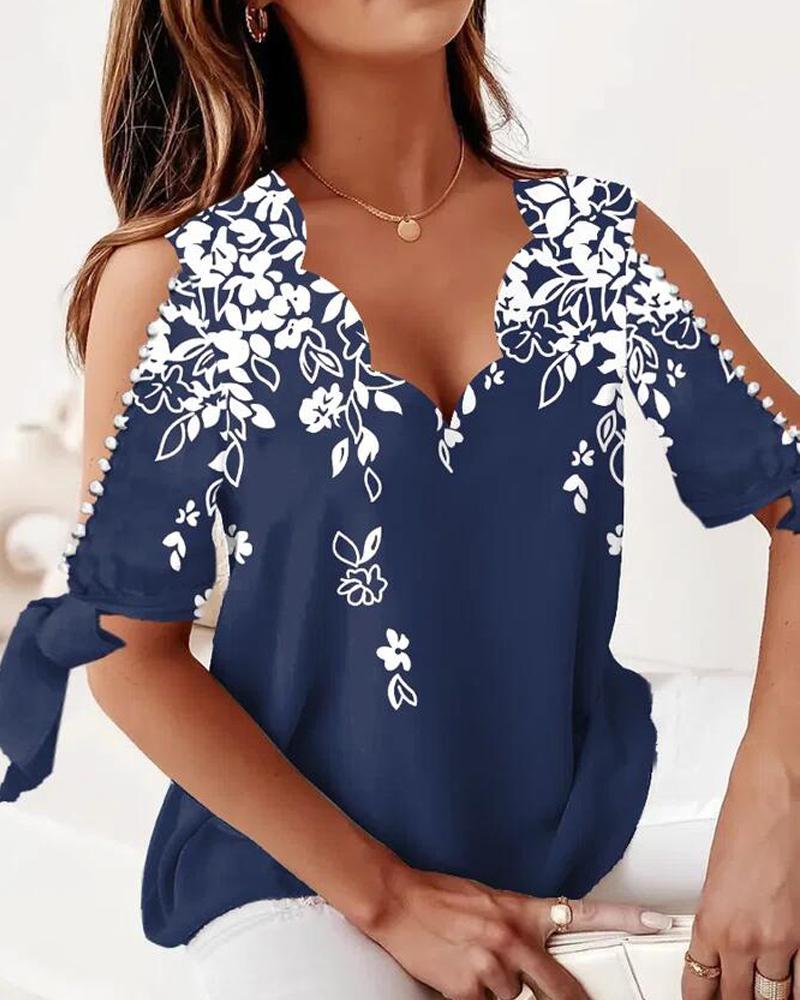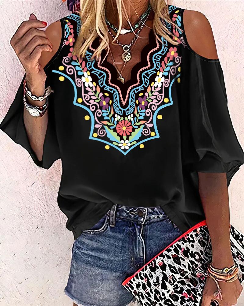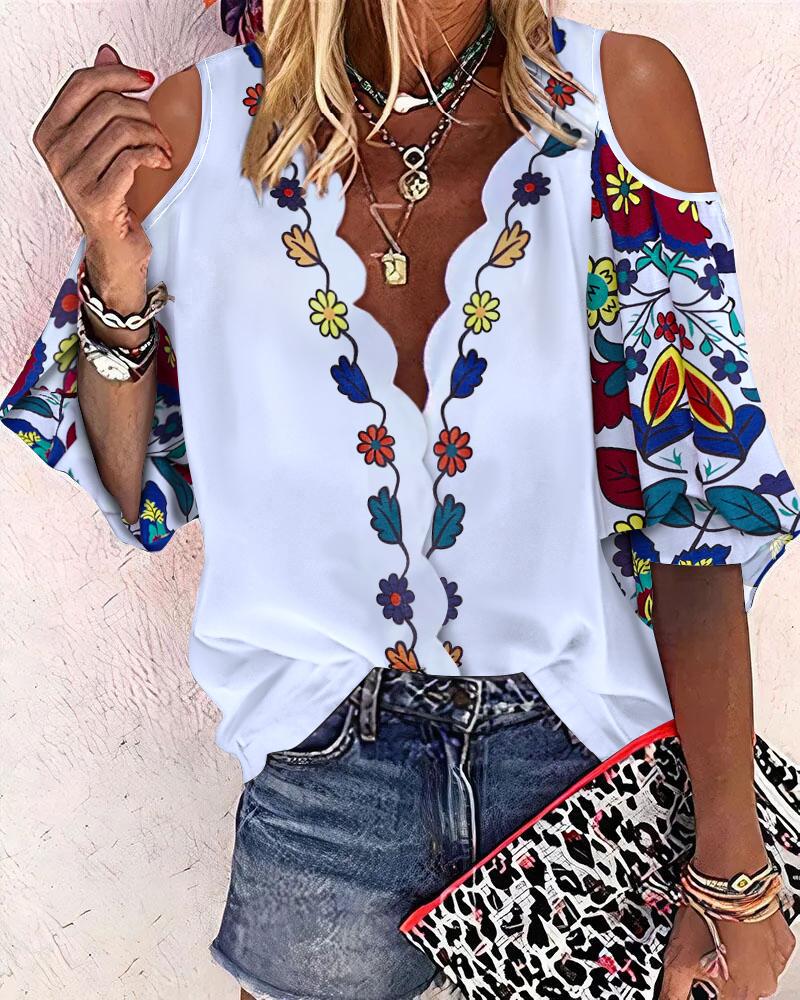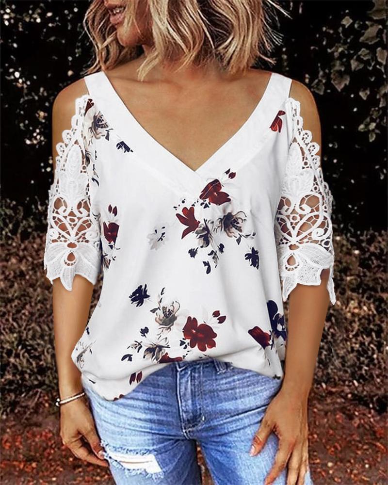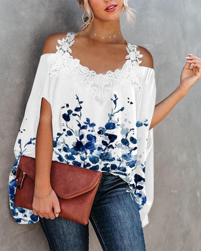 Plants Print Lace Patch Cold Shoulder Top |