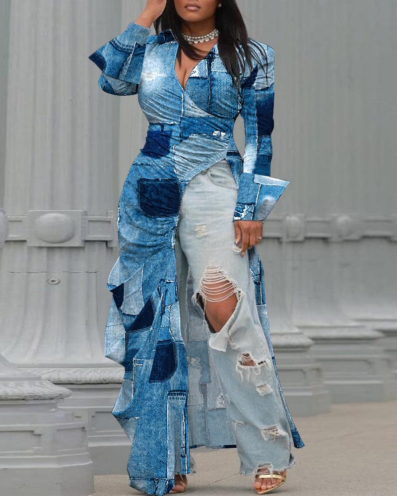 Plus Size Denim Look Print Ruched High Slit Longline Top |