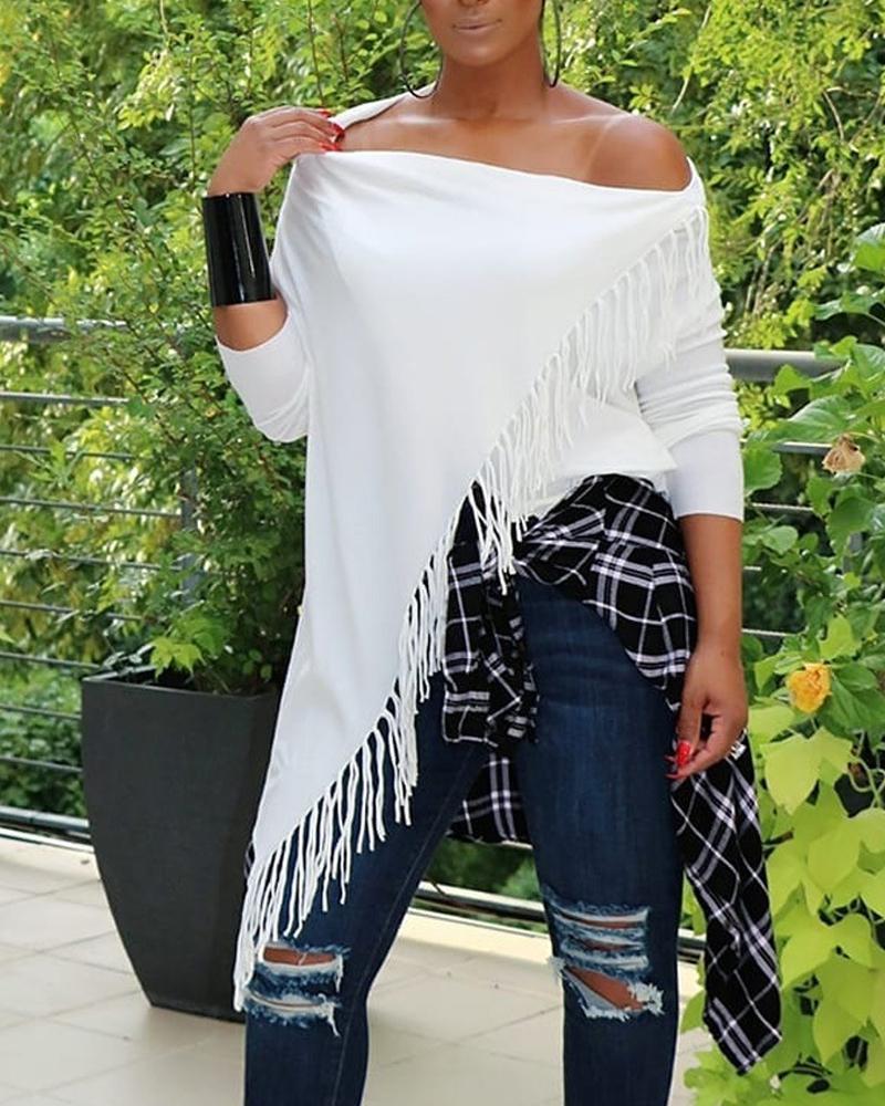 Plus Size Tassel Trim Asymmetrical Hem Long Sleeve Top |