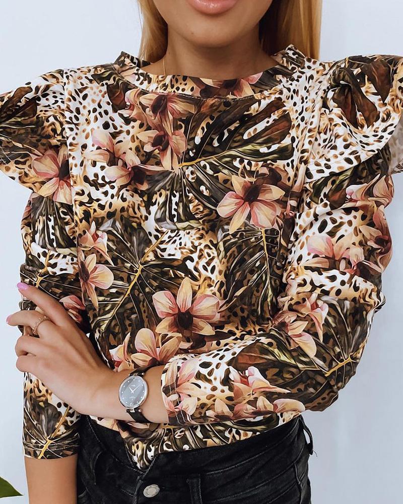 Leopard Print Contrast Mesh Long Sleeve Top |