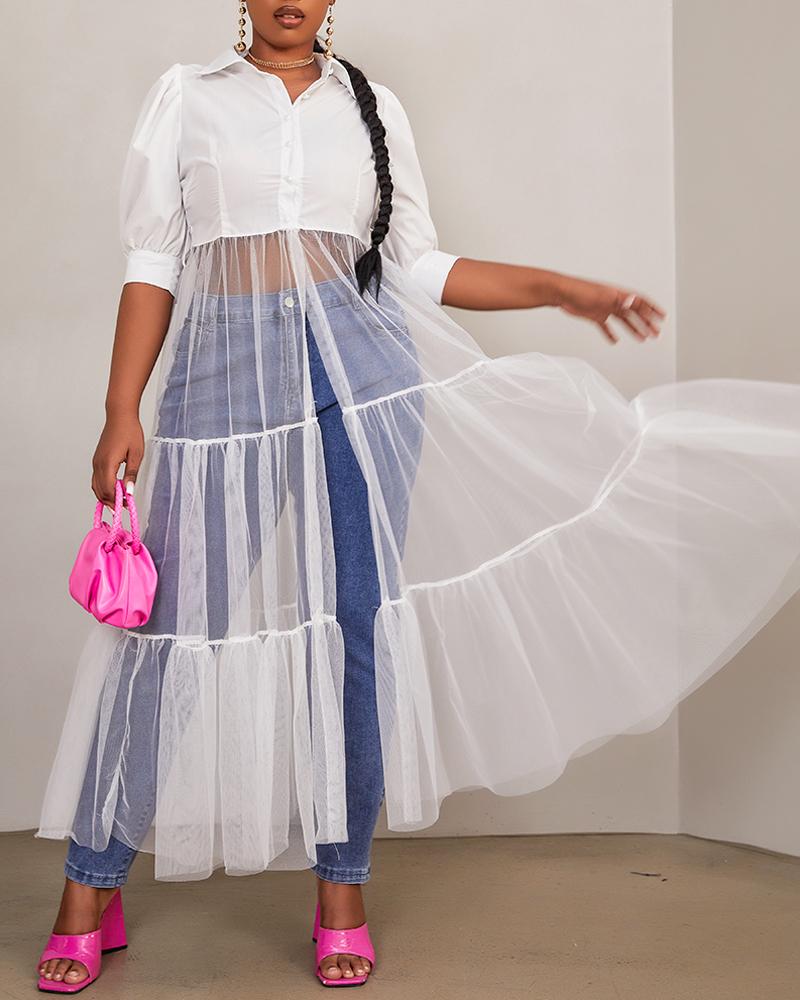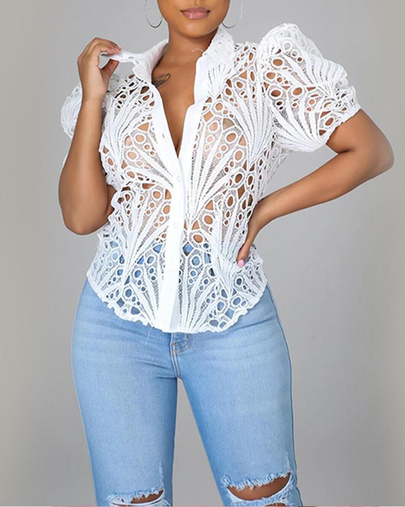 Dot Mesh Puff Sleeve Button Decor Top |