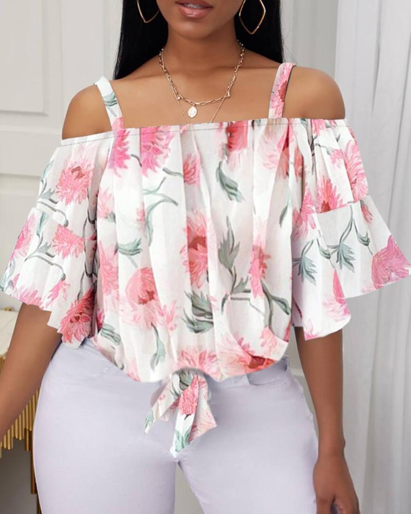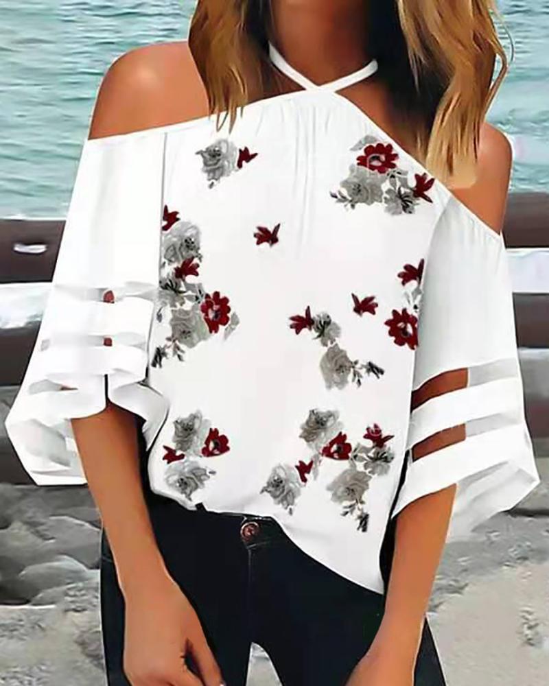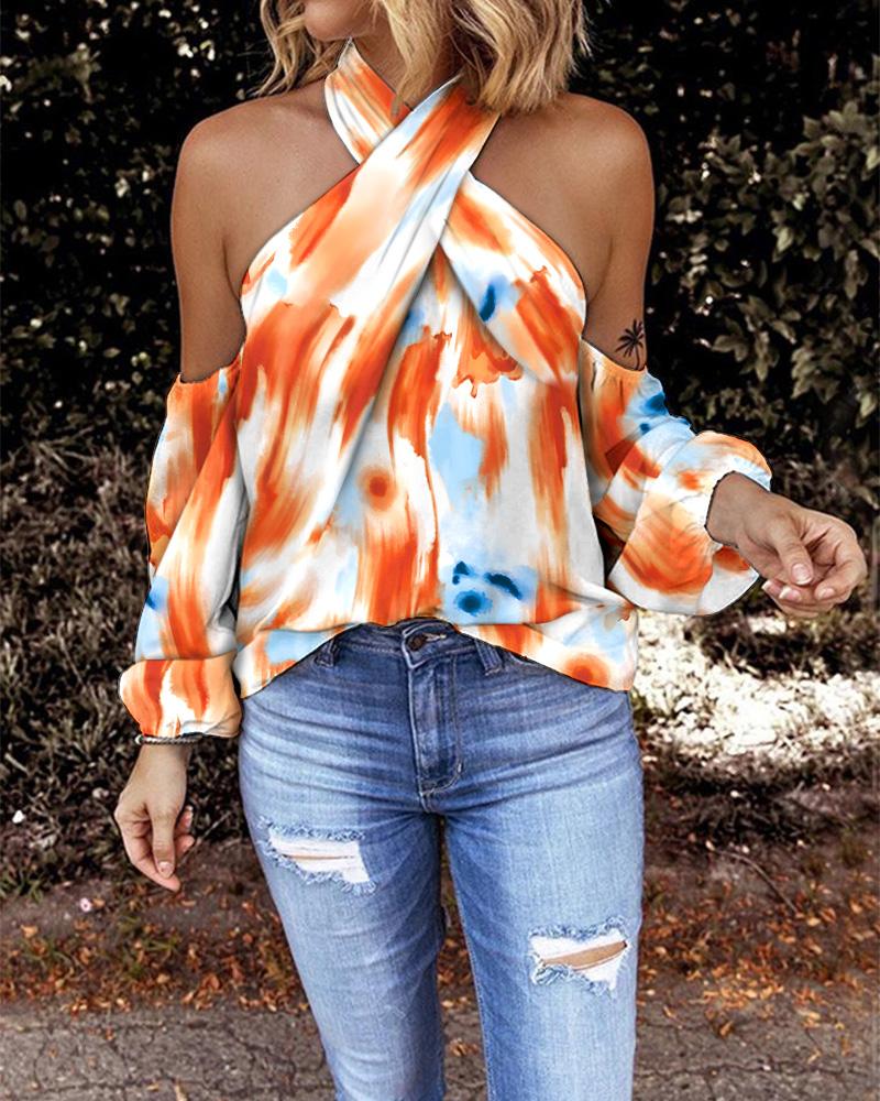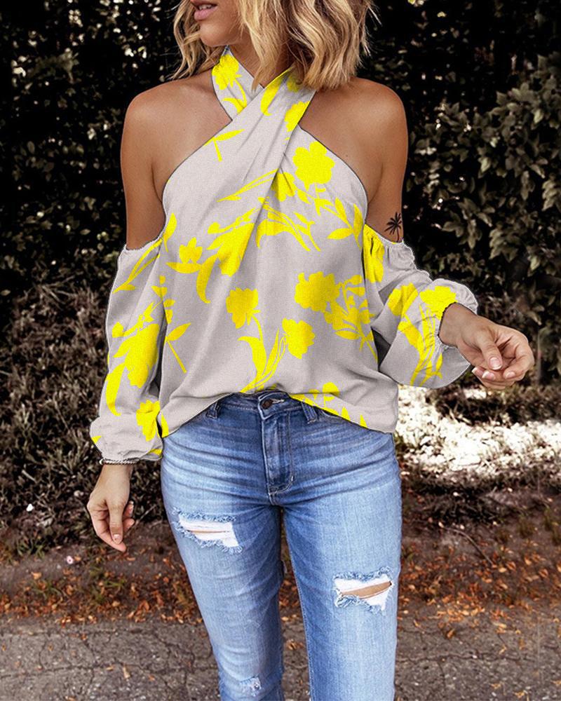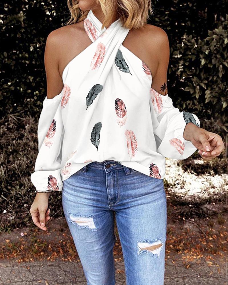 Plants Print Crisscross Halter Cold Shoulder Top |