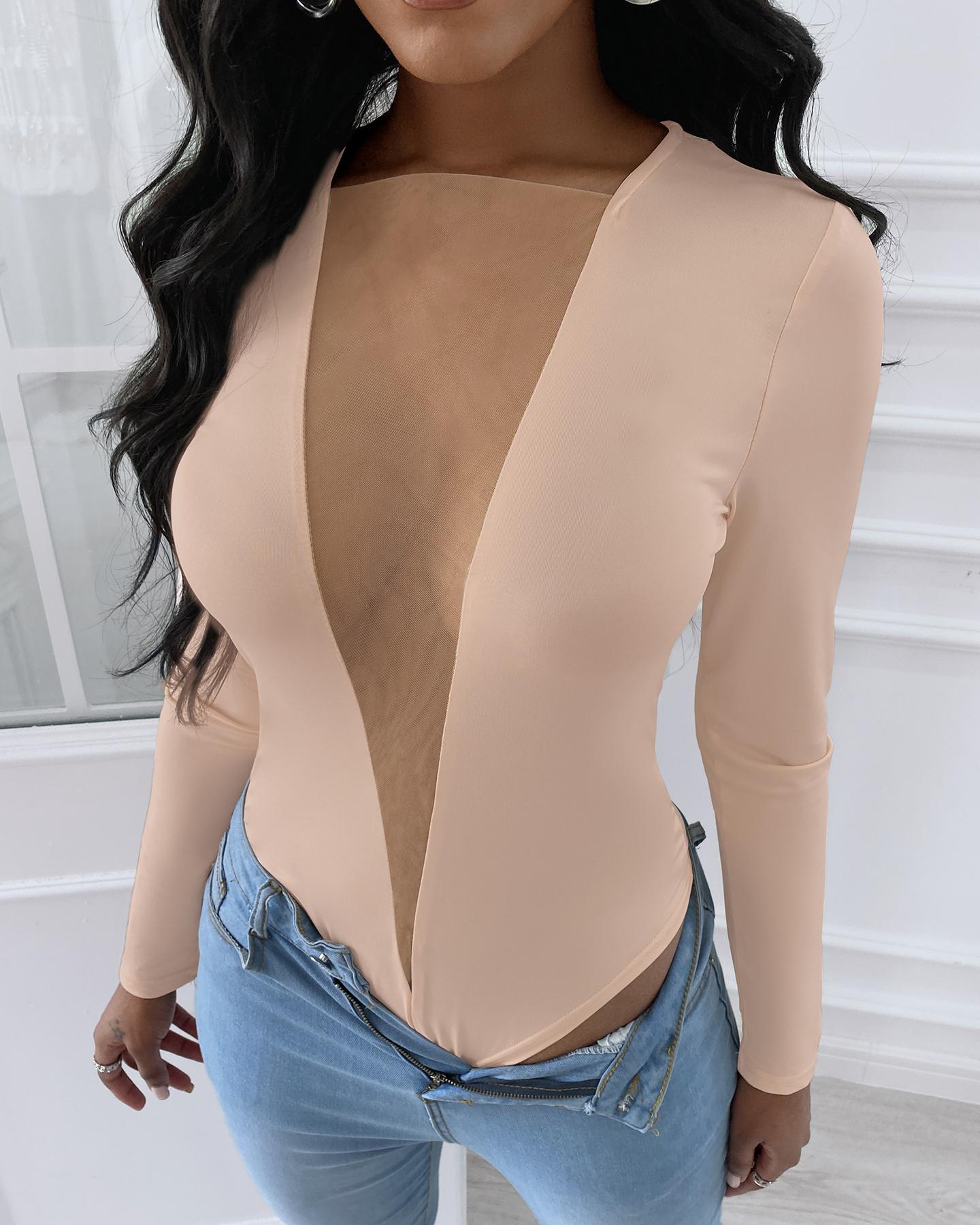 Mesh Patch Rhinestone Long Sleeve Bodysuit |