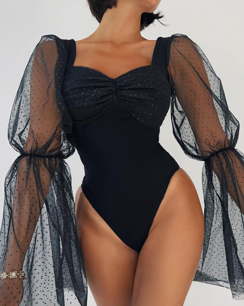 Sheer Mesh Sequins Puff Lantern Sleeve Skinny Bodysuit |
