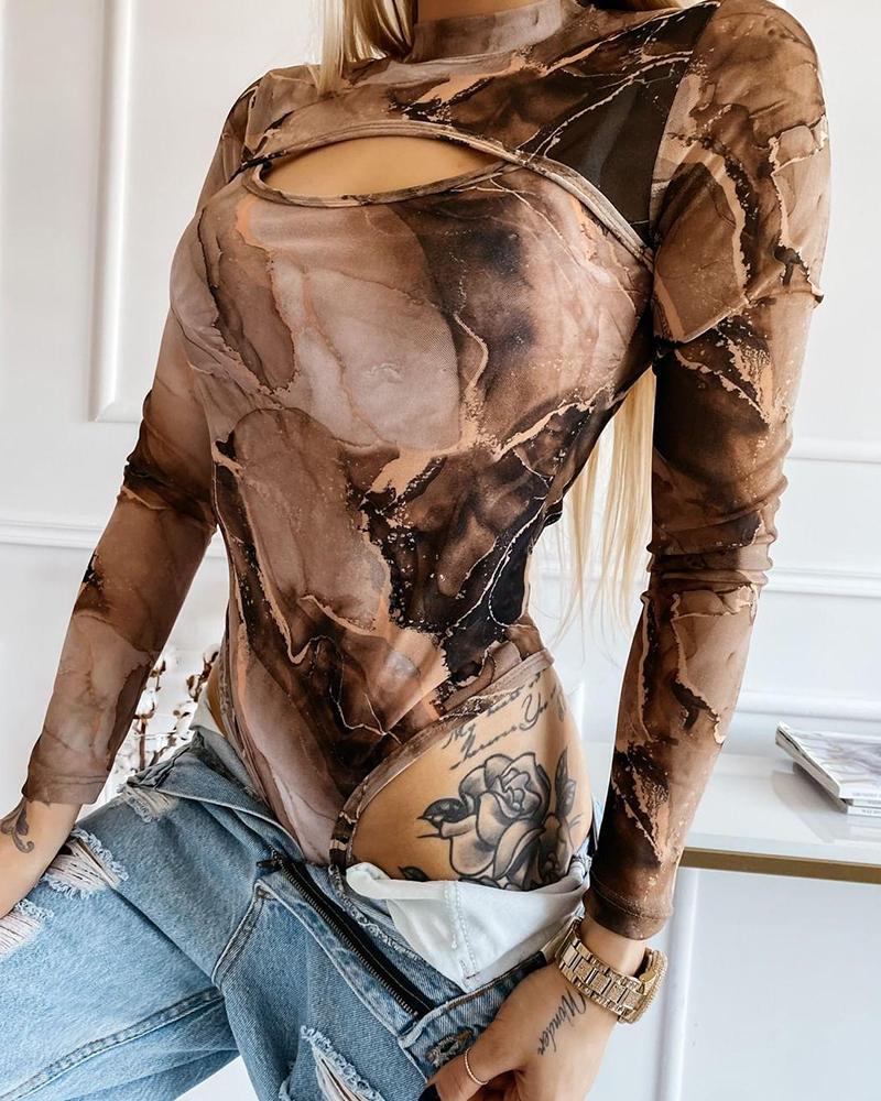 Geo Print Sleeveless Sheer Mesh Bodysuit |