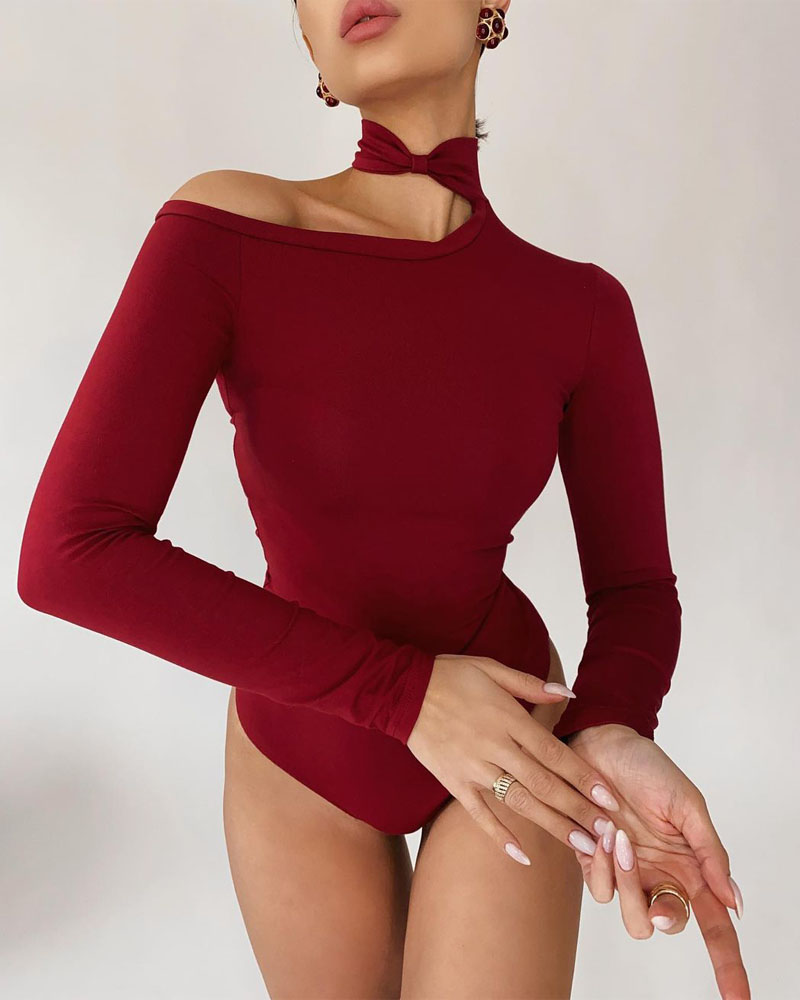 Bowknot Decor Cold Shoulder Skinny Bodysuit |
