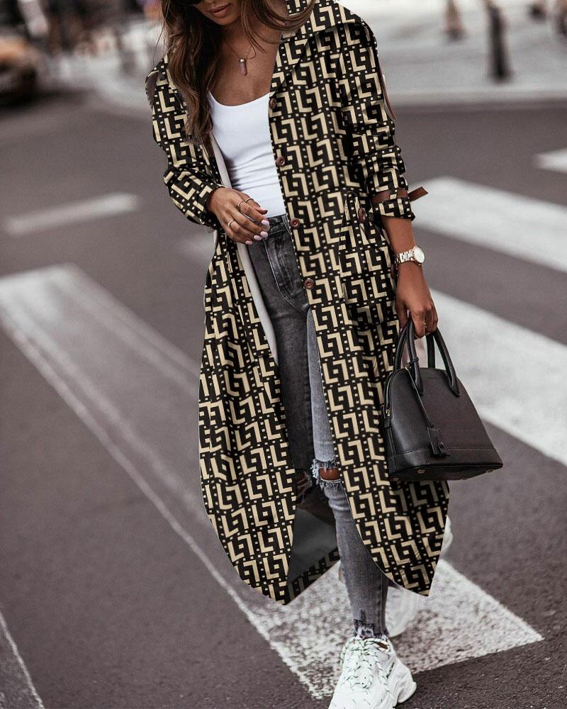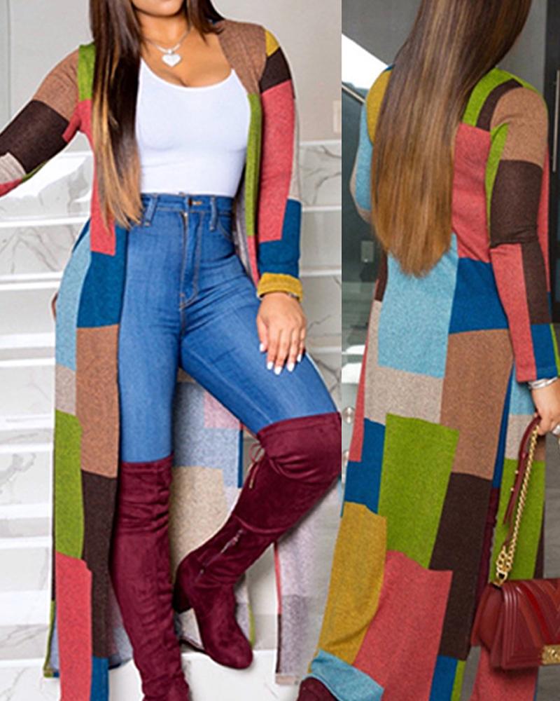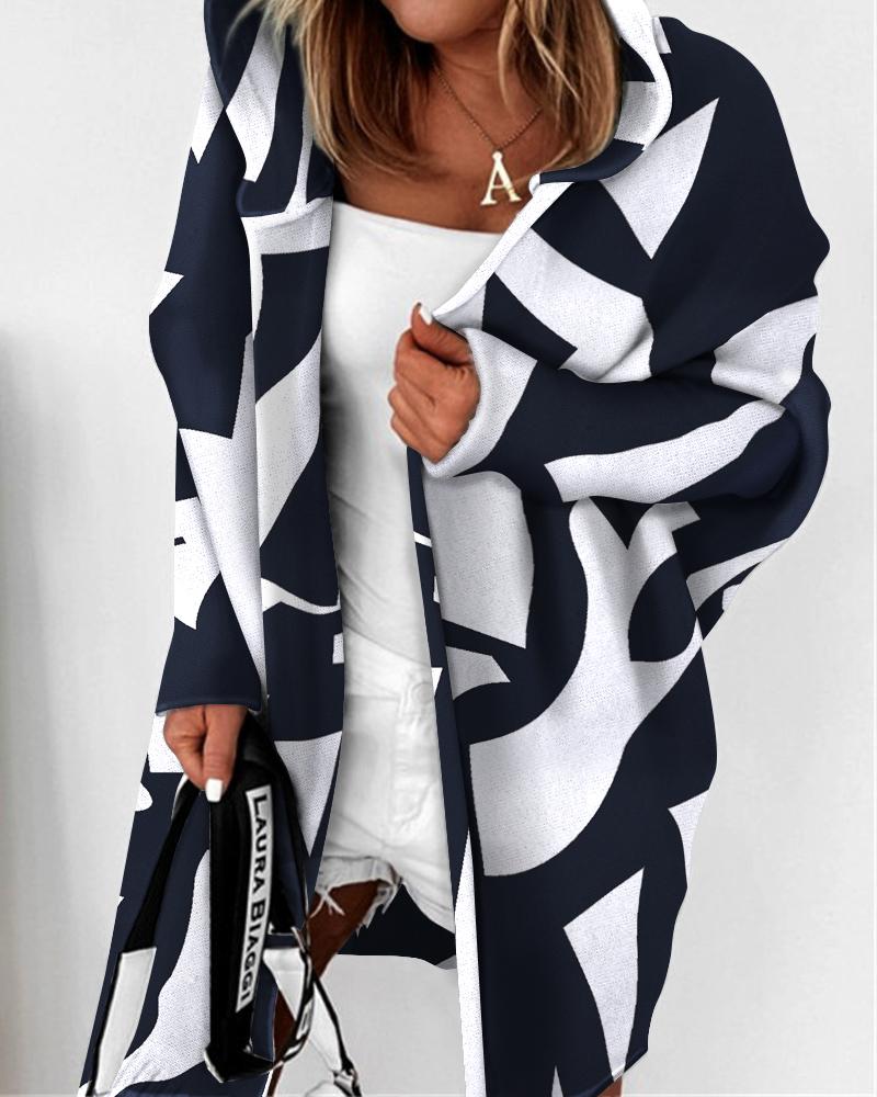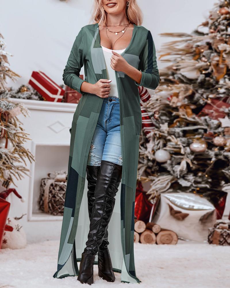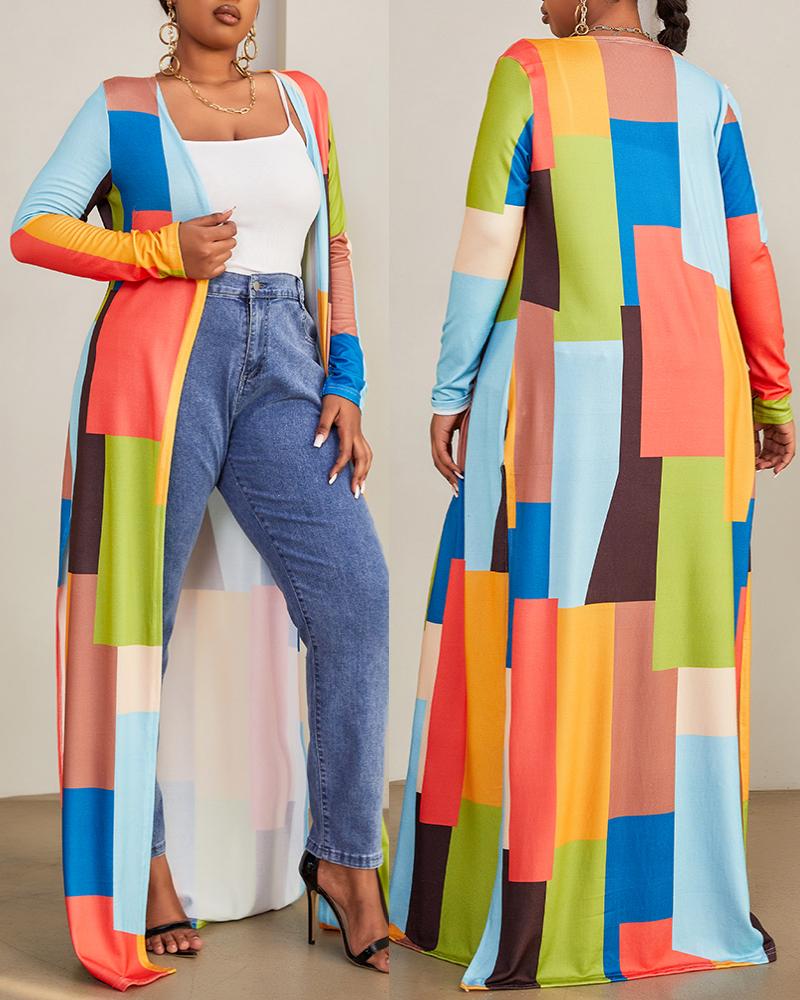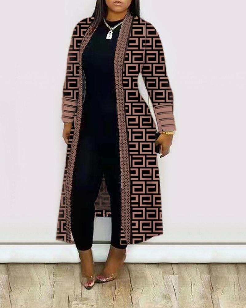 Plus Size Geo Print Open Front Split Hem Longline Coat |
