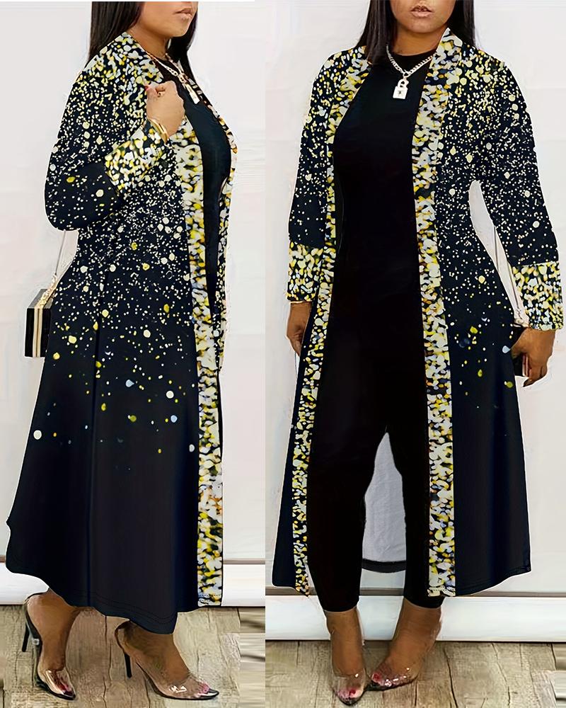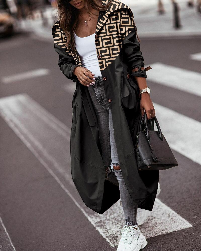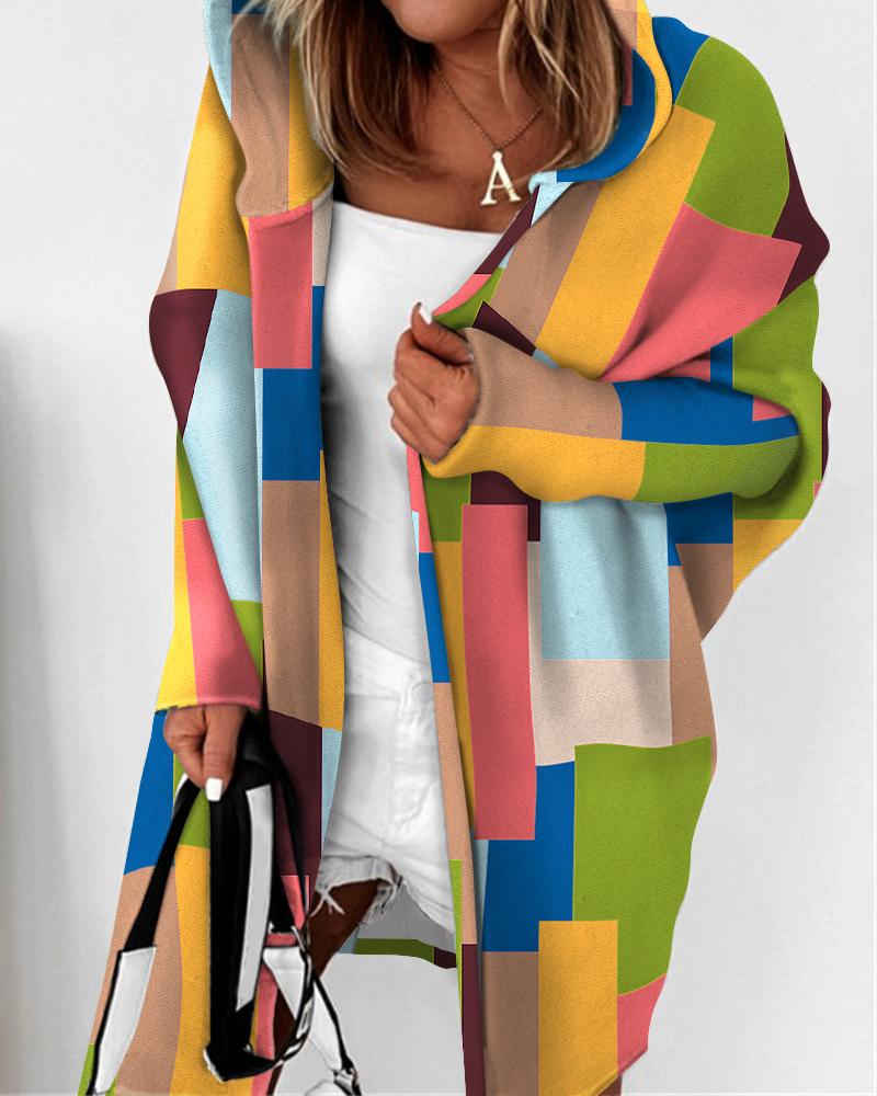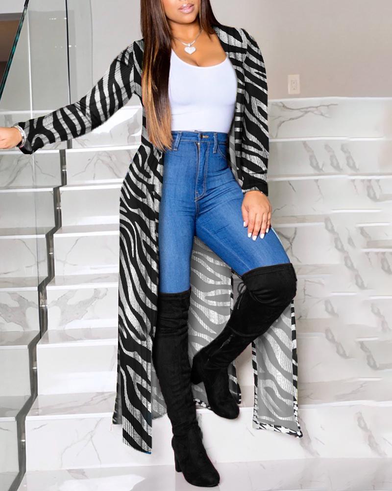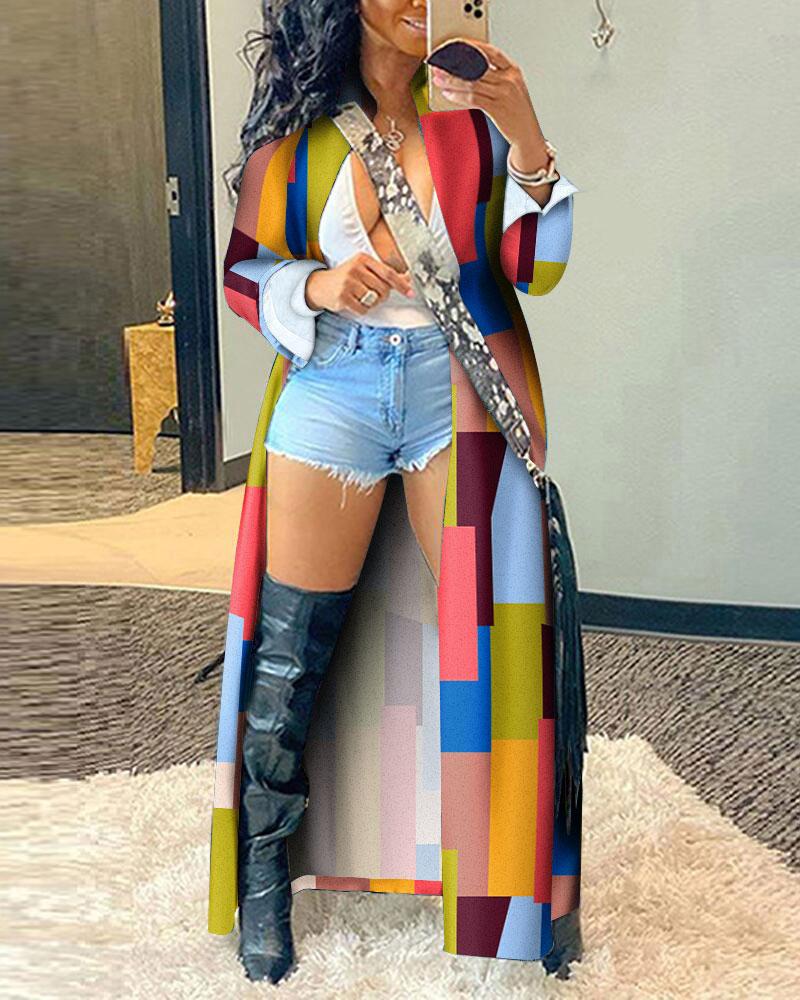 Plus Size Geo Print Open Front Split Hem Longline Coat |