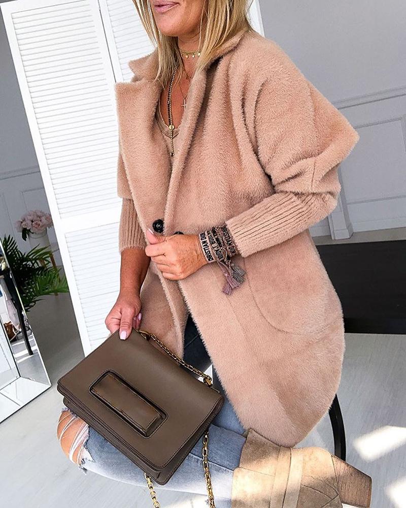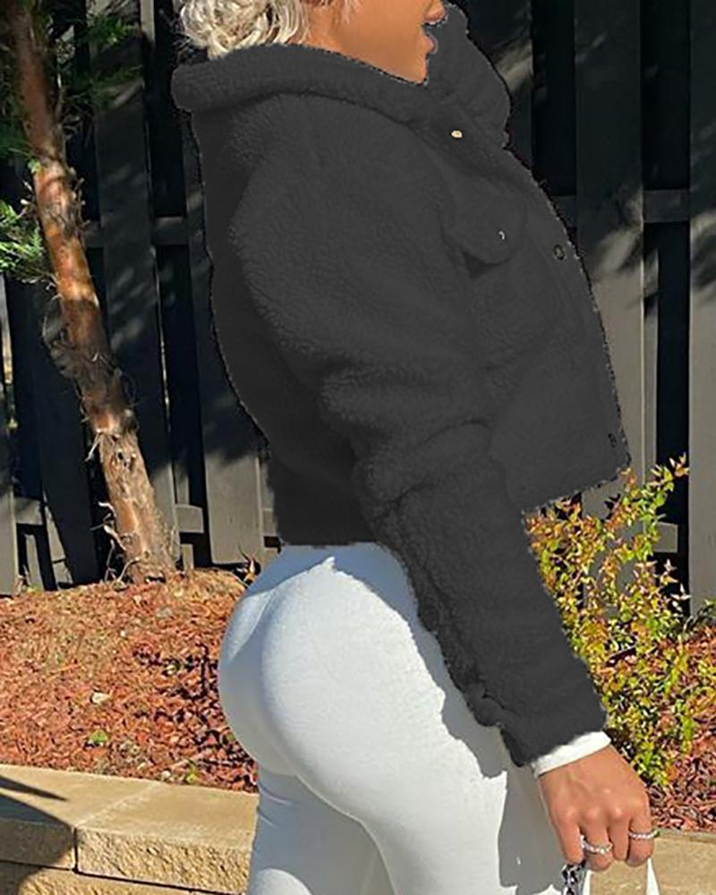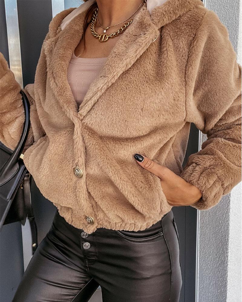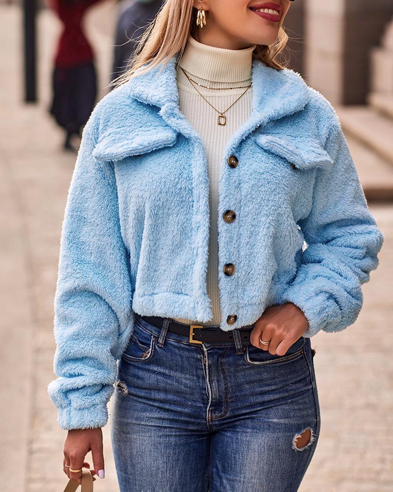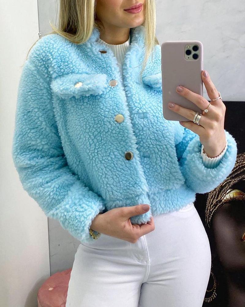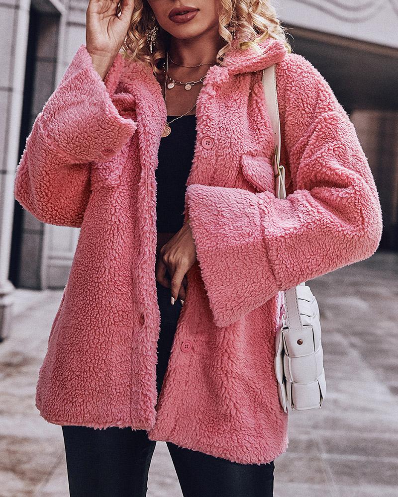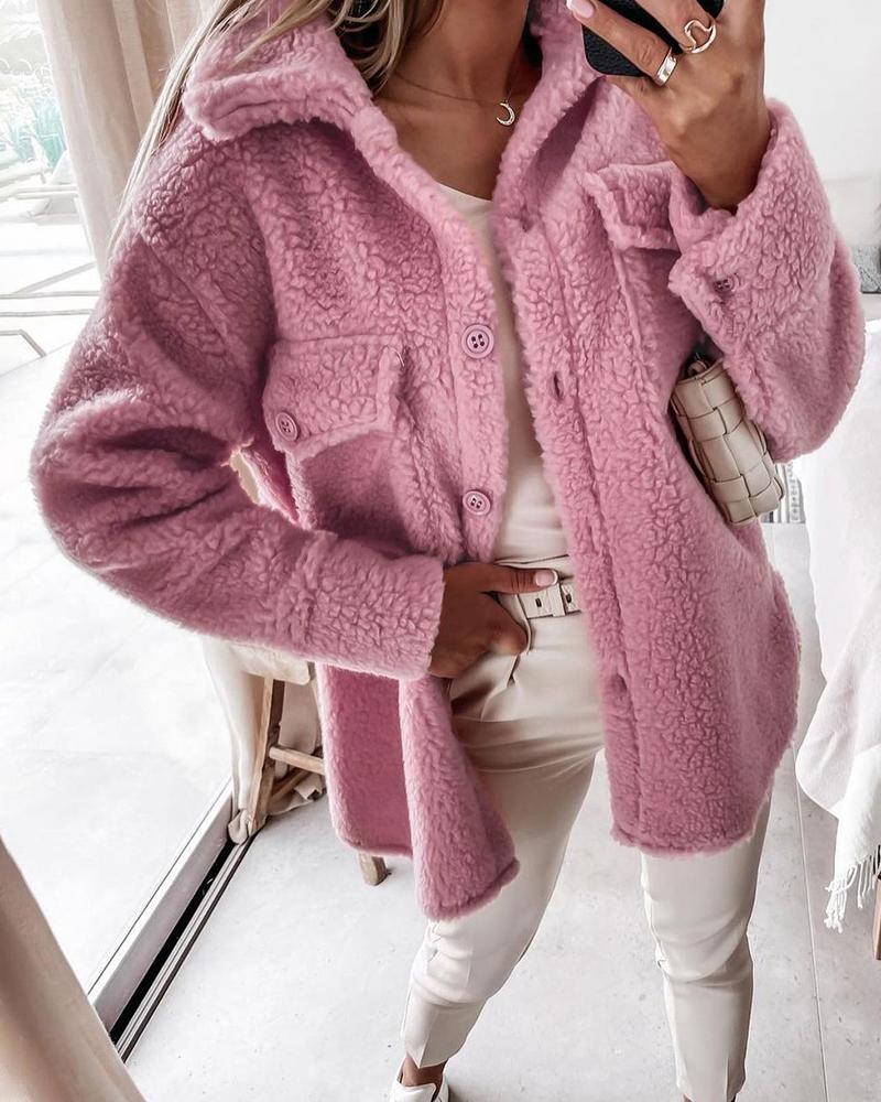 Button Pocket Decor Long Sleeve Teddy Coat |