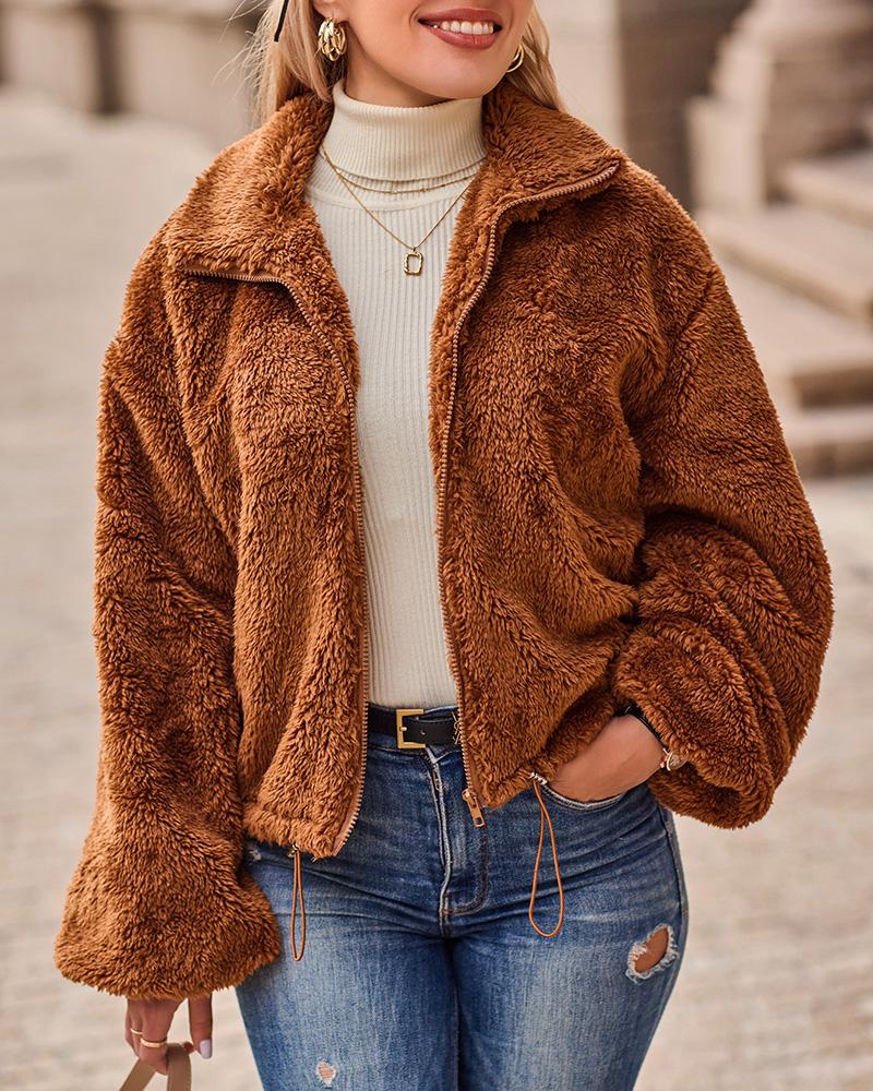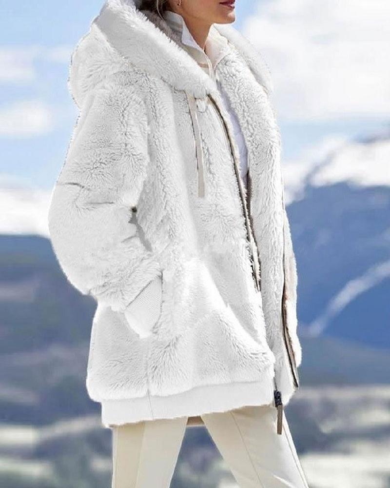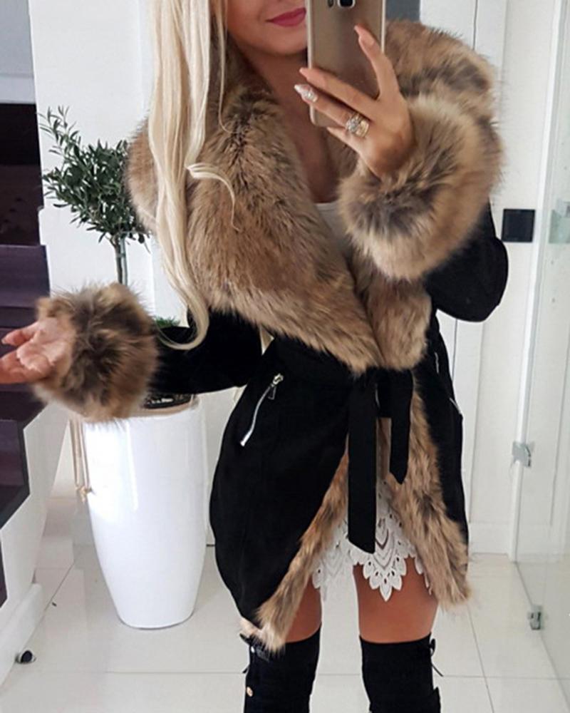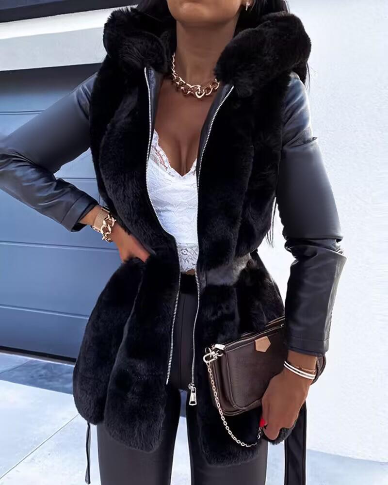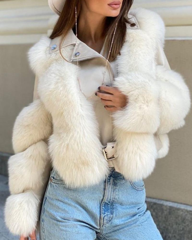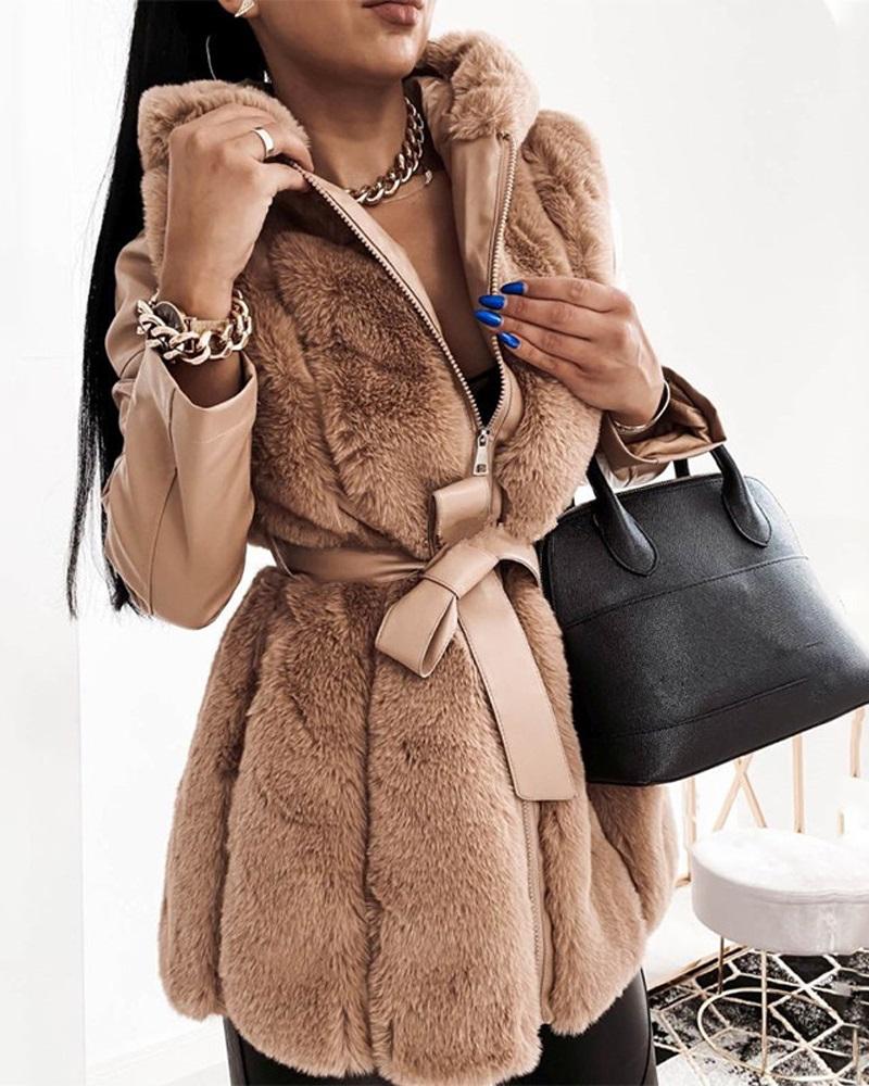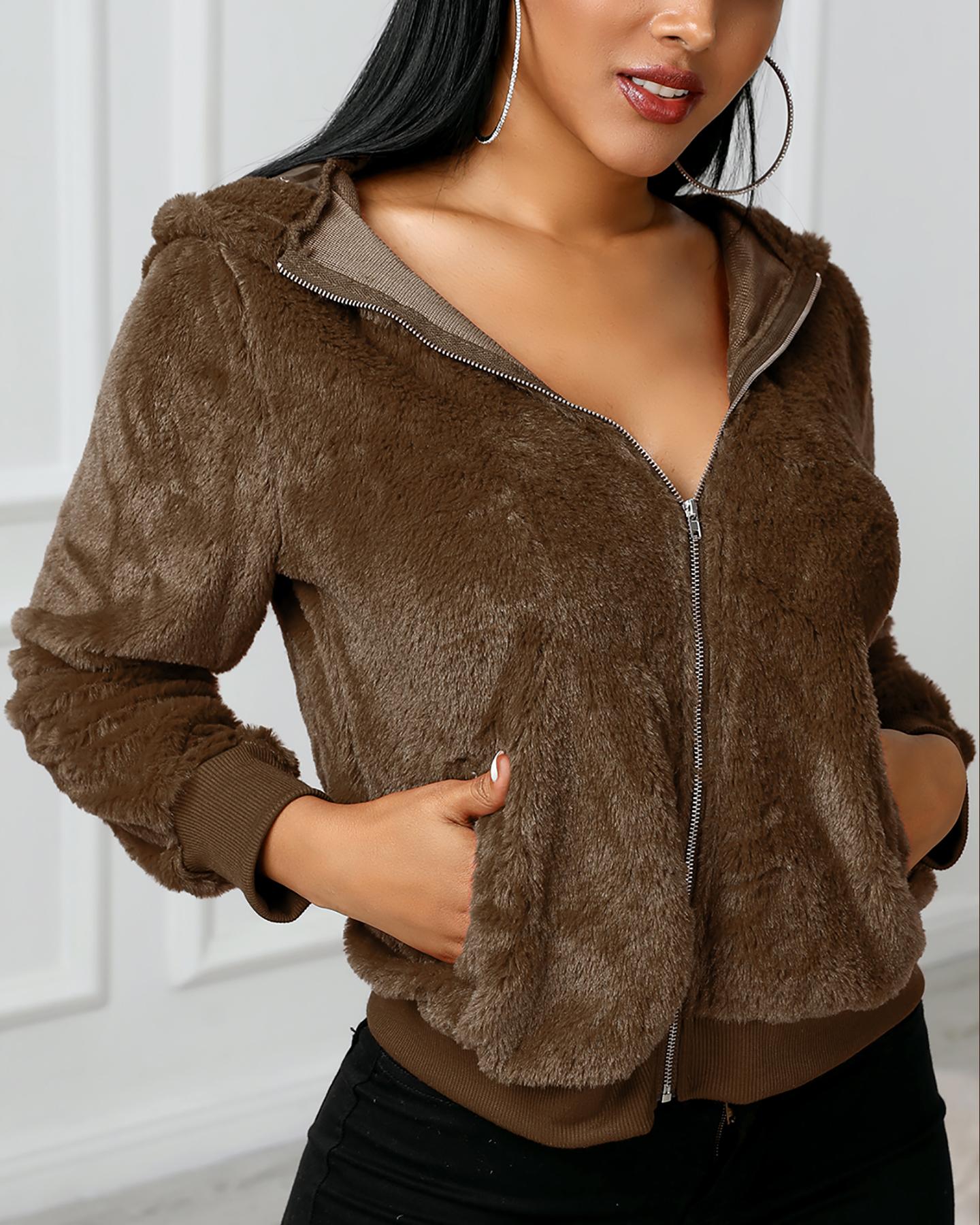 Long Sleeve Zip Front Fur Faux Fur Hooded Coat |