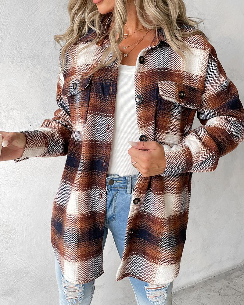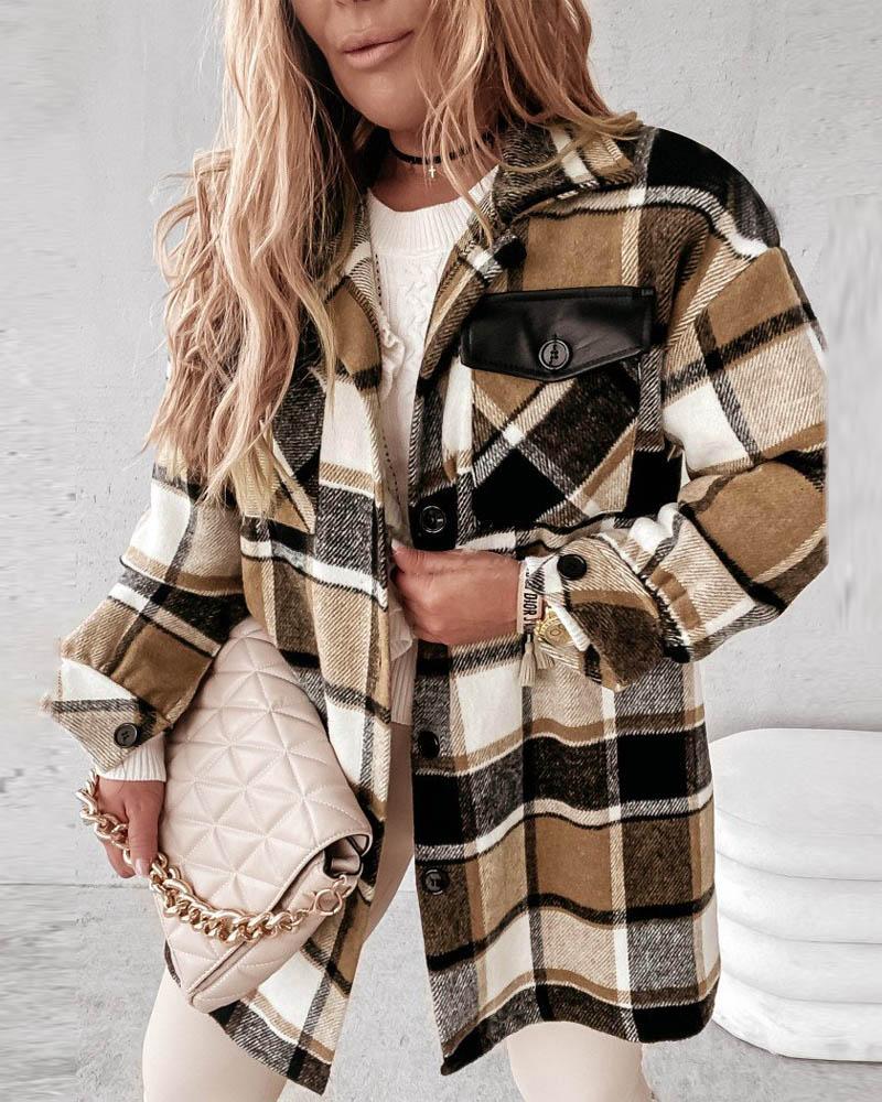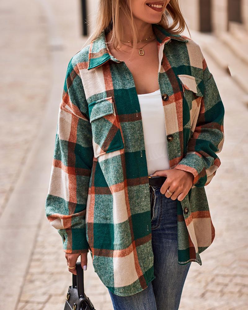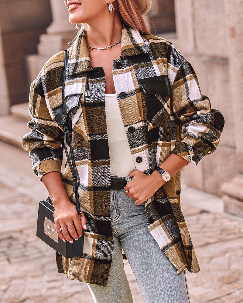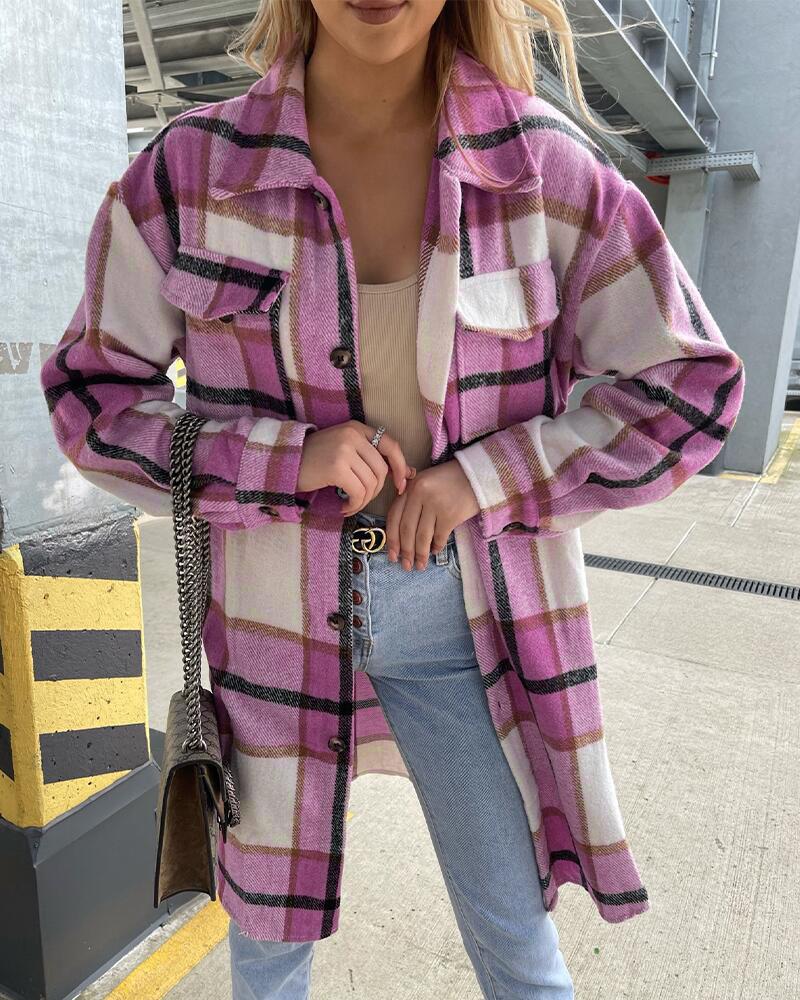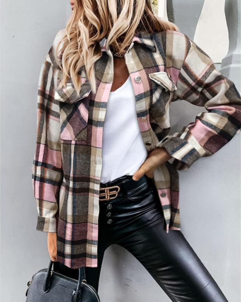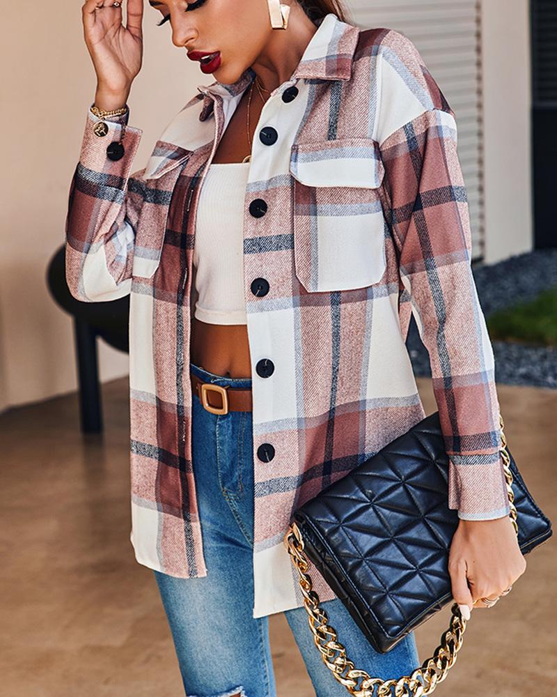 Plaid Print Button Front Long Sleeve Shacket Casual Turn-down Collar Pocket Design Coat |