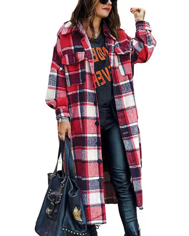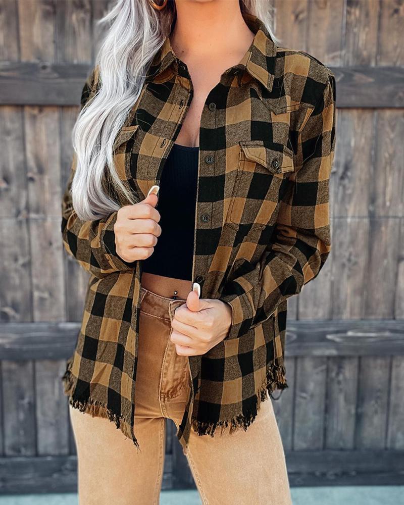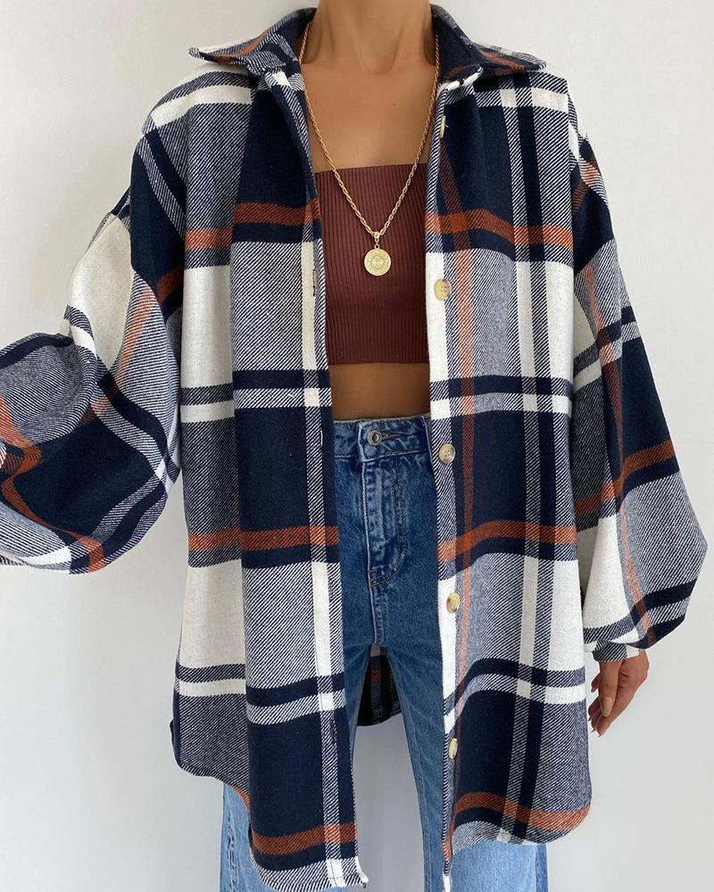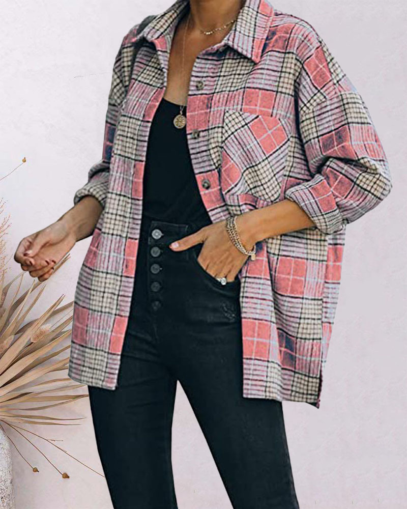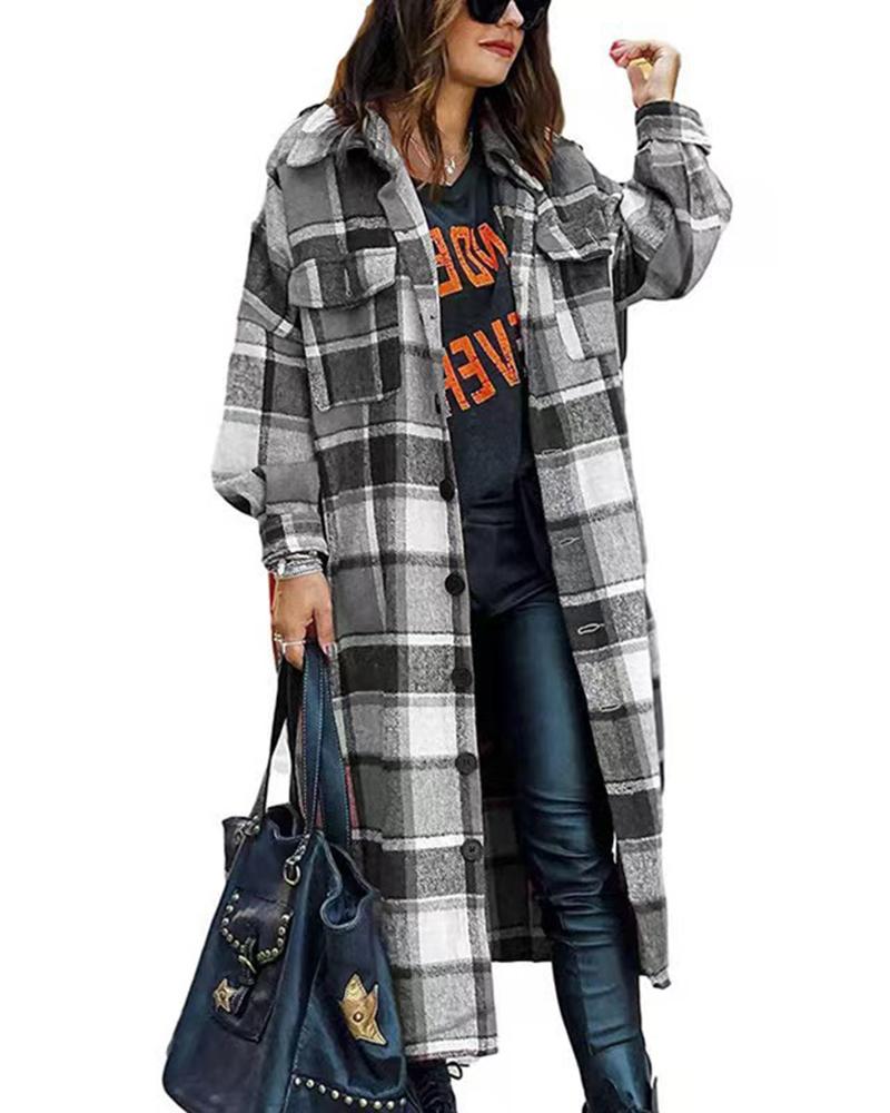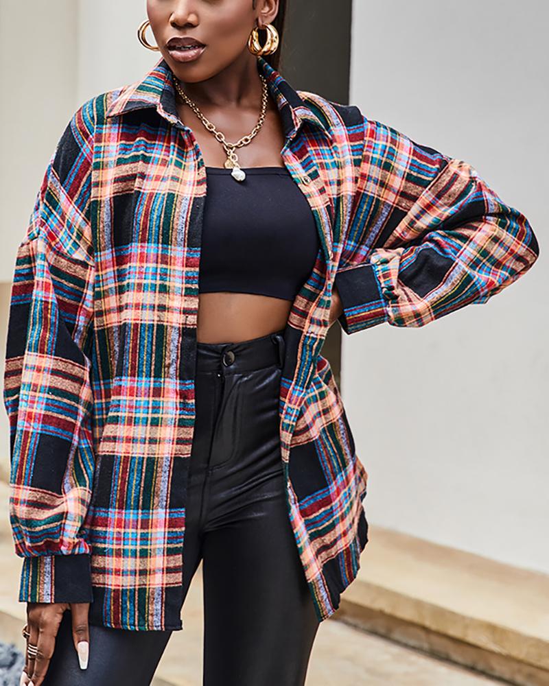 Plaid Print Button Front Long Sleeve Shacket Casual Turn-down Collar Pocket Design Coat |