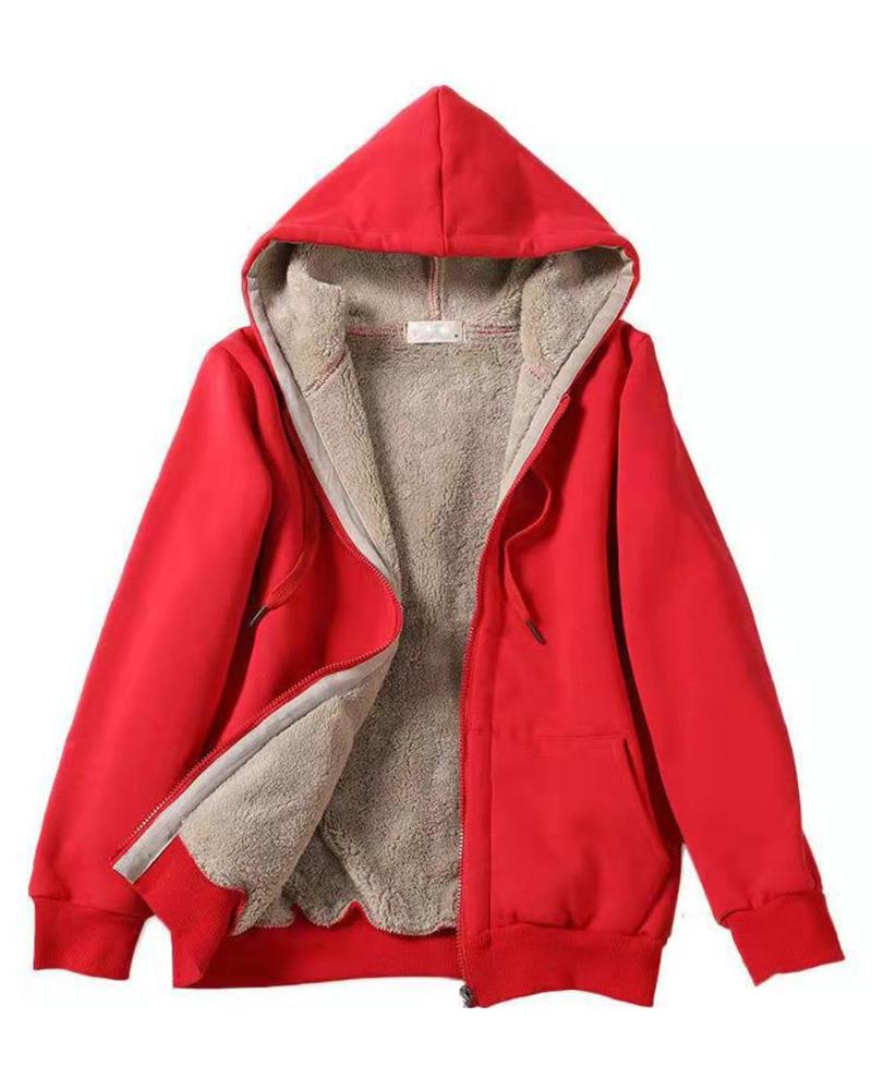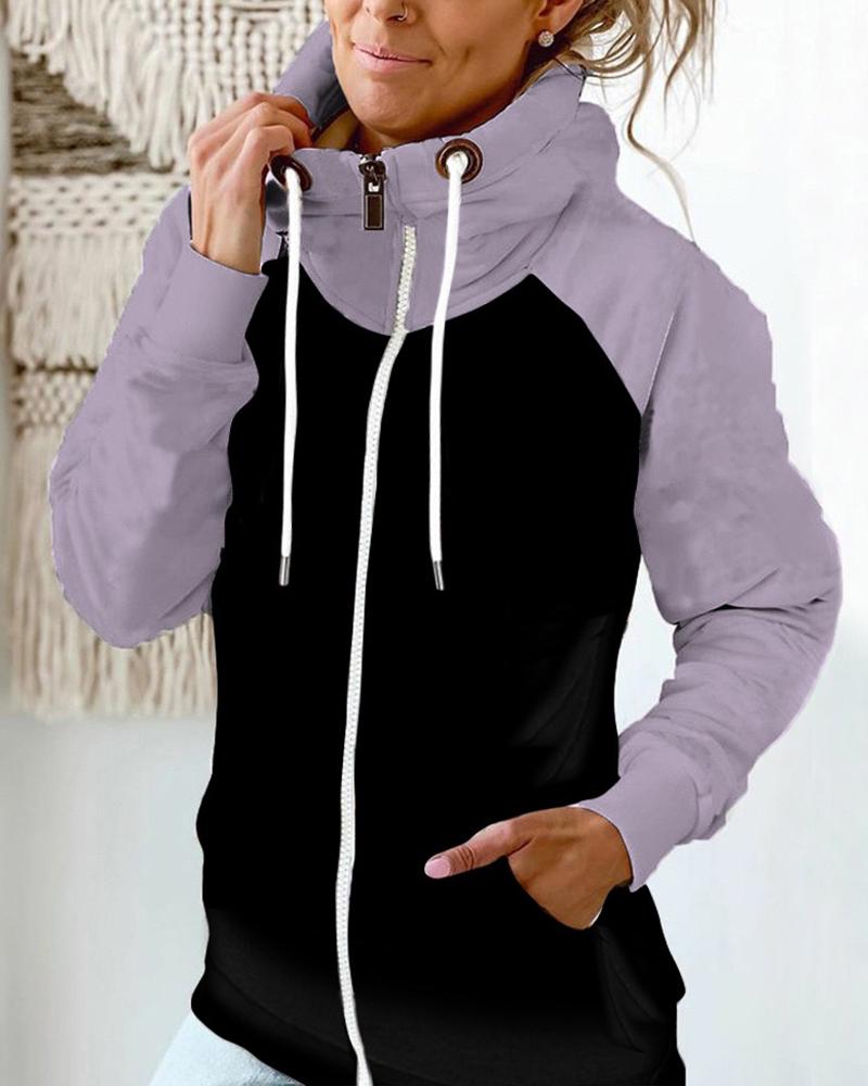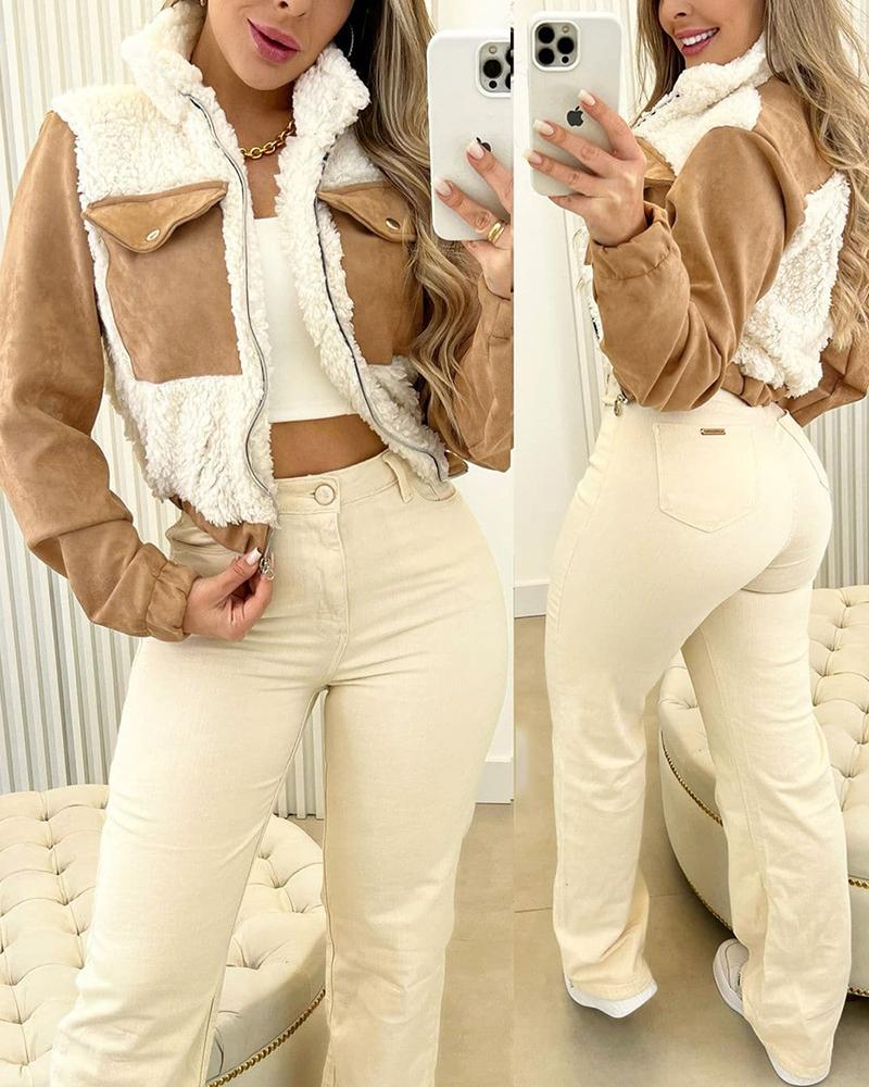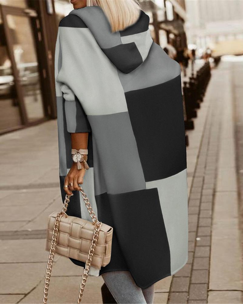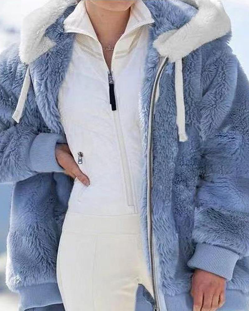 Plus Size Colorblock Long Sleeve Hooded Zip Up Teddy Coat |