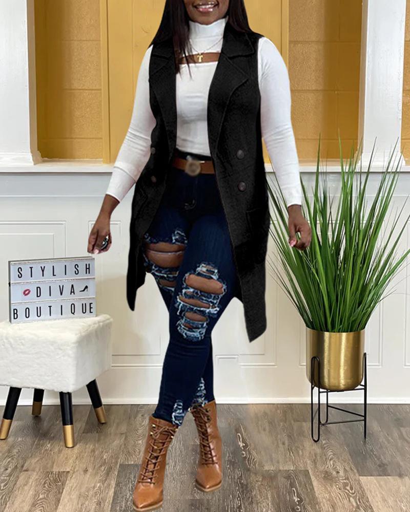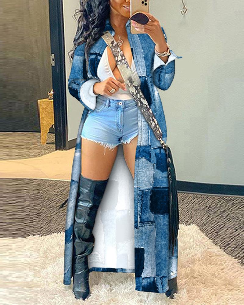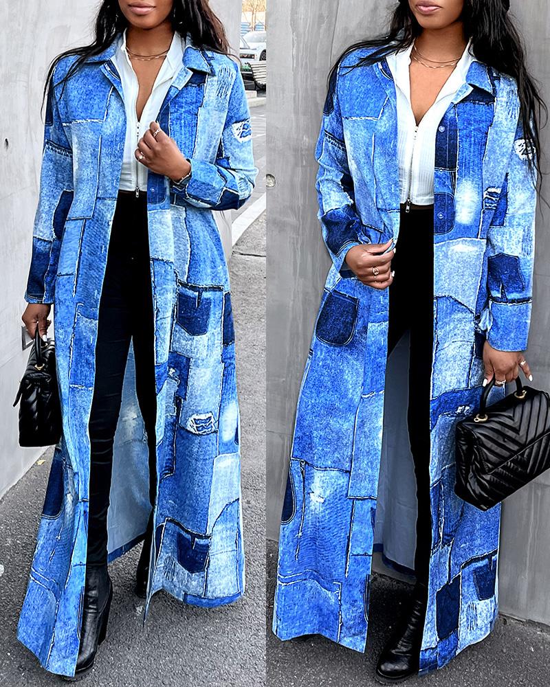 Ripped Raw Hem Button Front Longline Denim Coat |