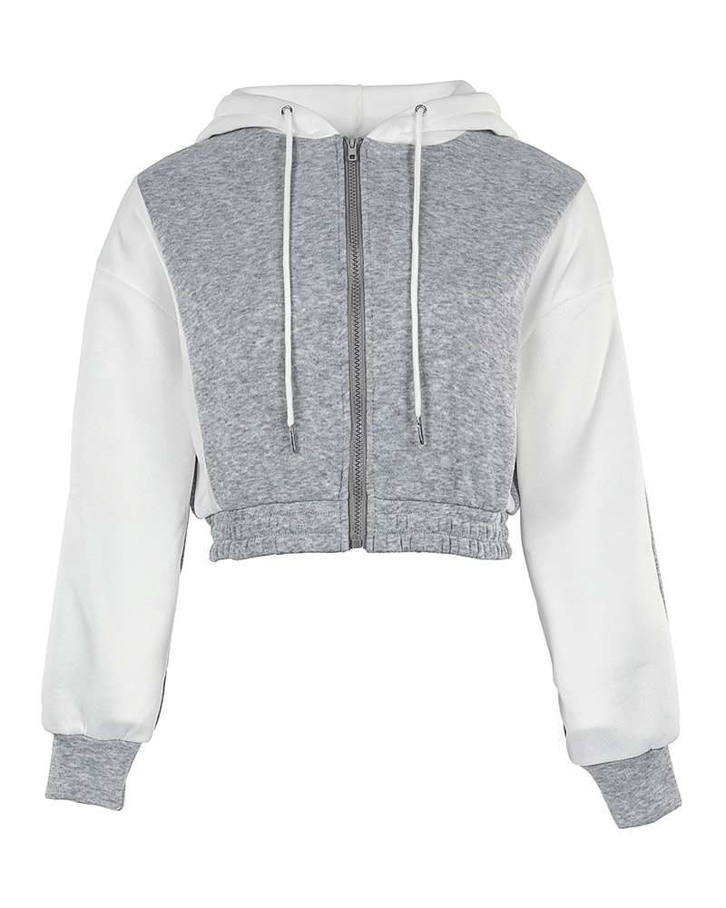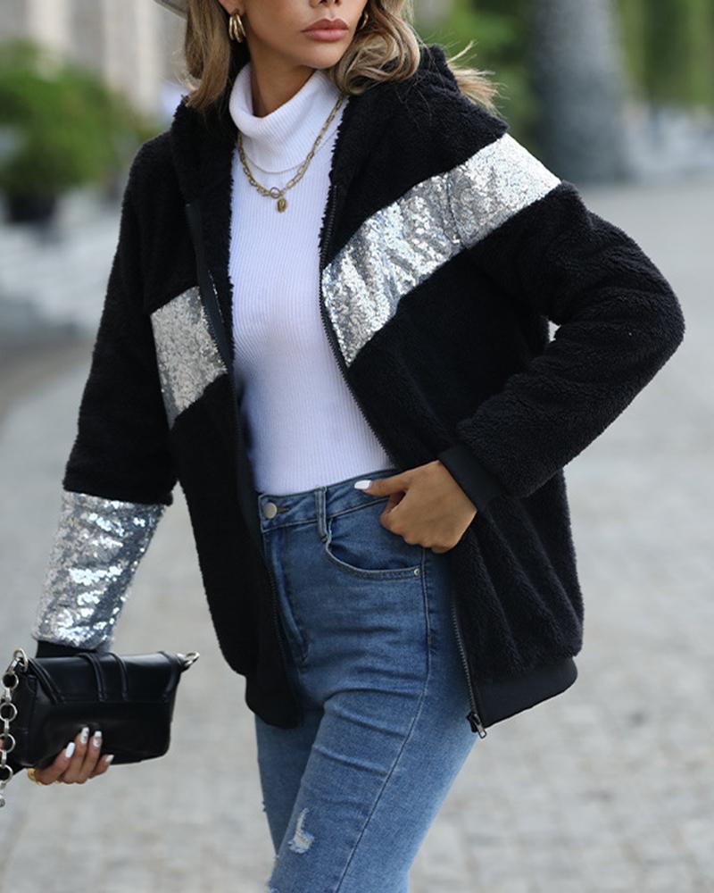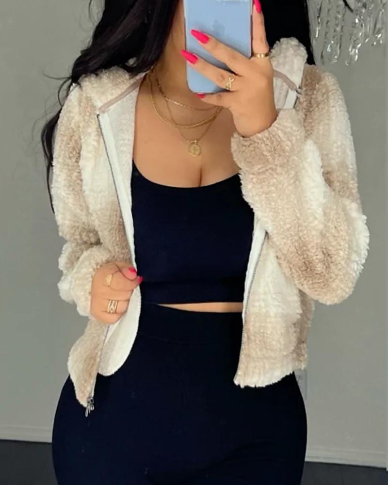 Colorblock Long Sleeve Fuzzy Hooded Zip Up Teddy Coat |