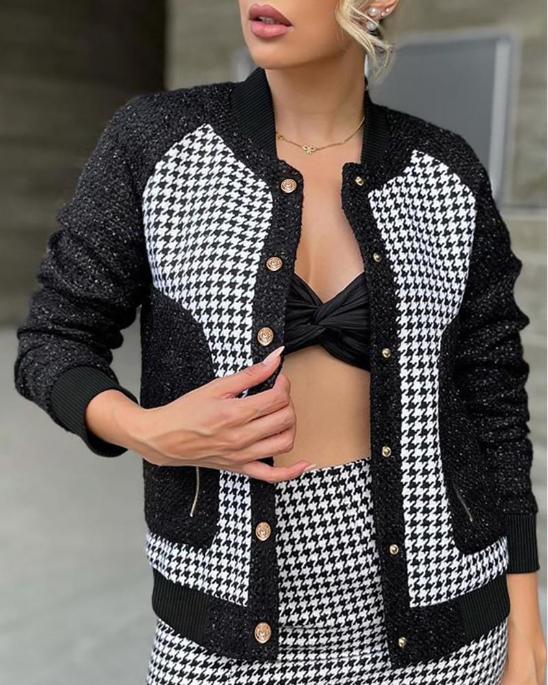 Plus Size Houndstooth Print Fuzzy Trim Double Breasted Coat |