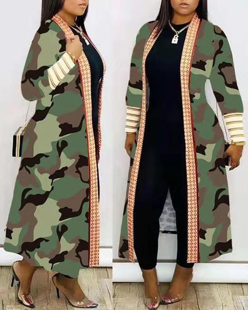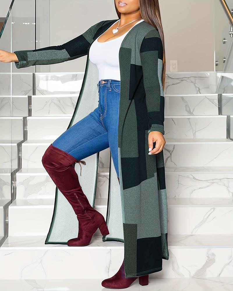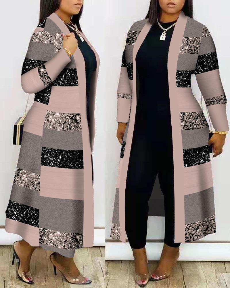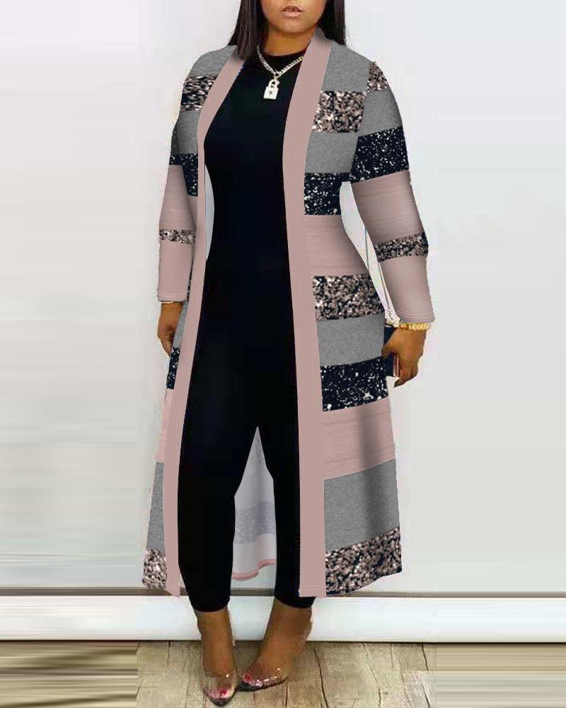 Plus Size Colorblock Striped Print Open Front Longline Coat |