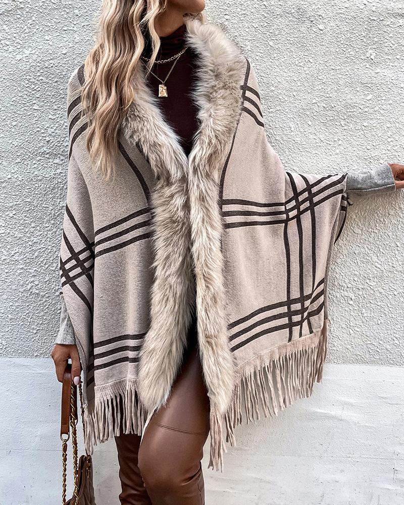 Plaid Print Tassel Design Fluffy Detail Cape Coat |