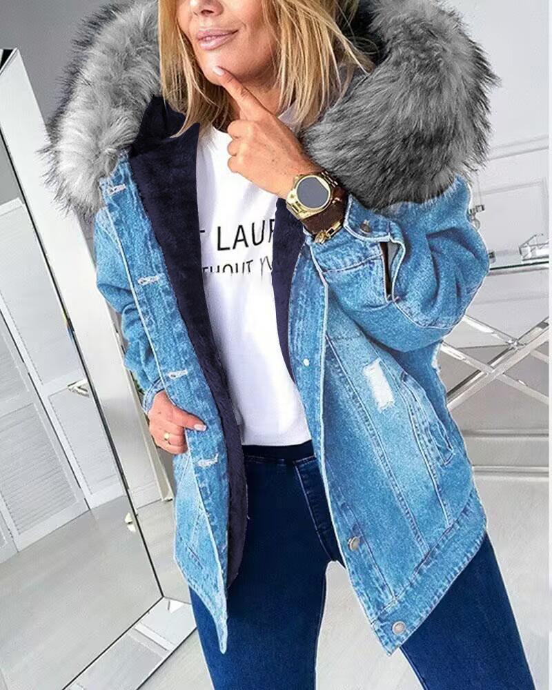 Women's Parka Daily Fall Winter Denim Coat Long Sleeve Solid Color Pocket Hooded Loose Streetwear Jacket |